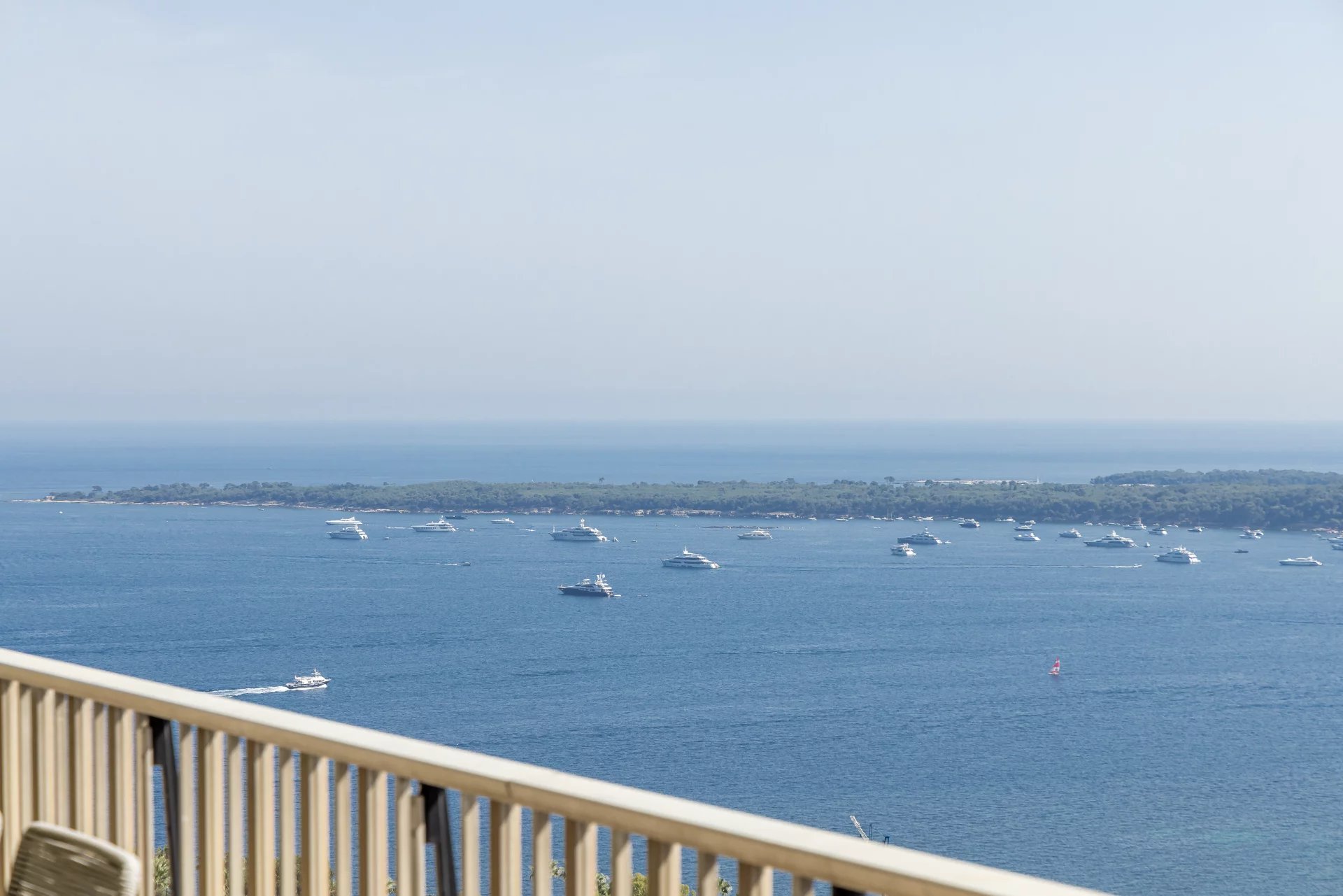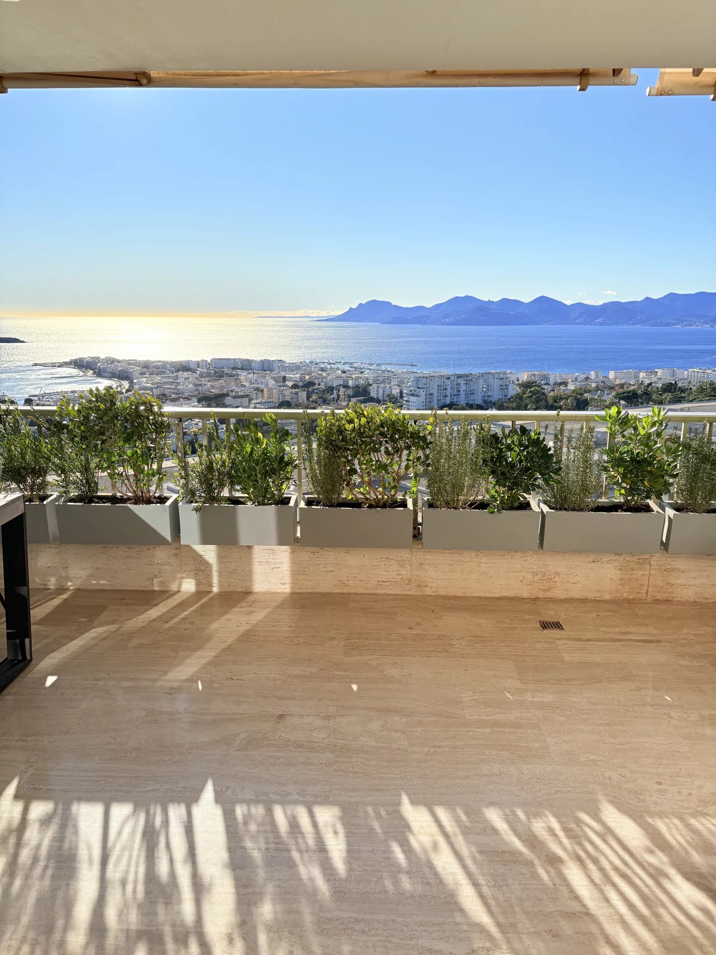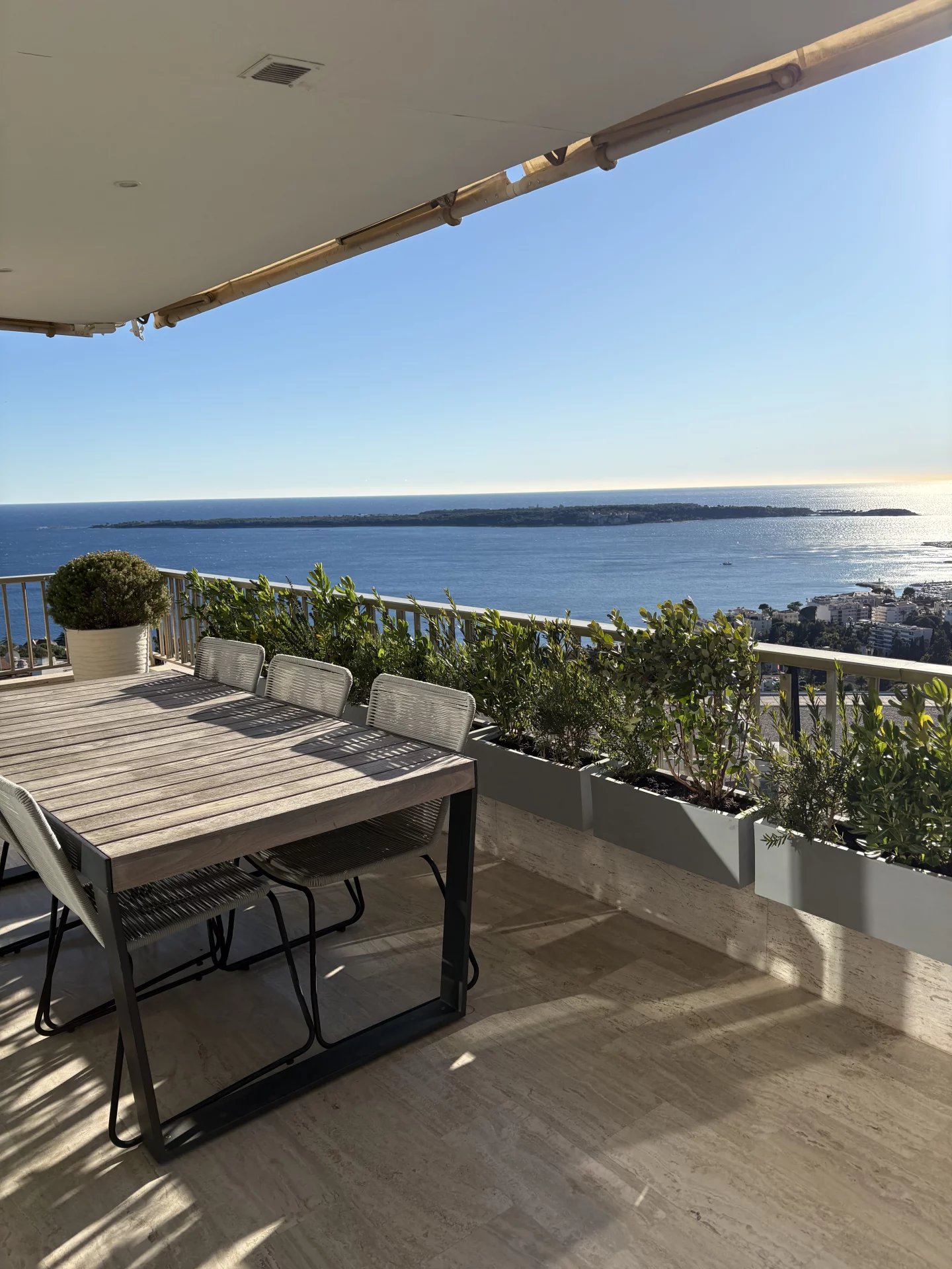 The apartment, in excellent condition, consists of a spacious and bright living room that opens onto a 33 sqm corner terrace, offering a breathtaking panoramic view of the Mediterranean Sea and the Lérins Islands. The separate, modern, and fully equipped kitchen will delight gastronomy enthusiasts.