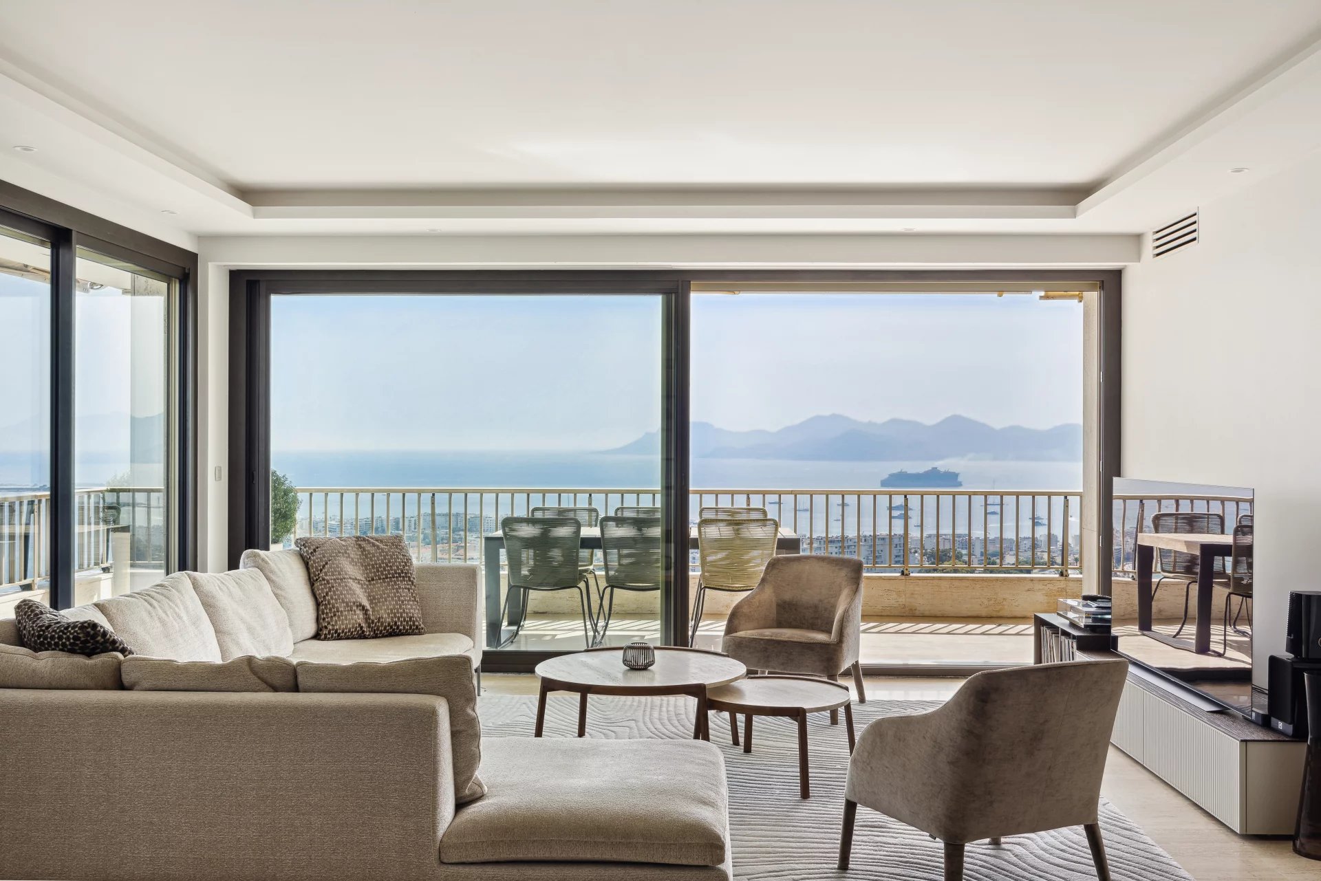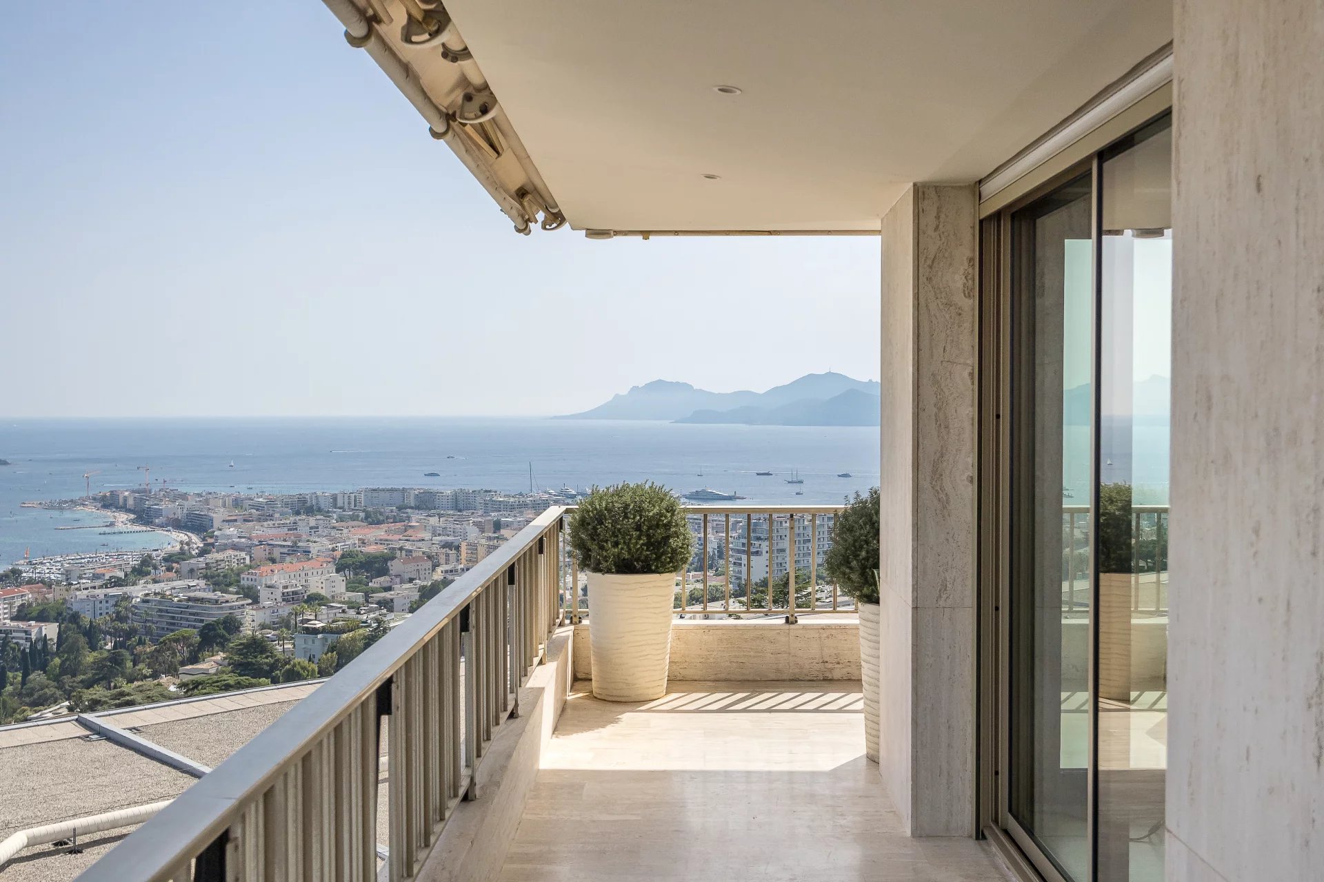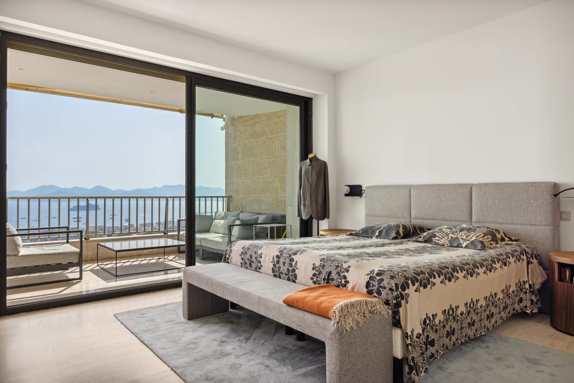 The apartment, in excellent condition, consists of a spacious and bright living room that opens onto a 33 sqm corner terrace, offering a breathtaking panoramic view of the Mediterranean Sea and the Lérins Islands. The separate, modern, and fully equipped kitchen will delight gastronomy enthusiasts.