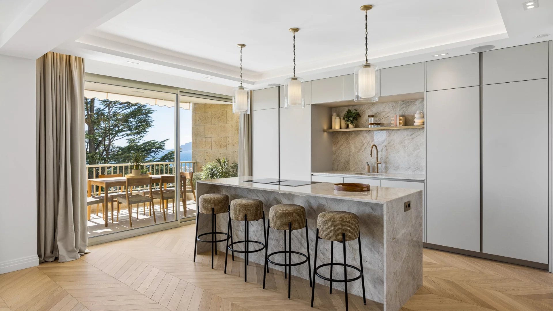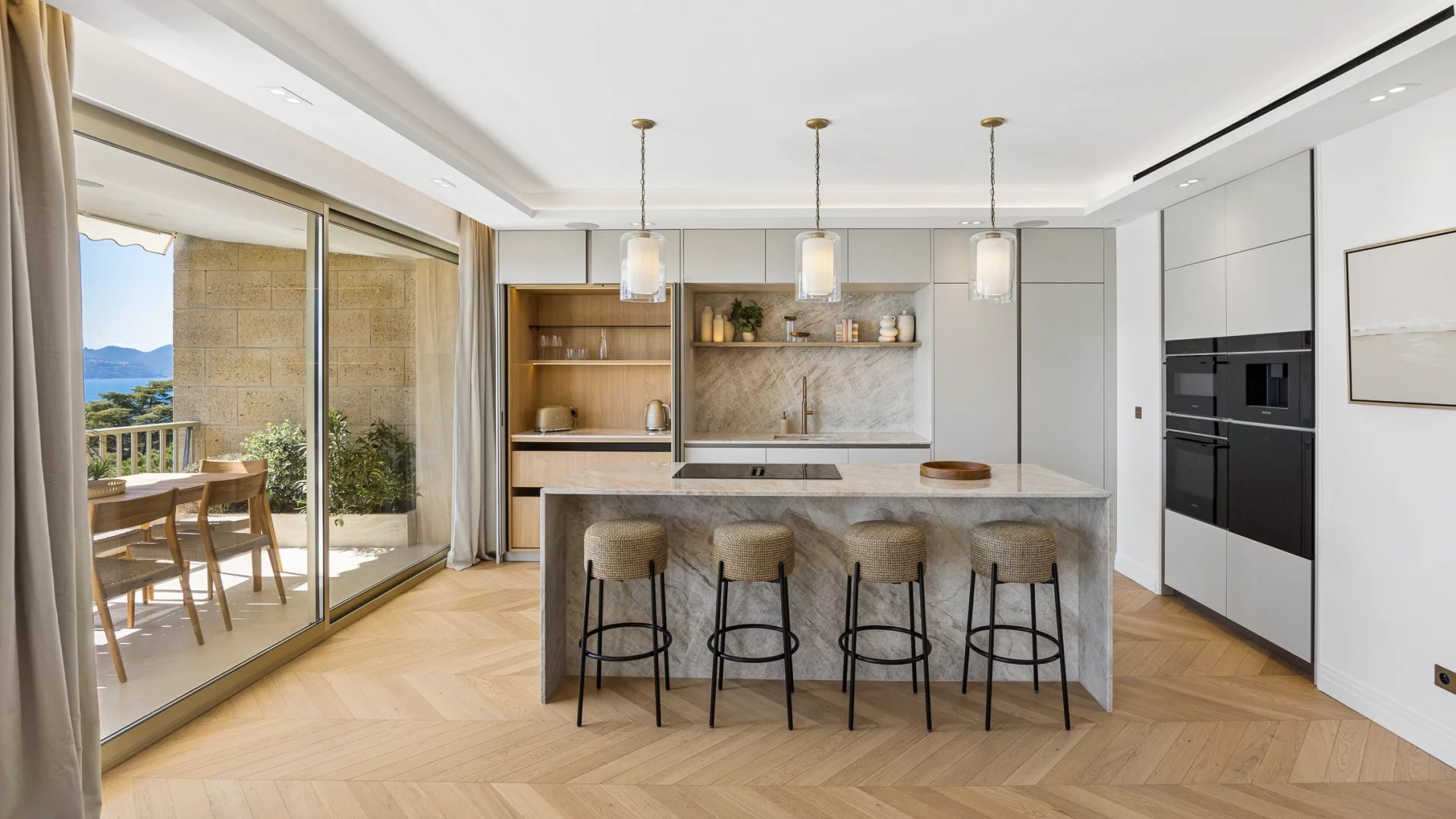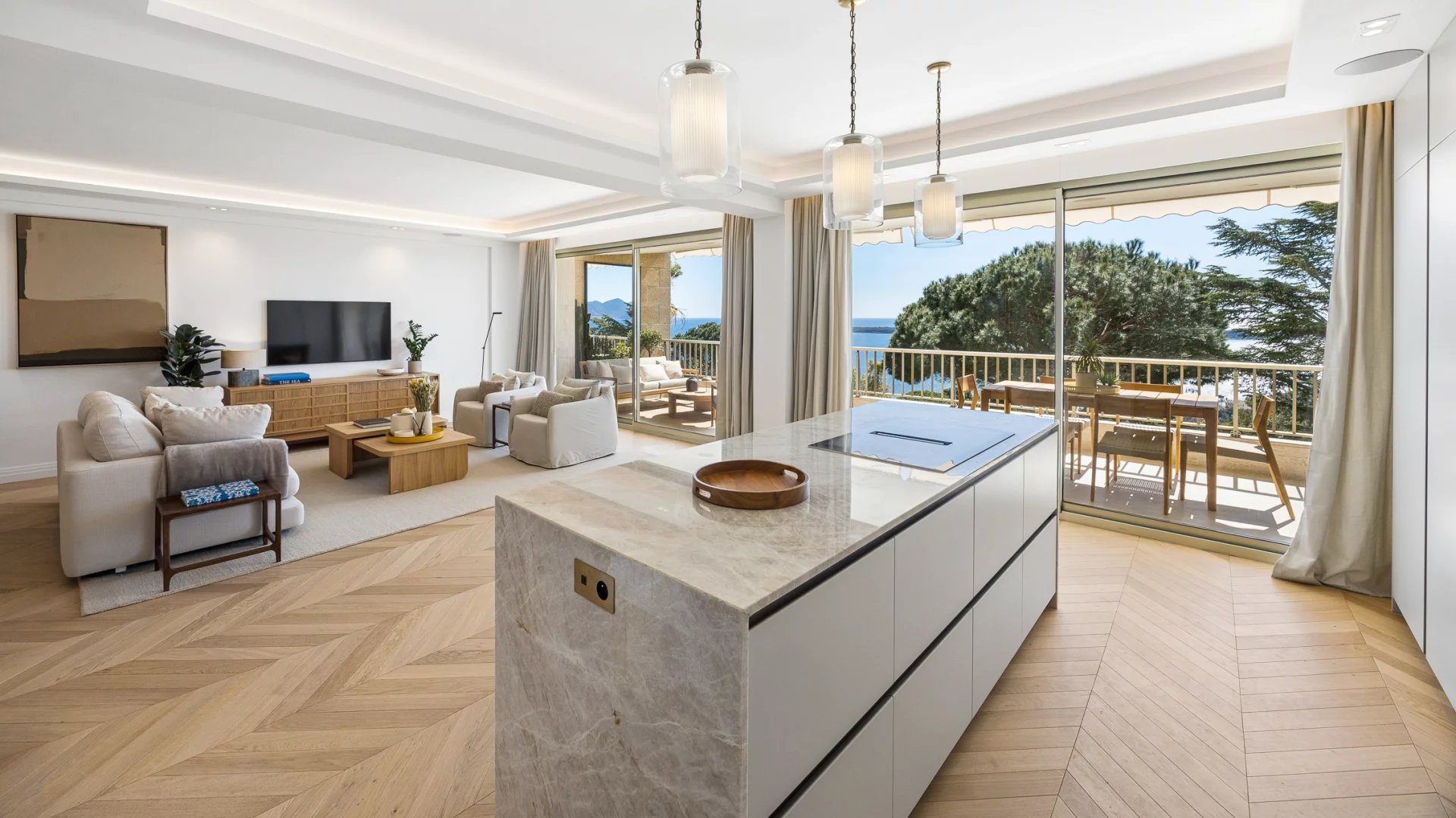 Learn moreThe apartment consists of a spacious and bright living room, an open kitchen equipped with a large modern central island, perfect for social gatherings. The terrace provides a breathtaking panoramic view of the sea and the estate's park, a true haven of peace.