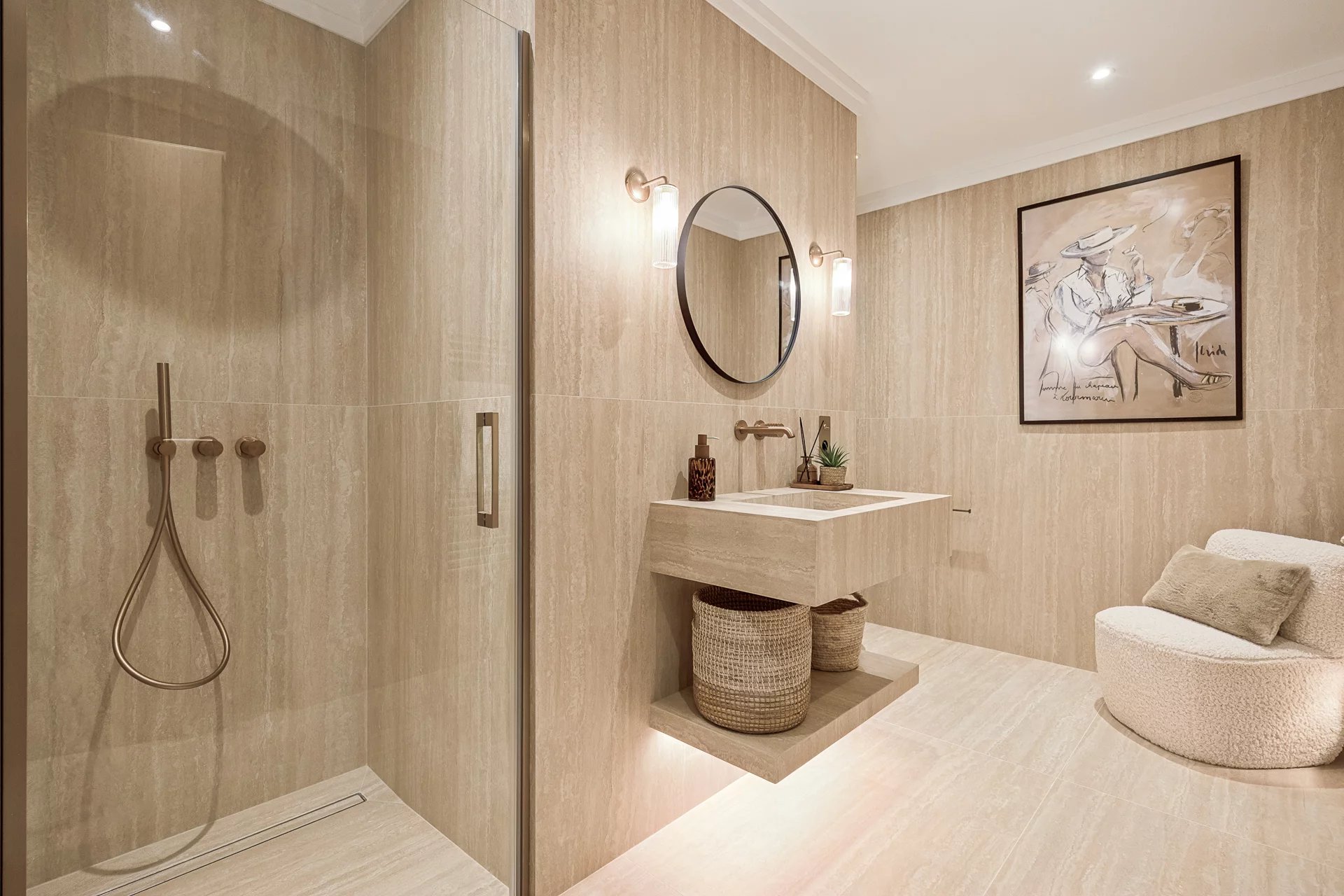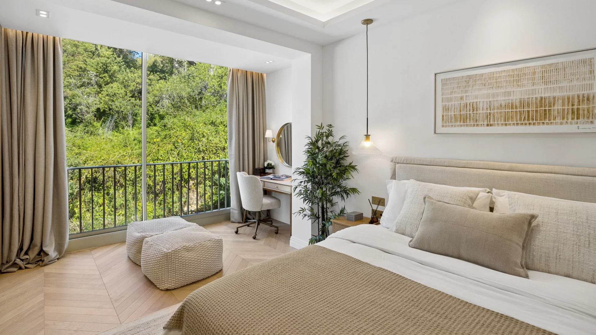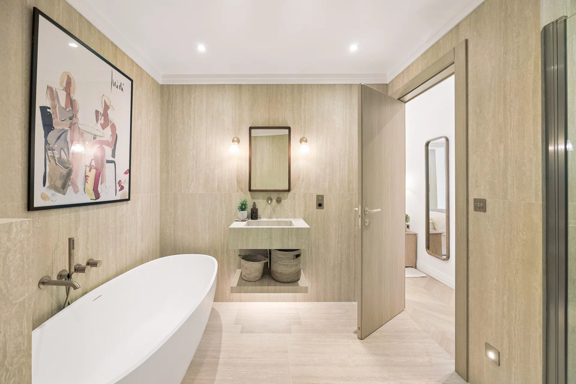 The two large en-suite bedrooms with private bathrooms are designed for optimal comfort. The high-end features of this property include solid wood flooring, natural stones, and a contemporary style that will appeal to luxury enthusiasts.