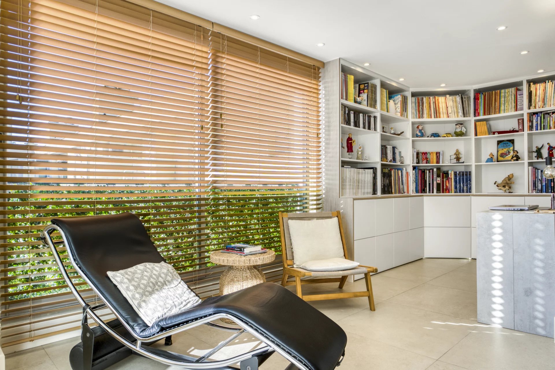 The apartment is in perfect condition and comprises two bedrooms, a living room with a modern open-plan kitchen, a reading area with a library that can easily be converted into a dining room for convivial meals.