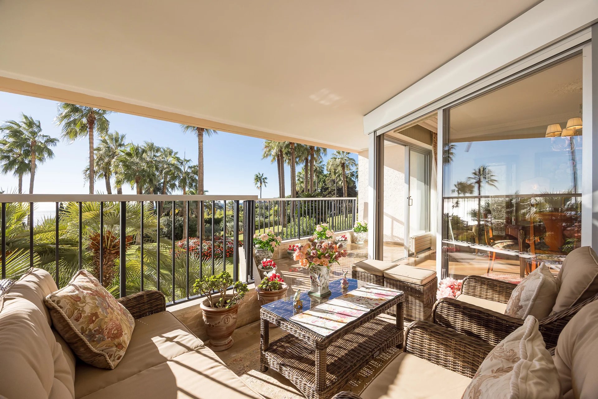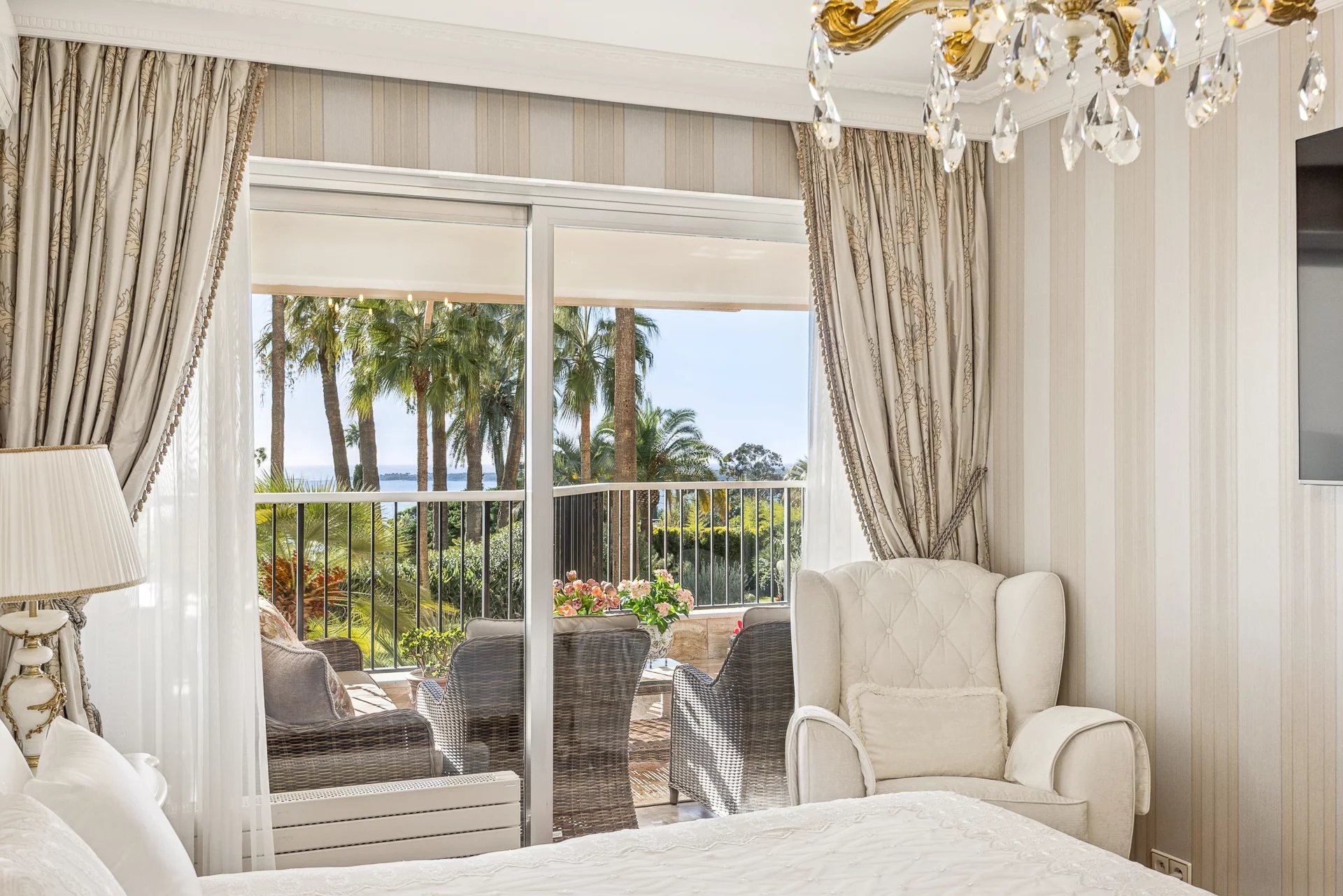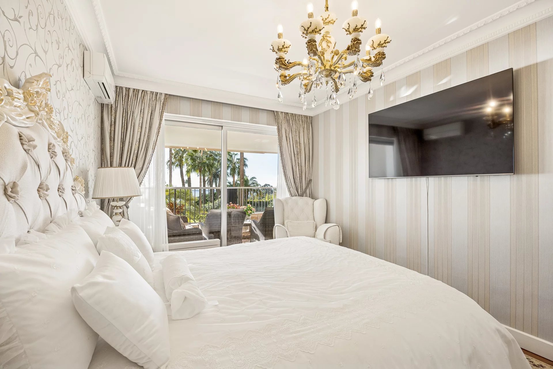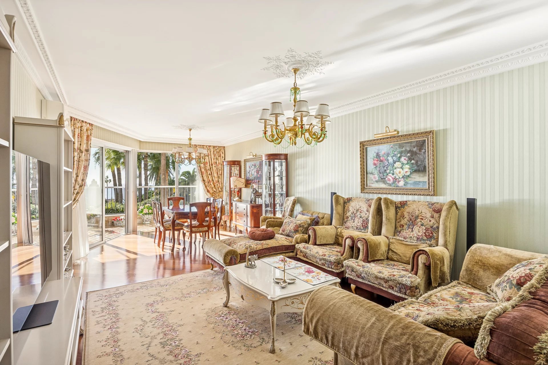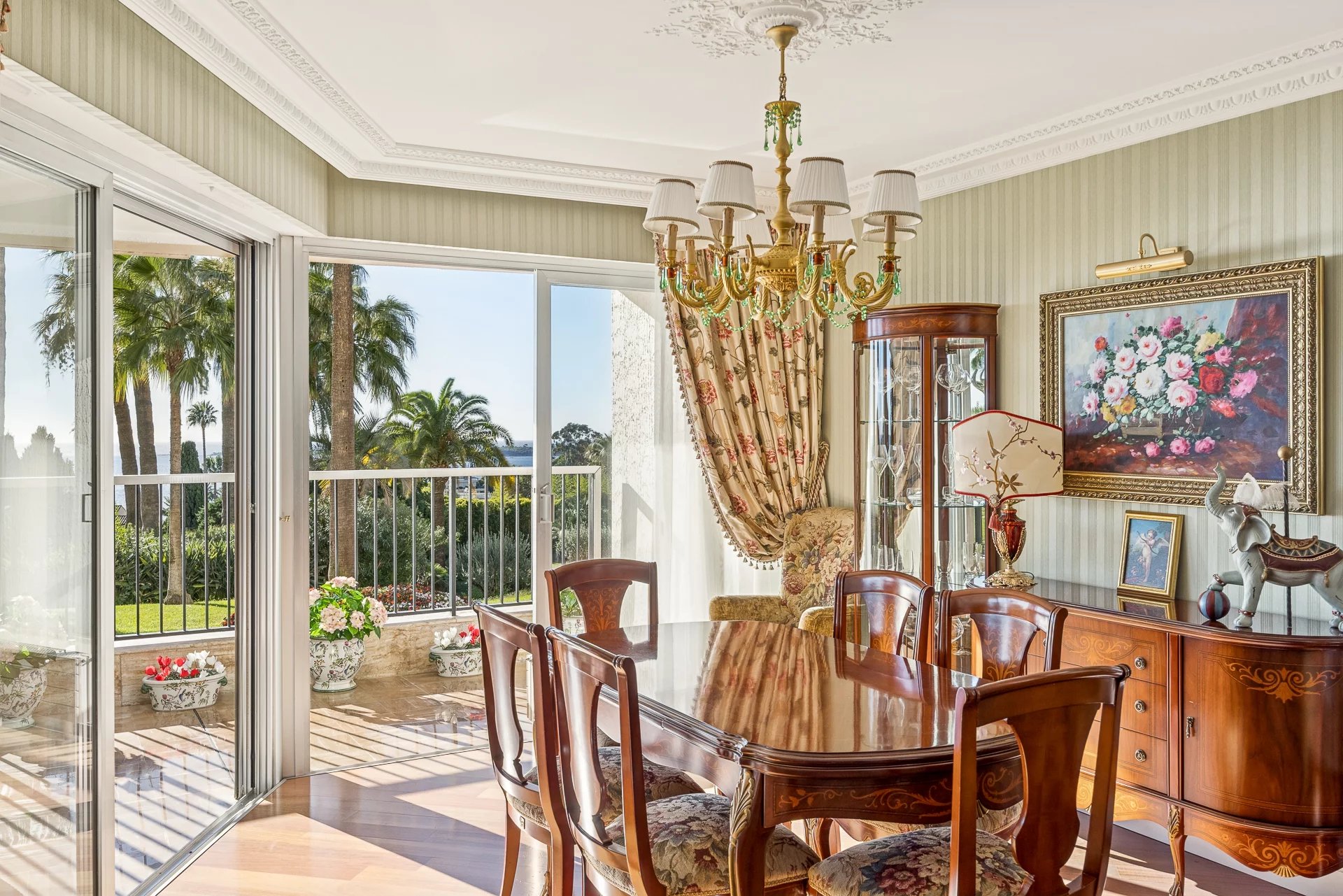 Spanning approximately 115 sqm, this apartment stands out for its elegant Belle Époque-style decoration. Bright and spacious, the large living room opens onto a sunny terrace, offering breathtaking views of the sea and the park, all without vis-à-vis. The separate, fully equipped kitchen is ideal for gourmet enthusiasts.