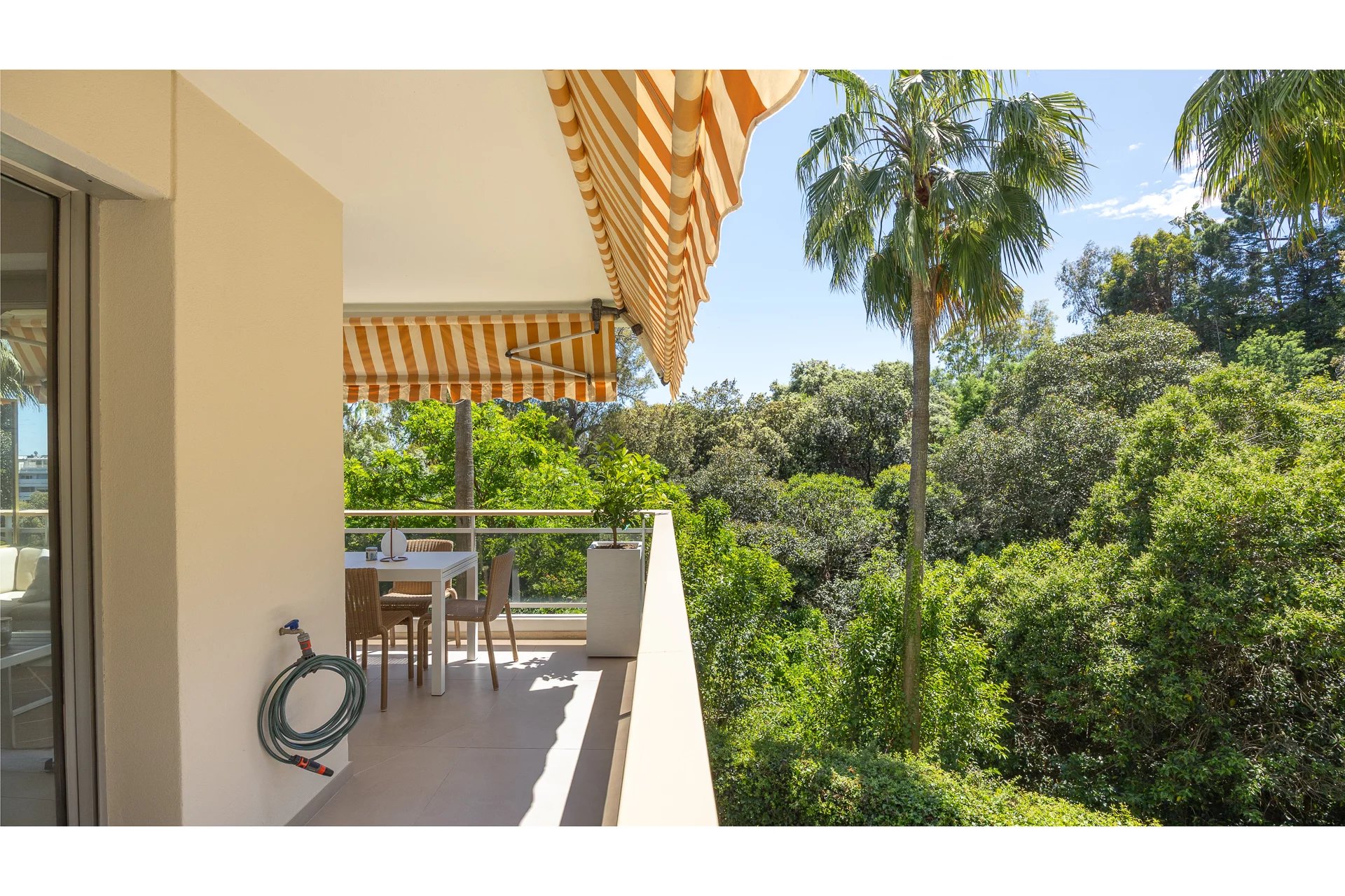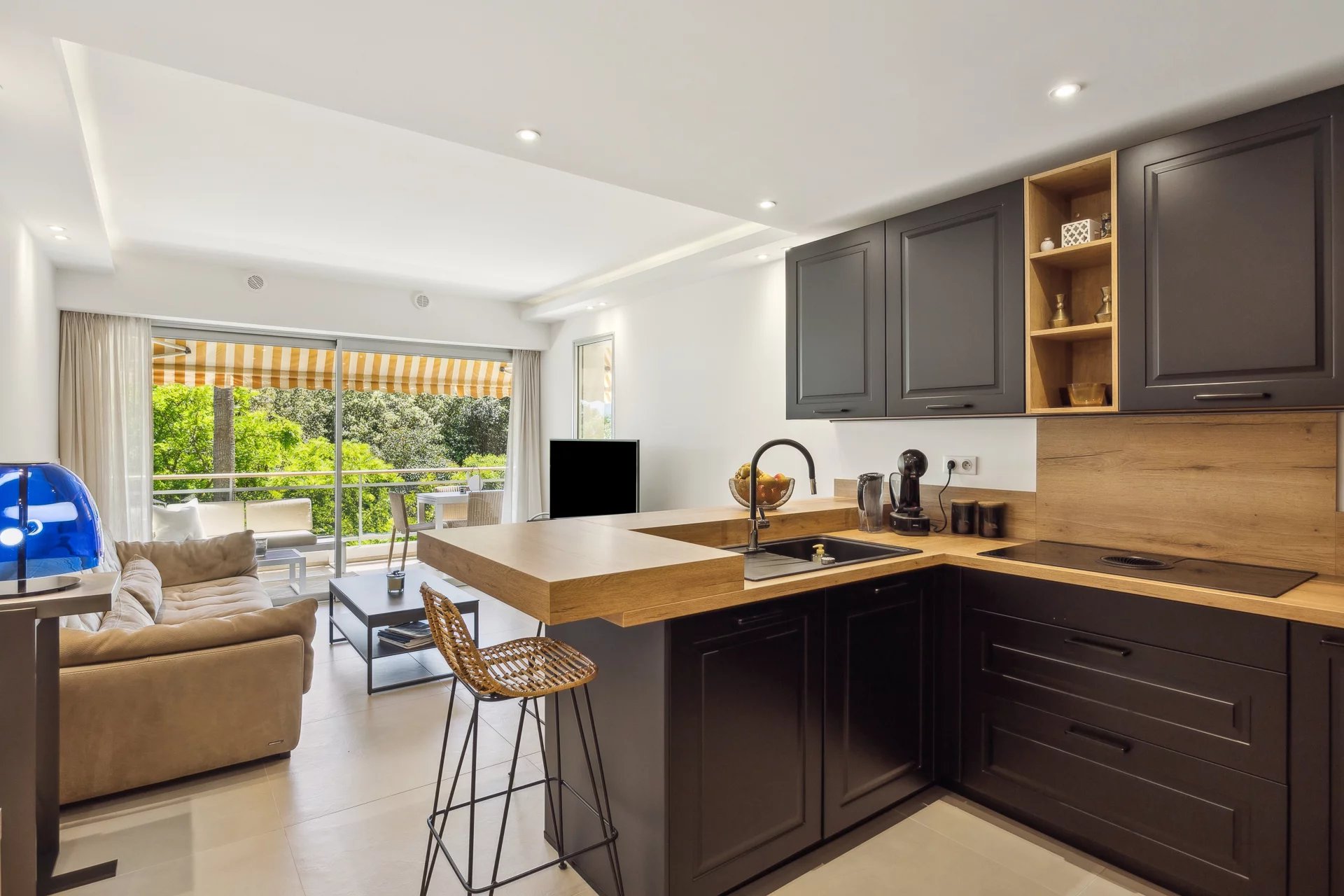 The apartment, entirely refurbished in 2023 consists of a spacious and bright living room opening onto a corner terrace offering a clear view of the sea and the park, ideal for enjoying the gentle rays of the Mediterranean sun. The open-plan kitchen, modern and fully equipped, combines functionality and aesthetics.