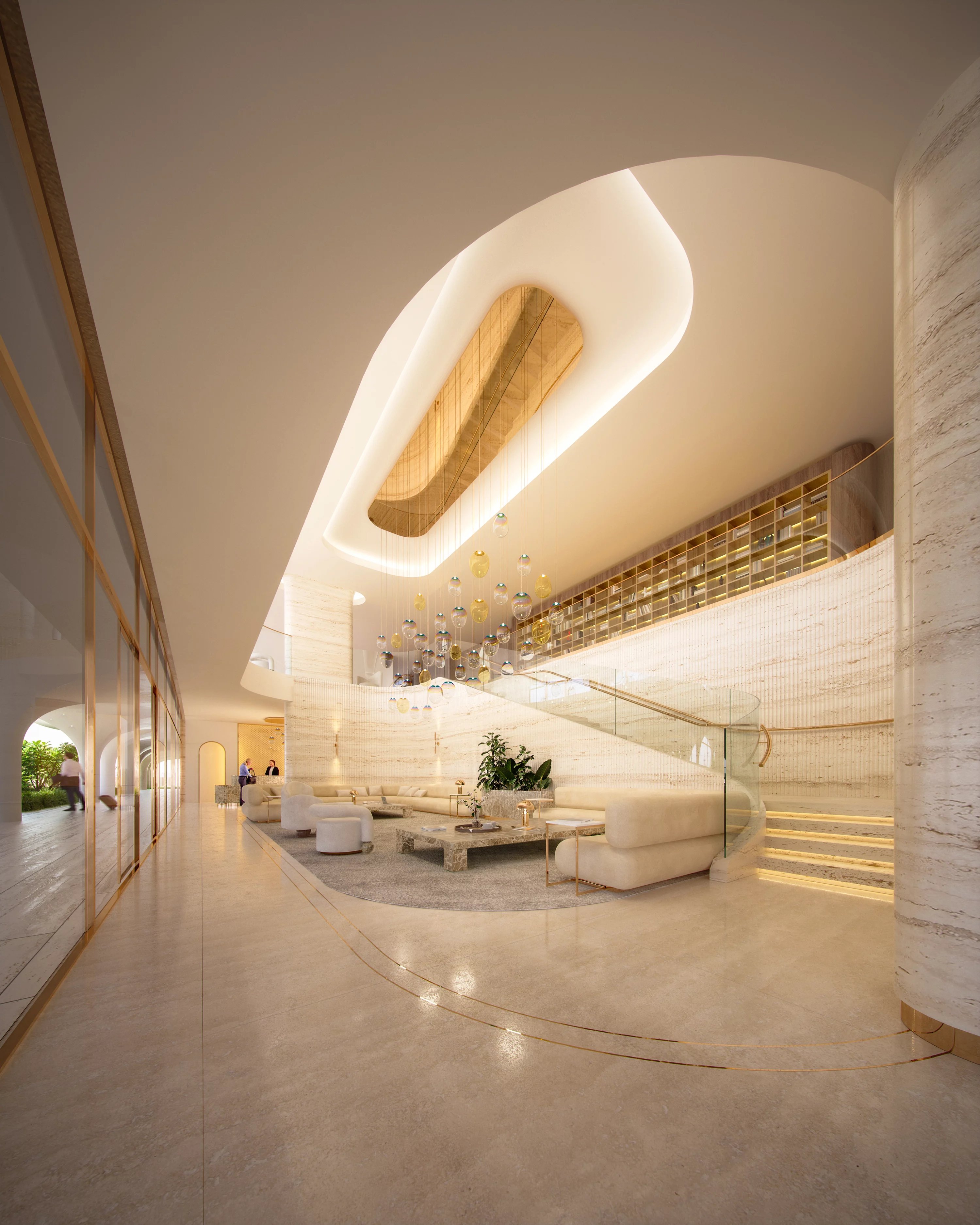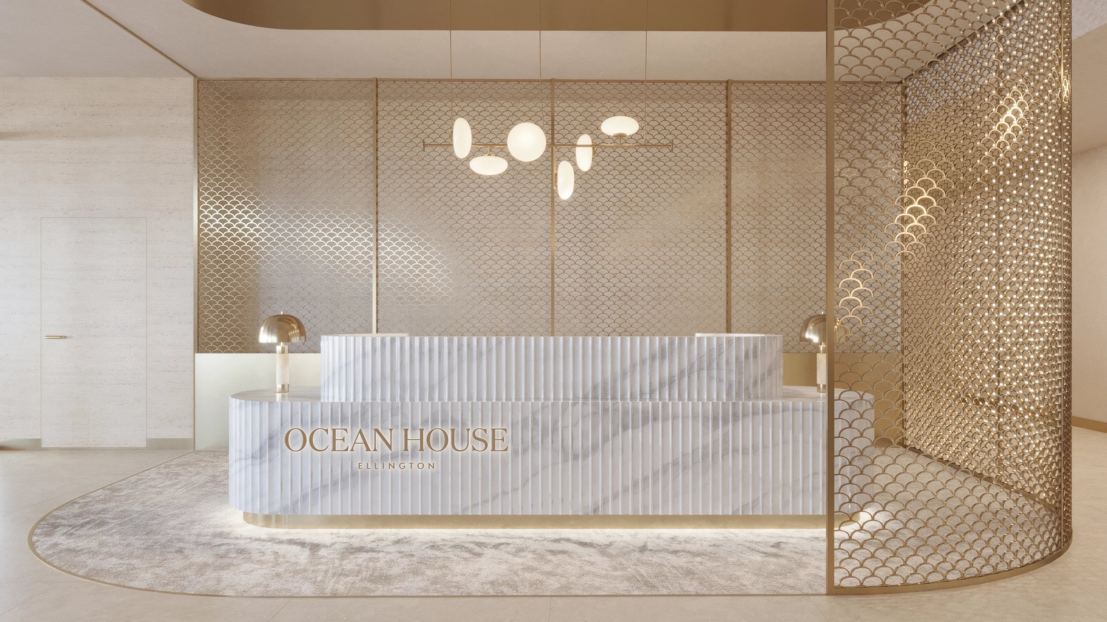 With a unique architectural style, the entrance to Ocean House is unique. Residents arrive to a striking double-height lobby with a hotel-style arrival and departure experience. Spanning two levels, the space is anchored by a beautifully carved stone reception desk and opens into a refined lounge alongside private co-working areas. A sculptural wooden staircase leads to the first floor, where an art gallery and a terrace with sweeping skyline views await. This level also provides discreet access to the property’s exclusive spa and salt caves, reached through a softly curved corridor finished in natural stone.