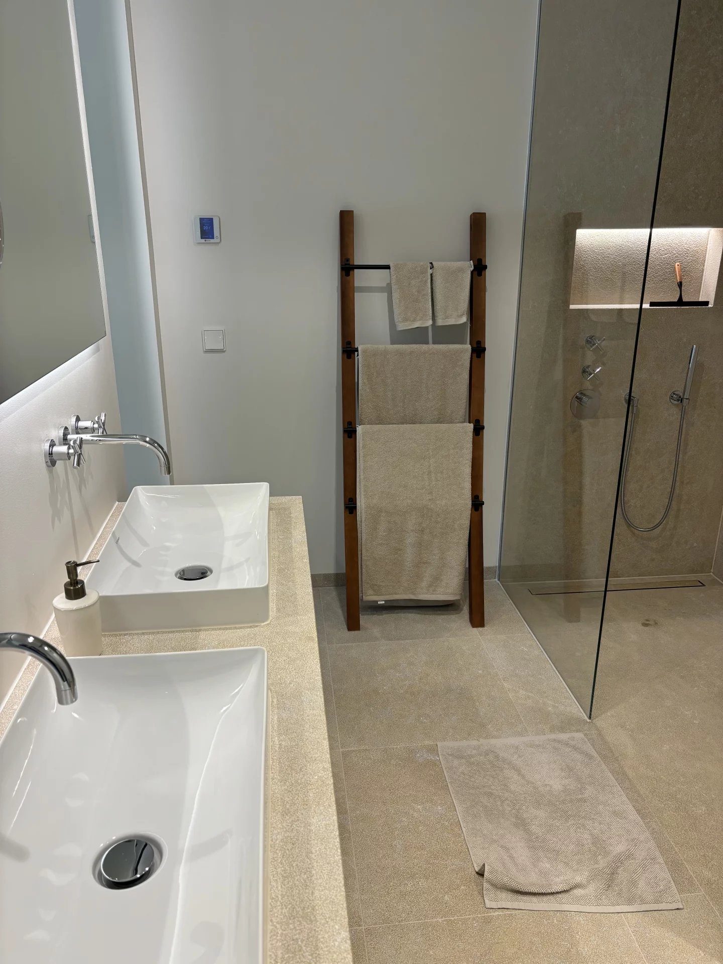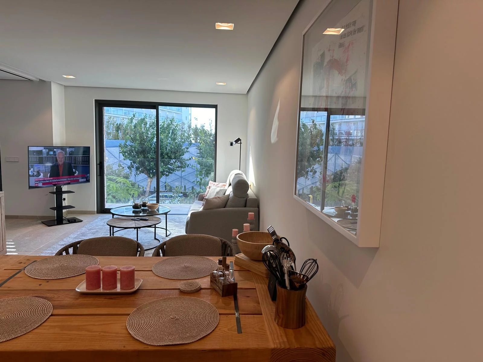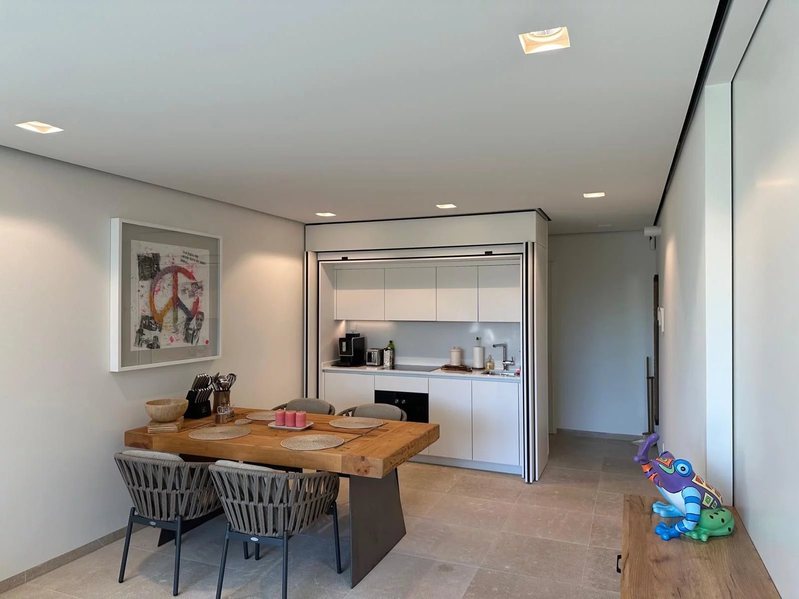 The entire building, along with the apartment—which features a bedroom with an en-suite bathroom, an open-plan living area with a kitchen, and a private parking space has been meticulously designed by the renowned architect Javier Armbruster.