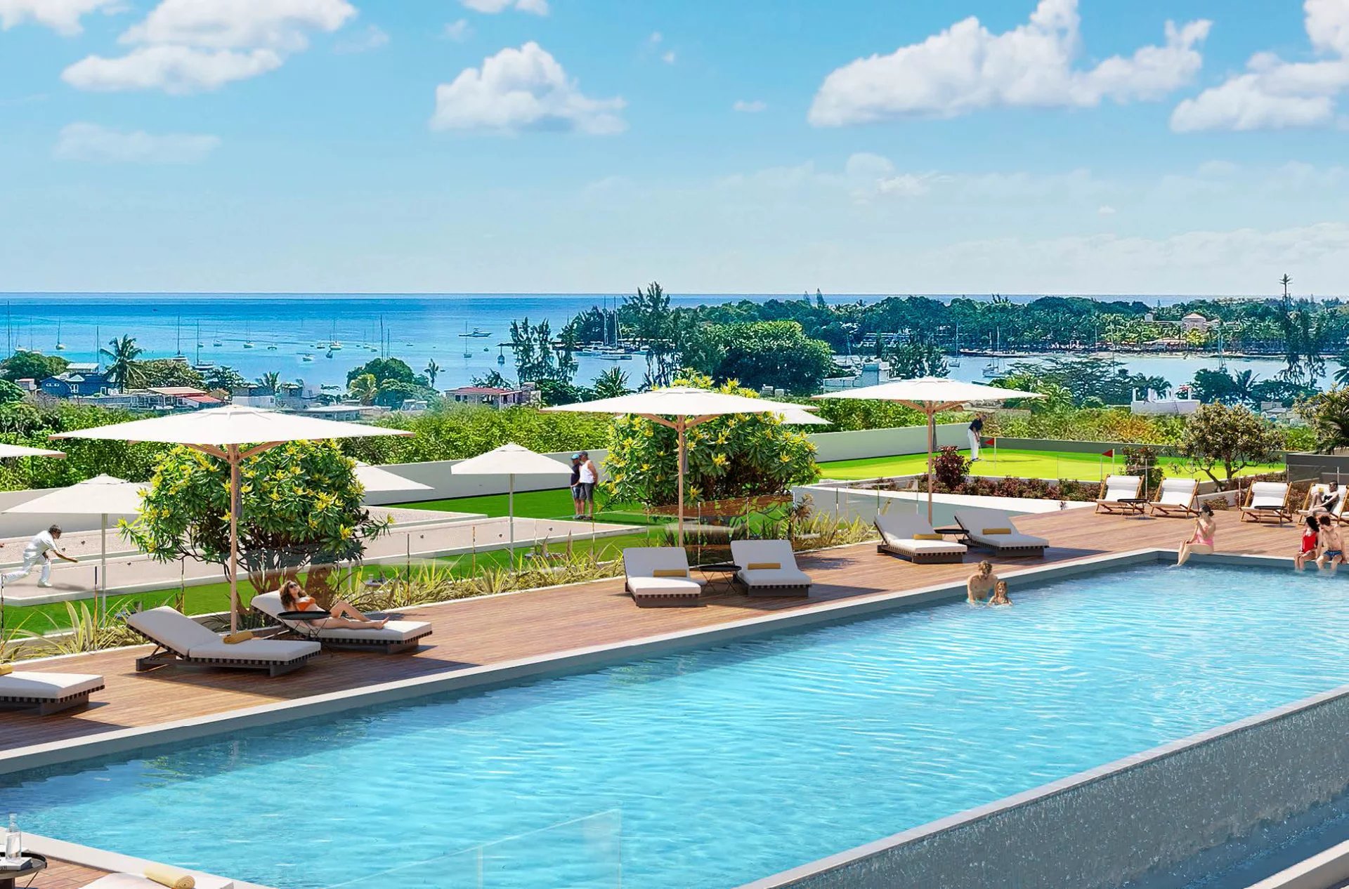 Ideally situated above La Croisette and boasting panoramic views of the lagoon of Grand Bay and its Northern islands, The Deck Suites & Residences has been designed to provide a unique residential experience. The esplanade features a relaxation area, a 25 metre infinity pool, an open-to-sky fitness area, a putting green, 2 pétanque courts, an aromatic herbs garden and a barbecue area, ideal for getting together after work.