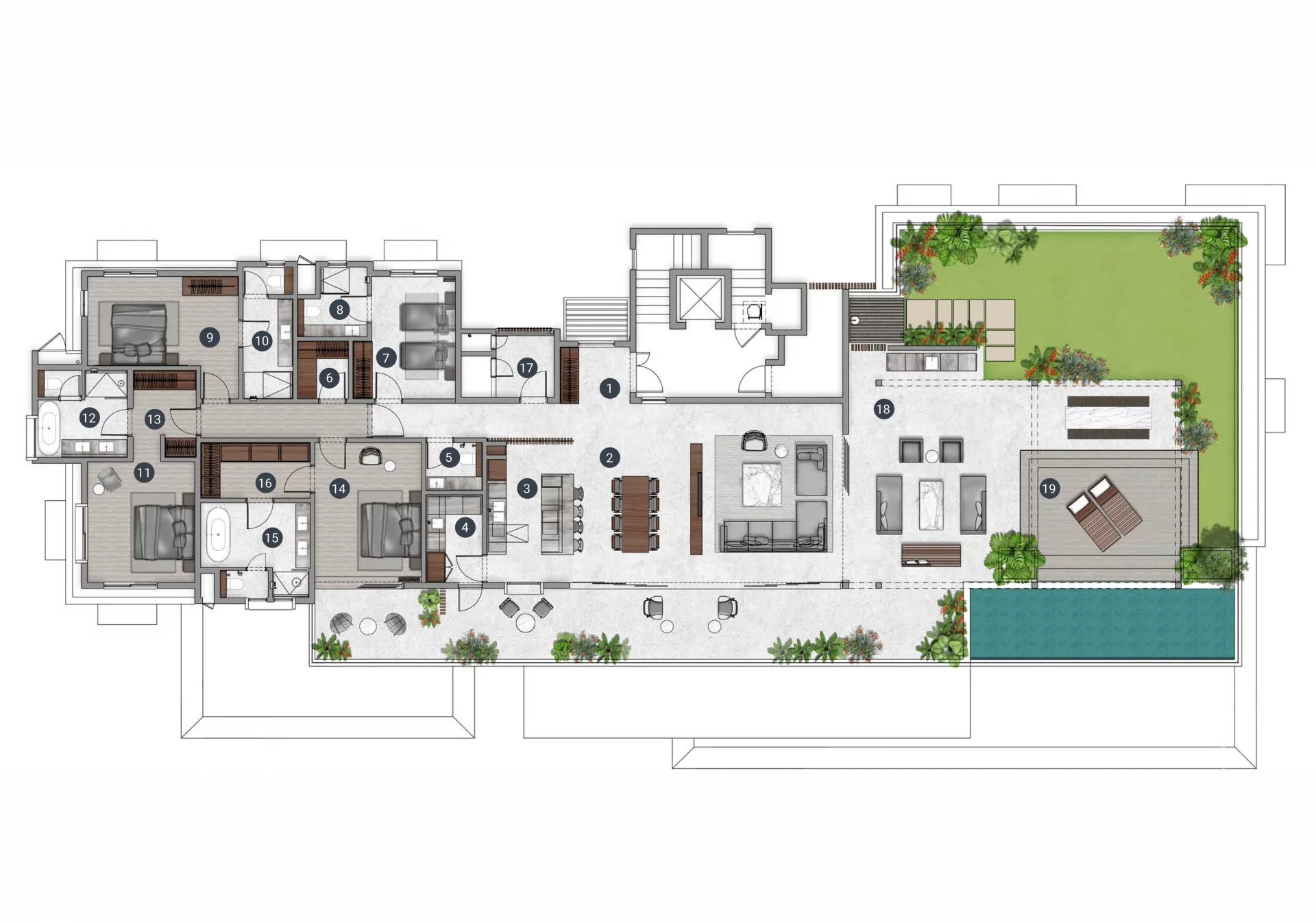 With expansive living spaces and panoramic views to Grand-Bay and the sea, these beautifully designed “Villas in the Sky” boast a wealth of bespoke features. Bright and airy rooms offer spectacular views, while the living areas open onto a large terrace with a breathtaking pool. Paying homage to prime Mauritian indoor/outdoor living, this sensational private realm offers the finest in luxury elevated living.