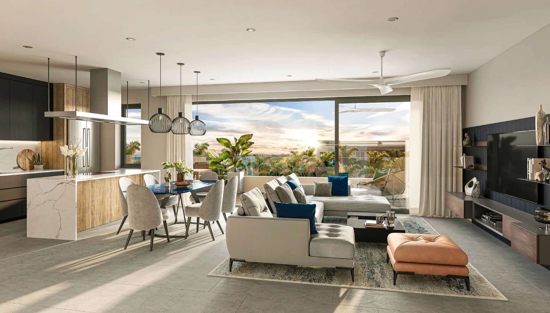 The architecture and design in these magnificent penthouses embodies the spirit, sleek design and warm tactile materials of the Mauritian lifestyle. Large private terraces and generous openings blend the inside and outside spaces into one, the pool terrace becoming a seamless extension of the living room. The large sailing canopies add to the distinctly tropical feel, so you can marvel in comfort at the amazing views to the sea or over the golf course to the mountains beyond.