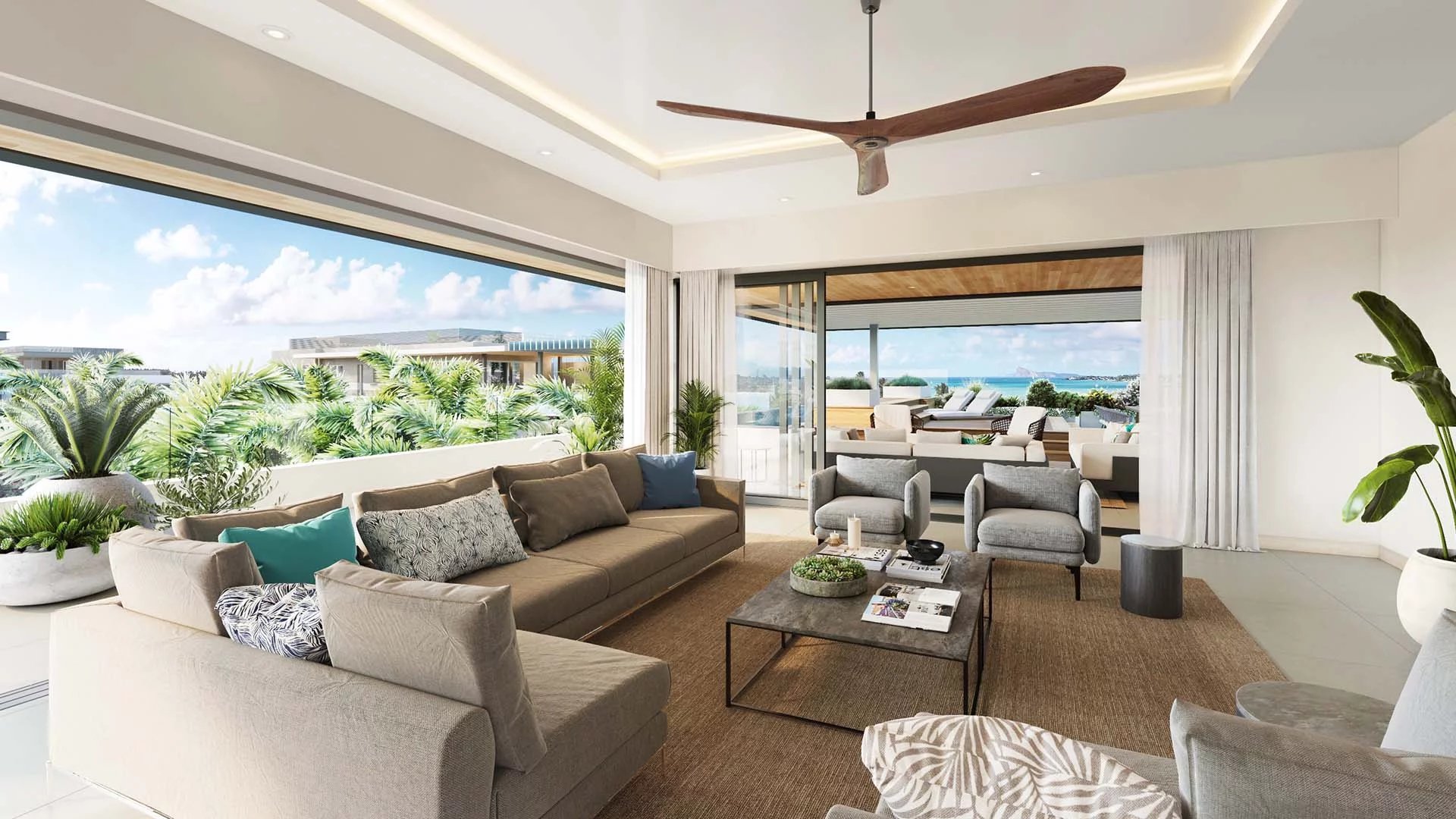 The architecture and design in these magnificent penthouses embodies the spirit, sleek design and warm tactile materials of the Mauritian lifestyle. Large private terraces and generous openings blend the inside and outside spaces into one, the pool terrace becoming a seamless extension of the living room. The large sailing canopies add to the distinctly tropical feel, so you can marvel in comfort at the amazing views to the sea or over the golf course to the mountains beyond.