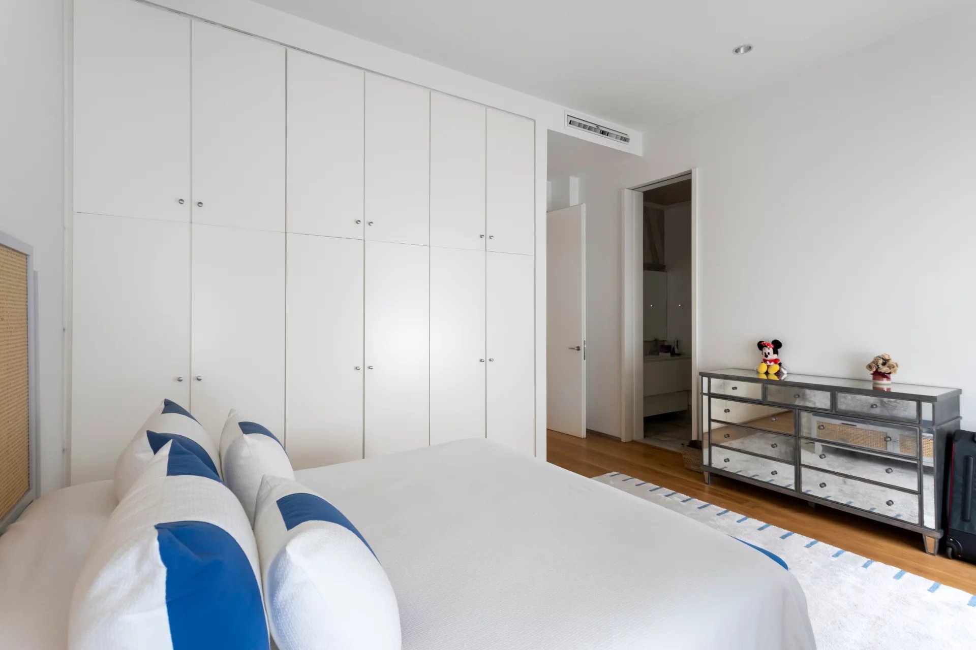 It has a private area of 390 square metres and an exclusive terrace of 90 square metres. It has three bedrooms plus a service bedroom, all of them exterior and with large built-in wardrobes. The very spacious master bedroom has a surface area of 42 square metres and has four balconies, a large dressing room and an en-suite bathroom (both the bedroom and the bathroom have direct access to the terrace). The other two bedrooms also have their own en suite bathrooms. The service area, which is completely independent, consists of a bedroom with a full bathroom and a laundry area.
