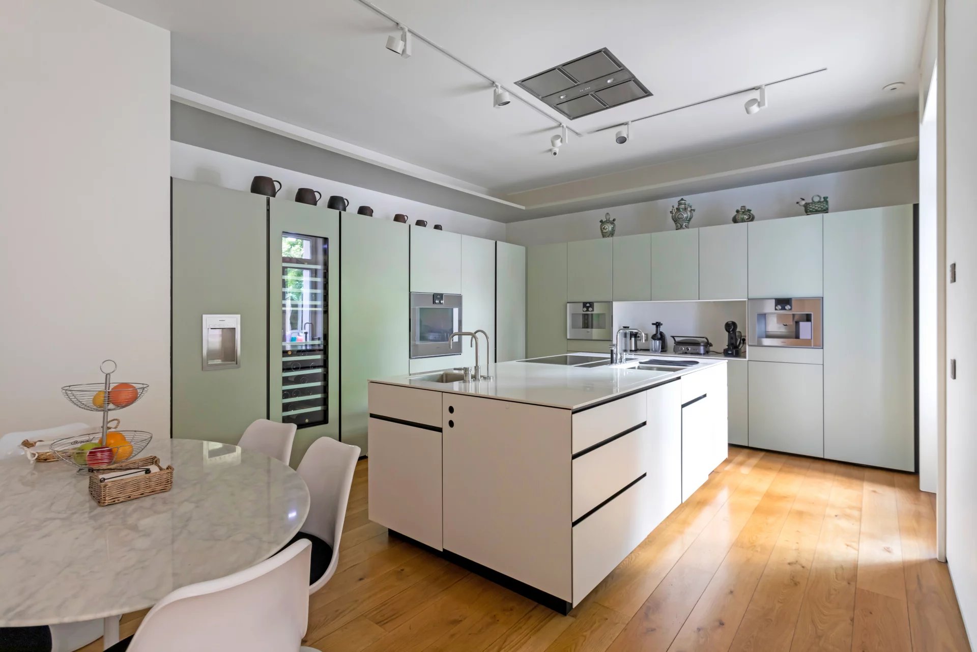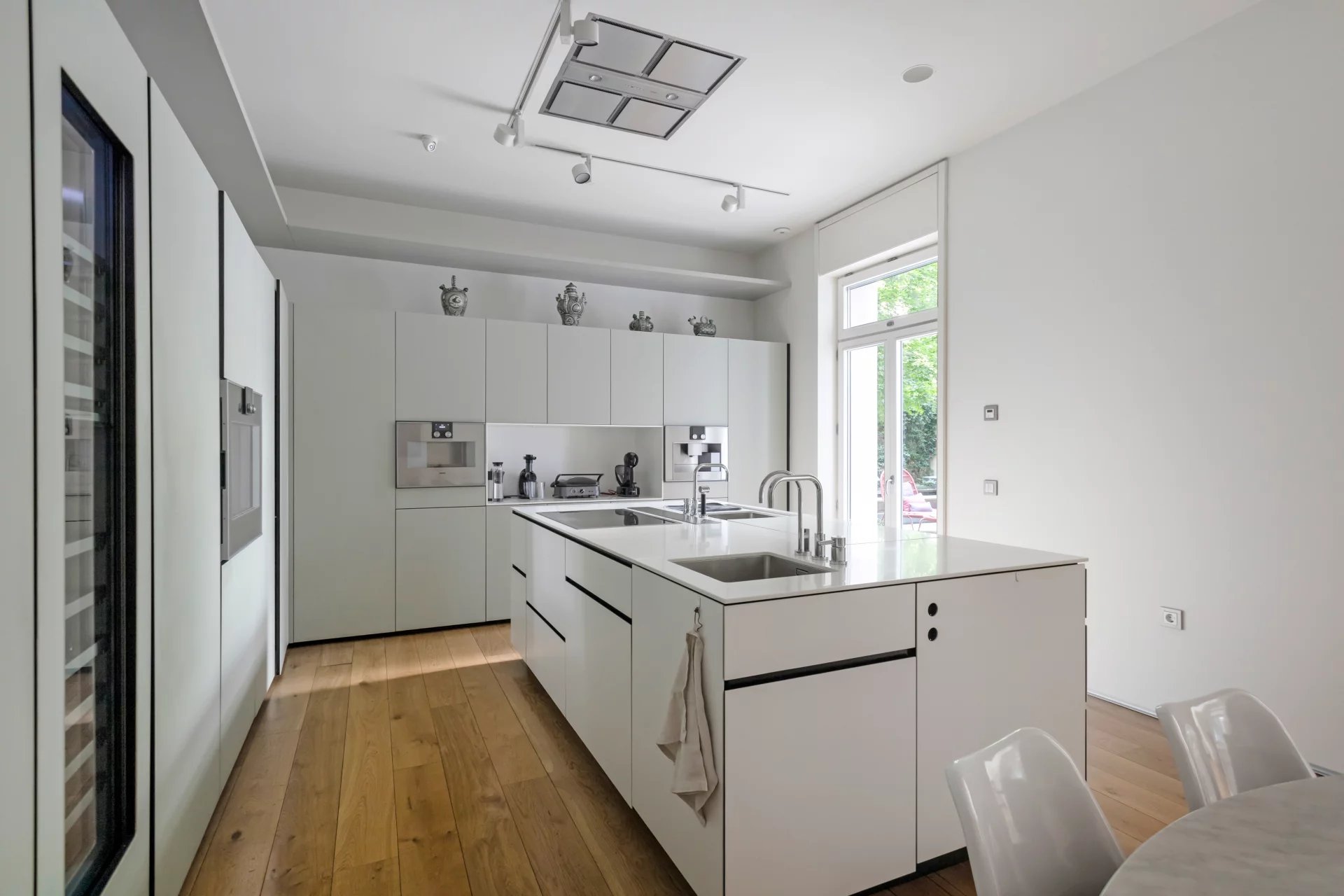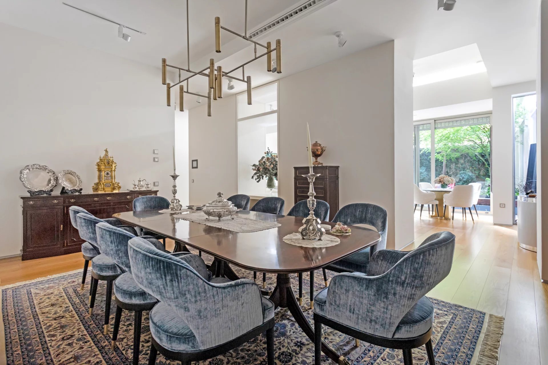 The large living room is simply spectacular with its high ceilings and floor-to-ceiling glass doors that, once opened, create a unique space together with the terrace. The modern style kitchen, designed by Artificio, is equipped with top of the range Gaggenau appliances and has a service entrance and direct access to the terrace. A large separate dining room and a spacious family room complete this magnificent property.