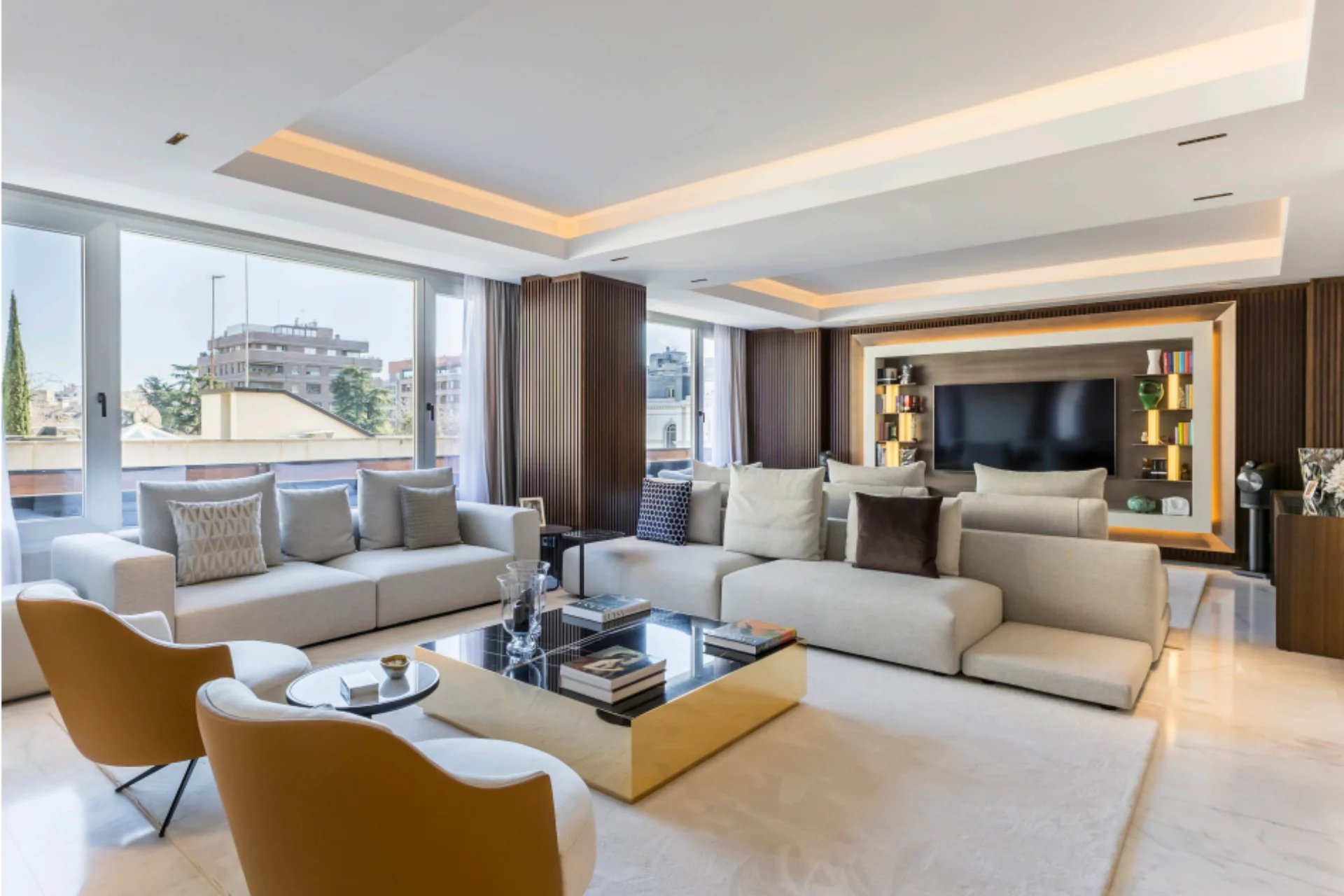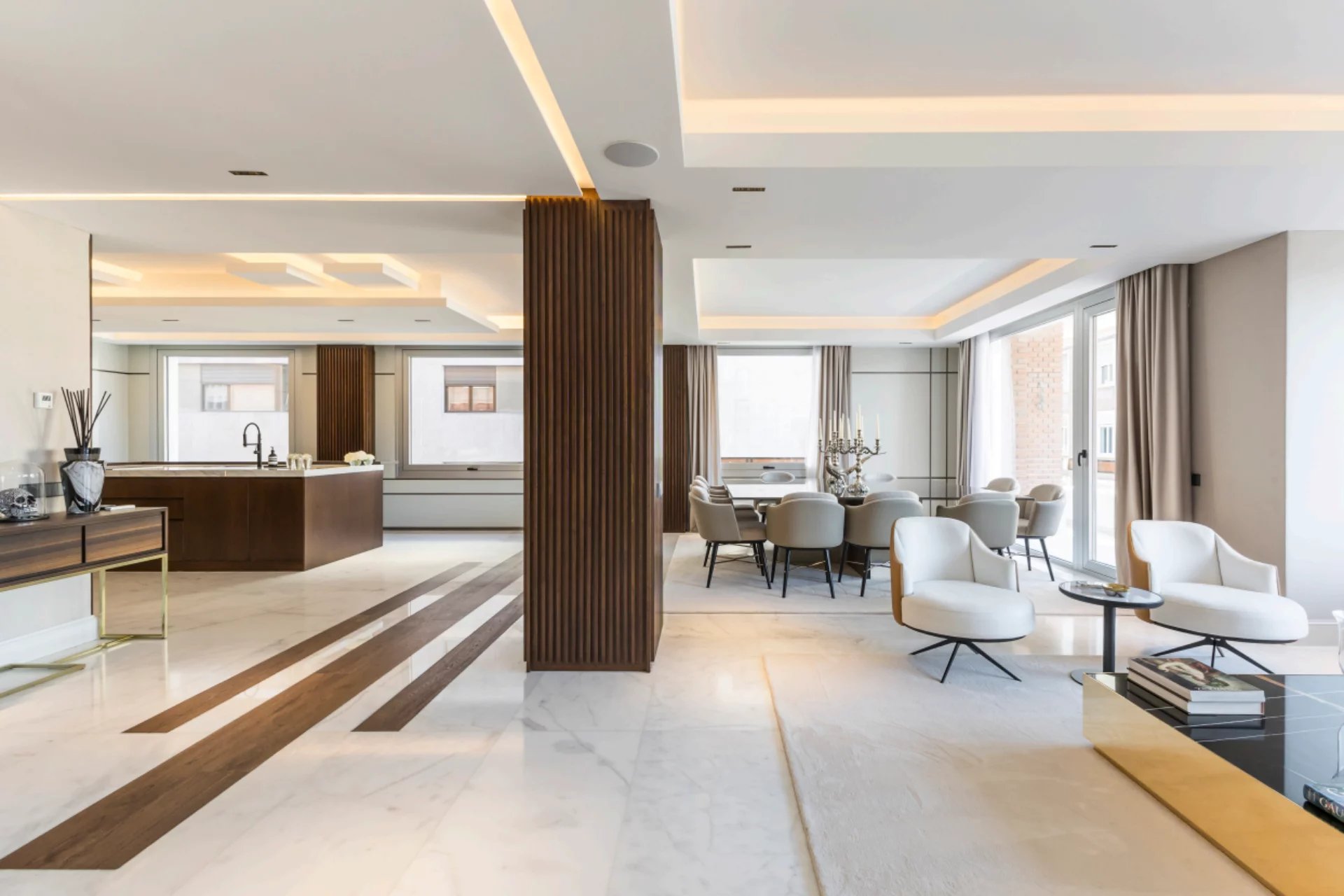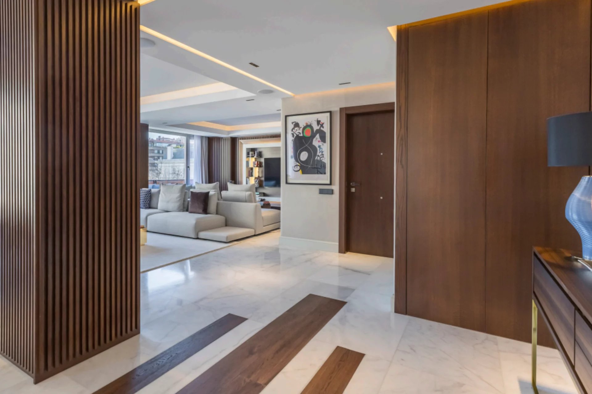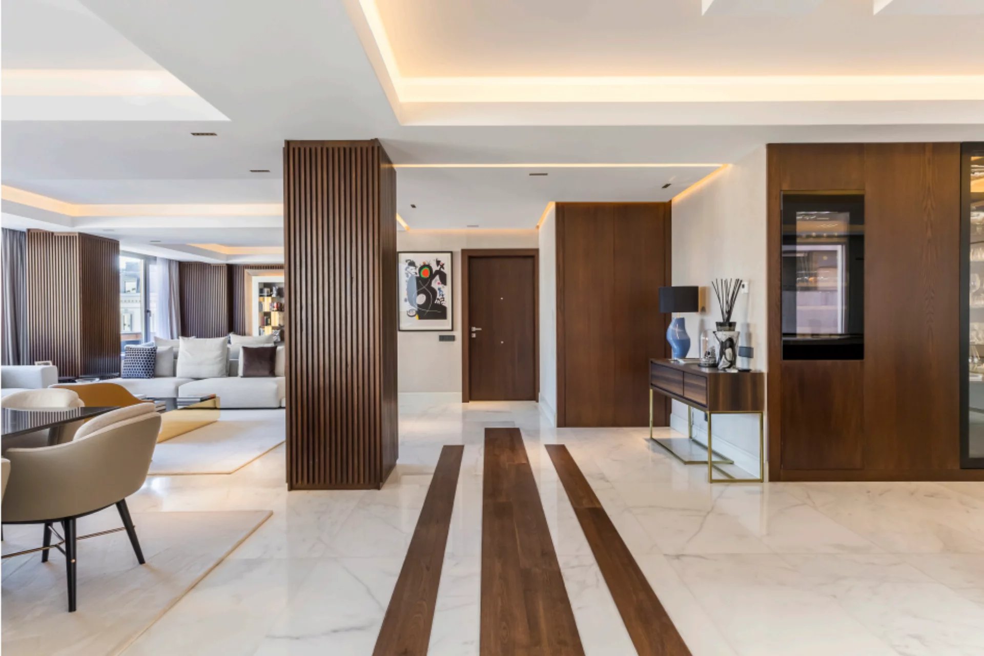 Located in one of the best areas of Madrid, this exceptional property combines international modern design with top-quality finishes. Created by a renowned interior design studio, it features noble materials such as dolomite marble and natural oak wood, giving the home a unique character.