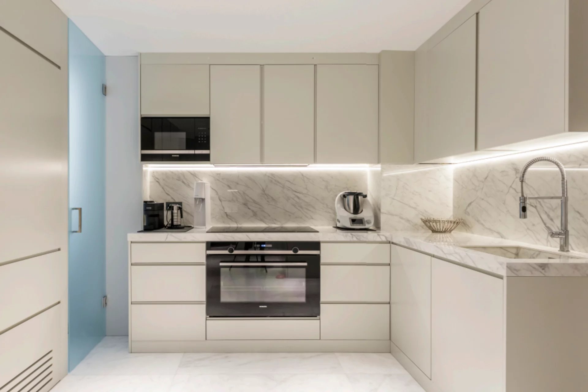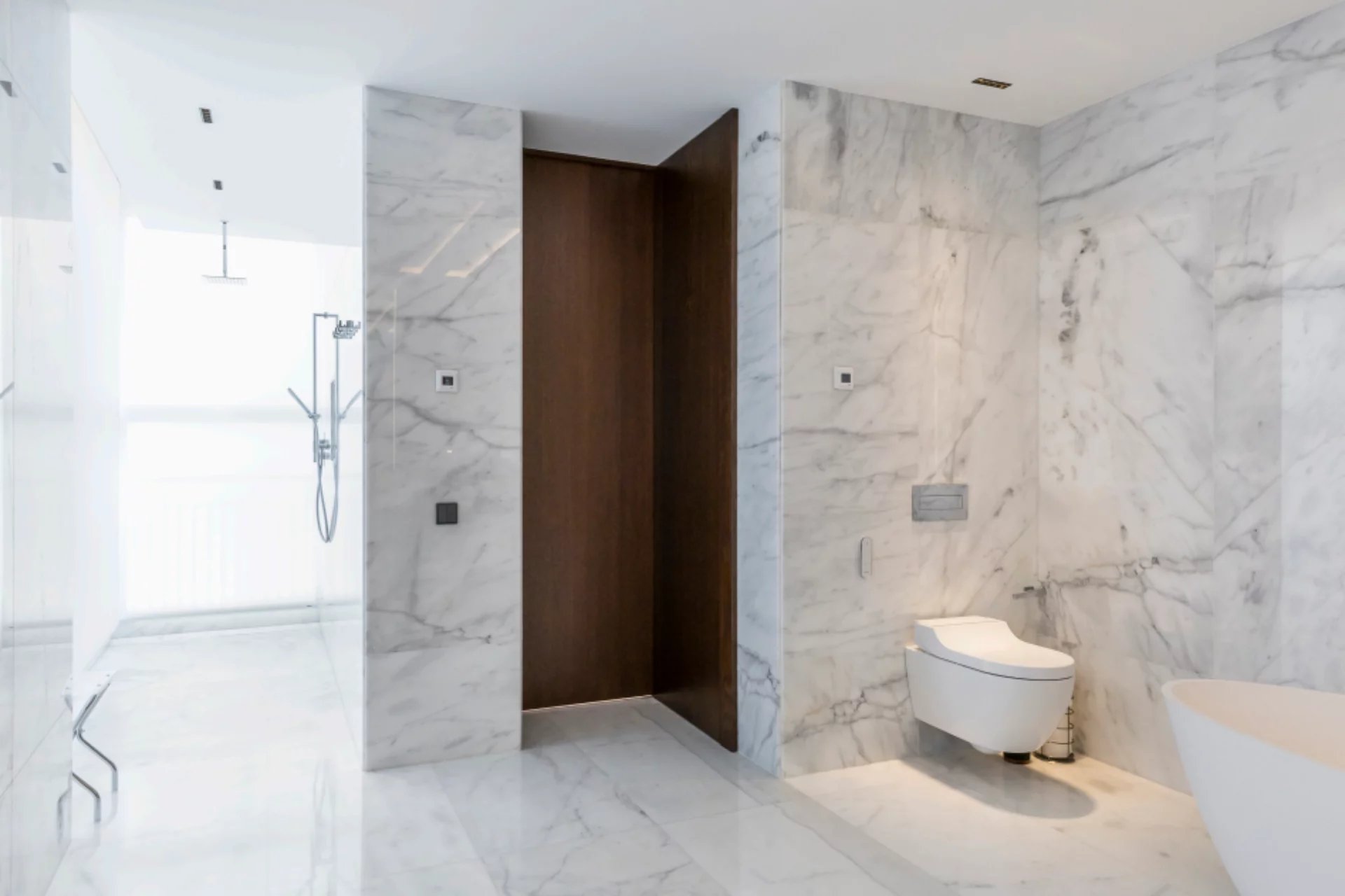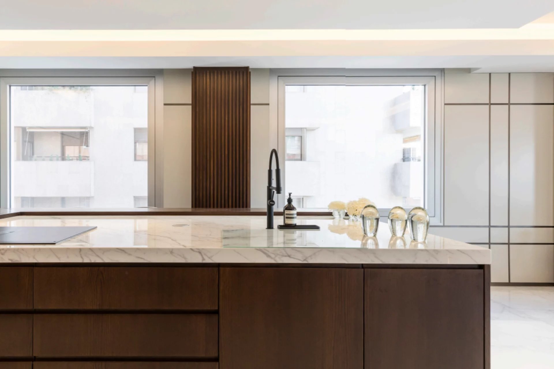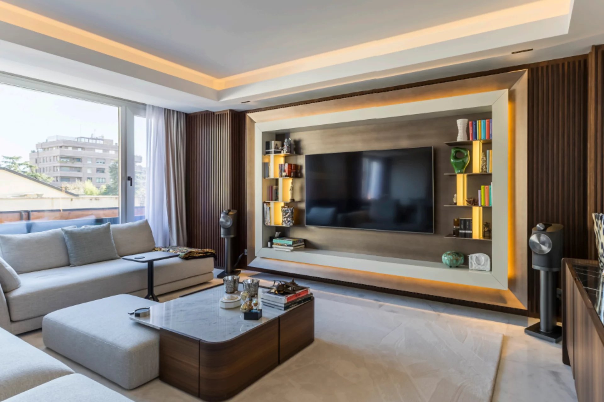 High ceilings and custom-made Italian furniture, along with advanced technologies such as the Casambi lighting control system and B&W sound system, create an atmosphere of luxury and sophistication. The property enjoys excellent natural light thanks to its large windows facing East and North on the exterior and West on the interior.