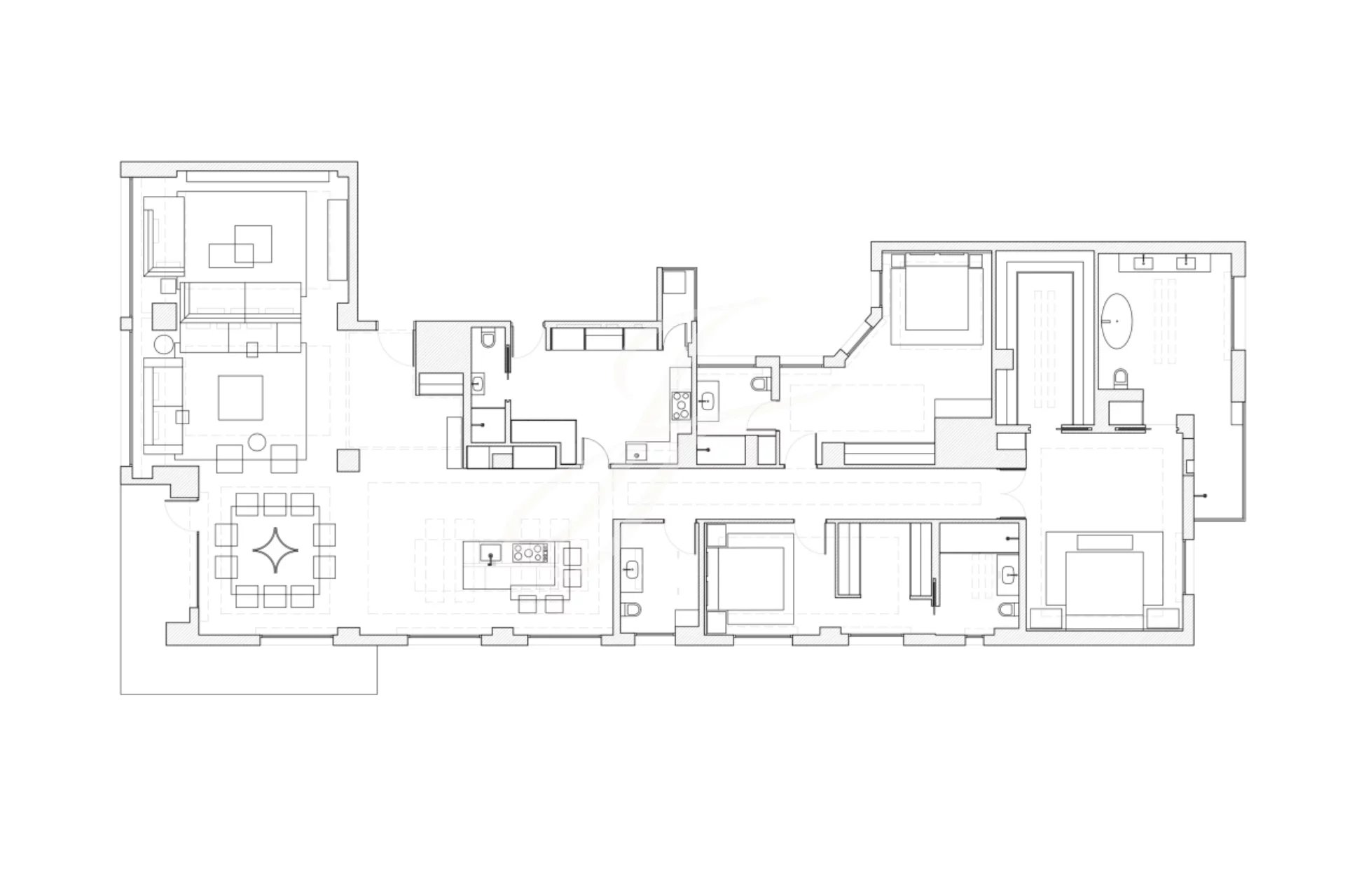 The layout highlights a spacious reception area with an integrated dining room, seating up to twelve people, and a large living room that opens to a terrace with unobstructed views. The fully equipped kitchen, with high-end appliances and a wine cellar, seamlessly connects to the living room, while a second independent kitchen offers added functionality, including a laundry area, a service bed, and a bathroom, transforming this space into an independent apartment.