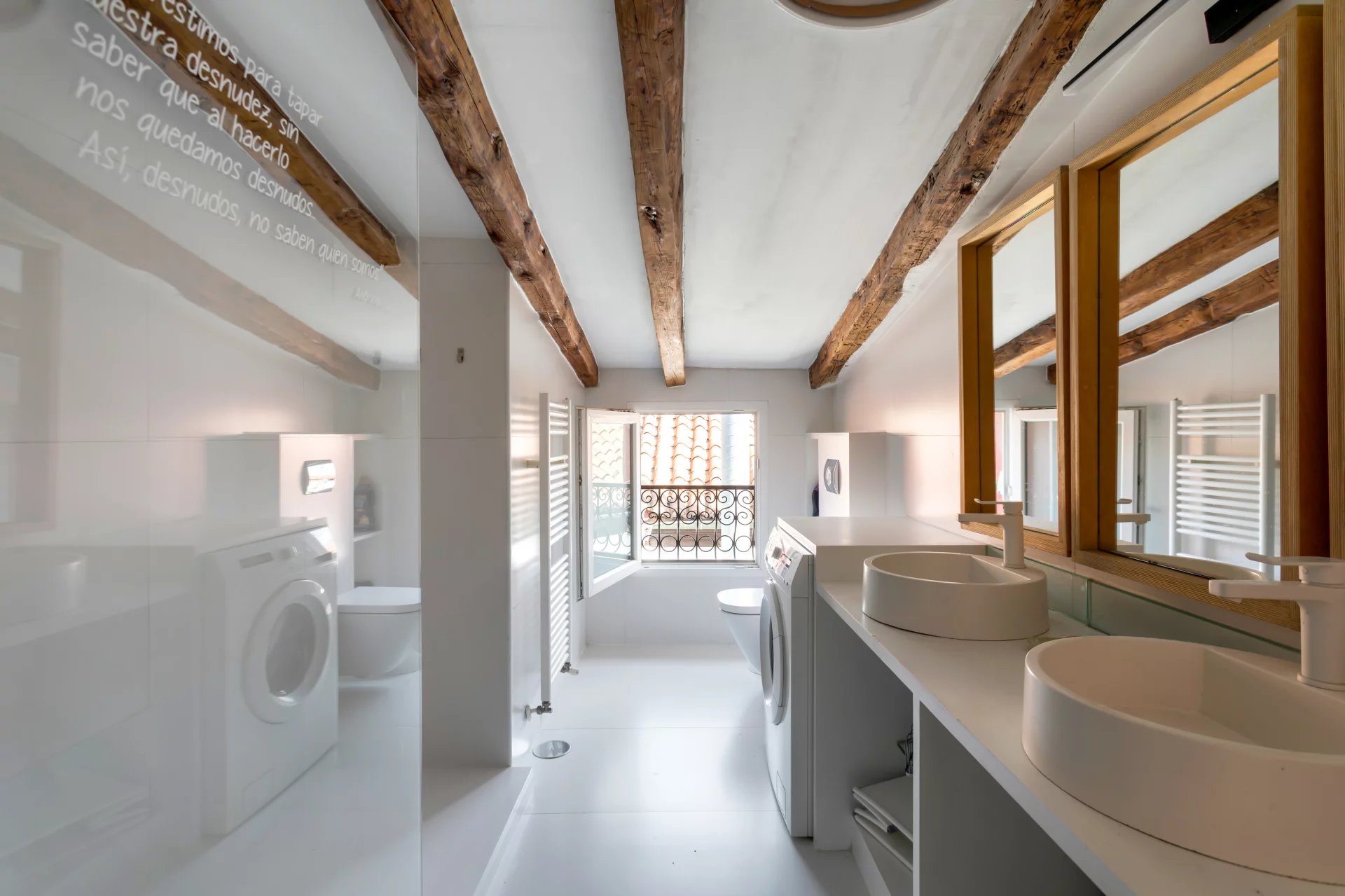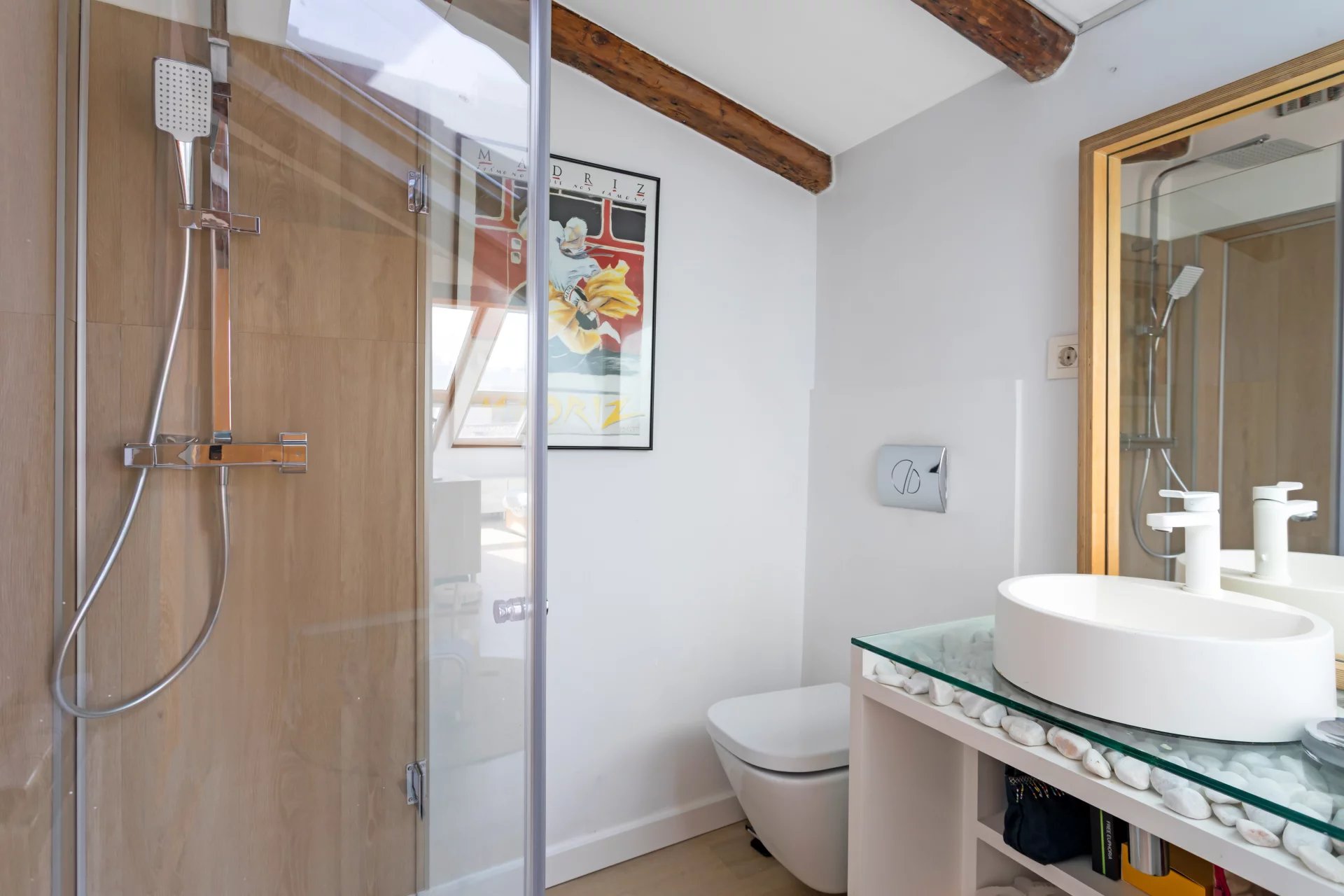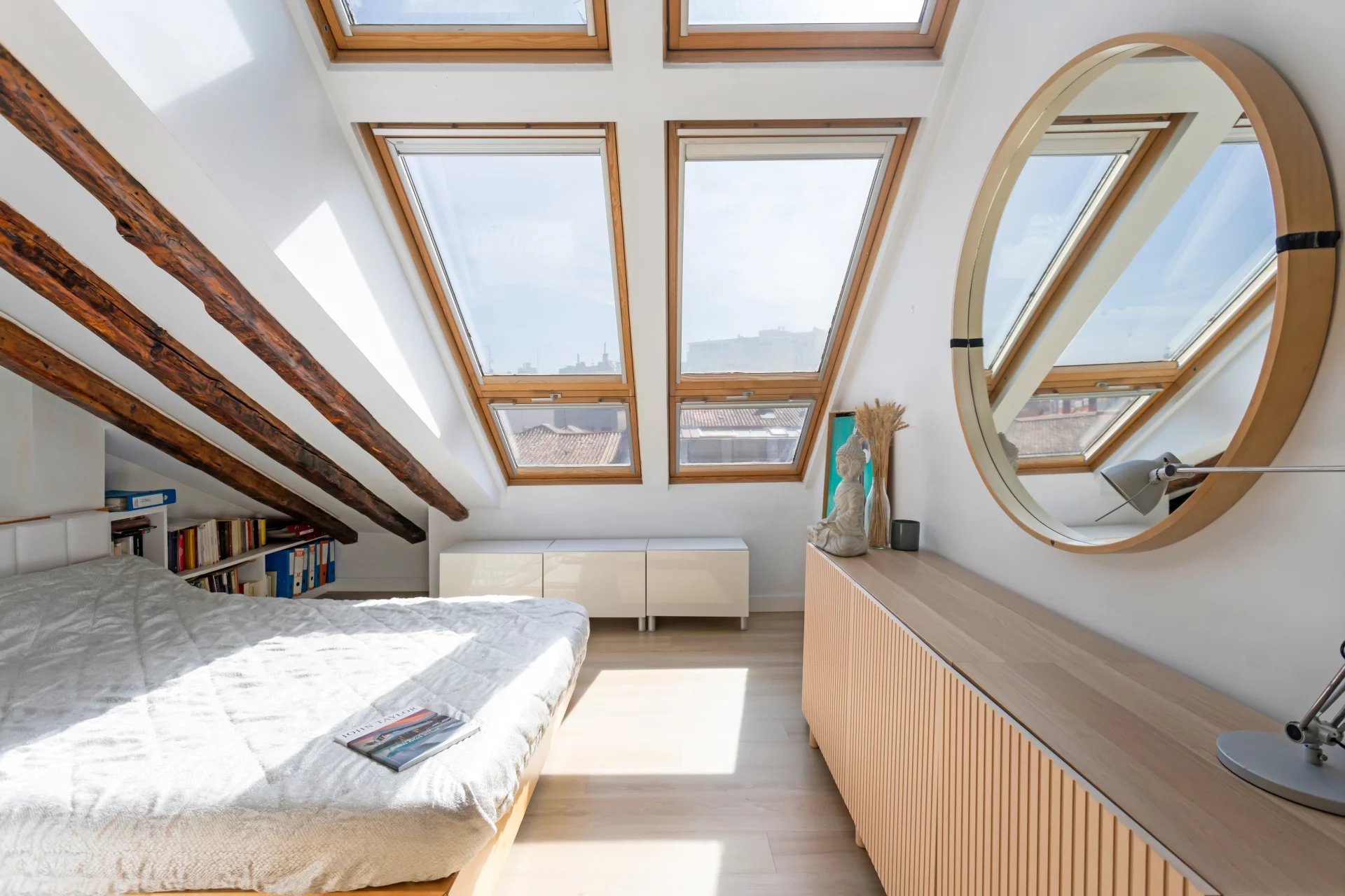The living room and the bedroom have windows on the roof overlooking Alcalá street, from where you can admire beautiful classical buildings and part of the Retiro Park. This is a penthouse for lovers of sun and natural light.