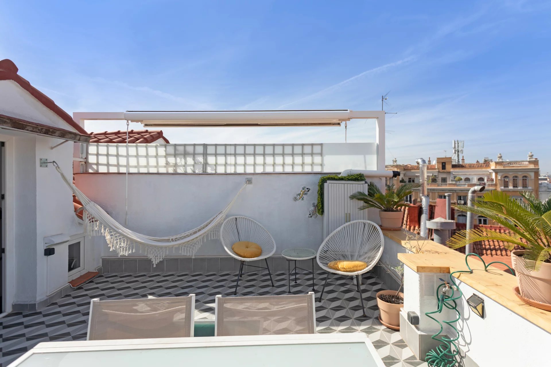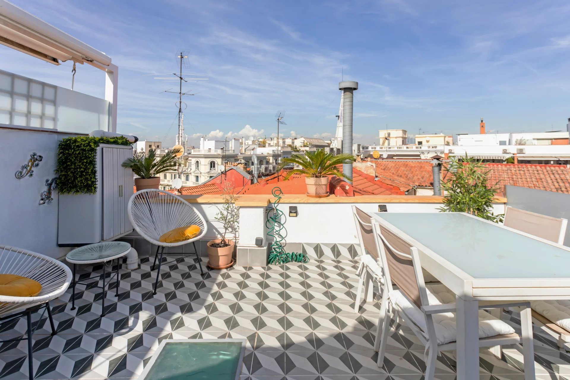 This duplex stands out for its spectacular terrace, which rises imposingly over the neighboring buildings, offering views of the Madrid sky with total privacy and no noise, thanks to its strategic location.