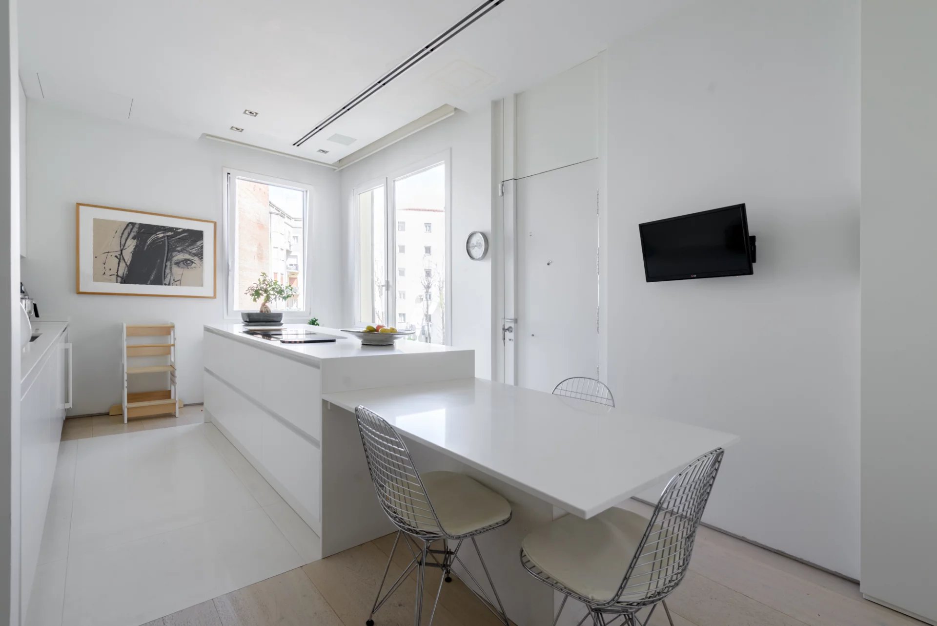 The kitchen is independent and bright, with dining area and large windows overlooking a quiet landscaped courtyard. The appliances are top of the range.