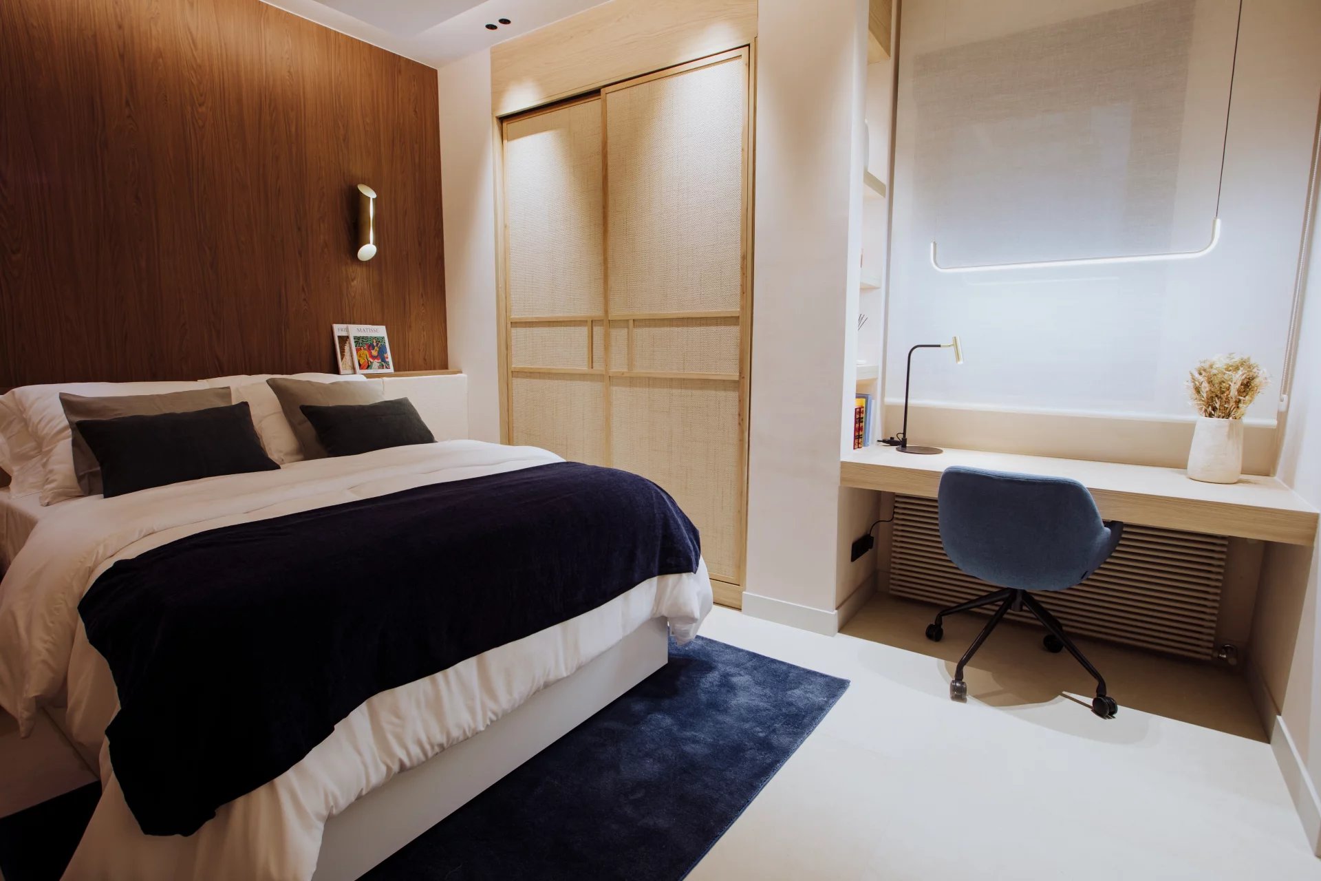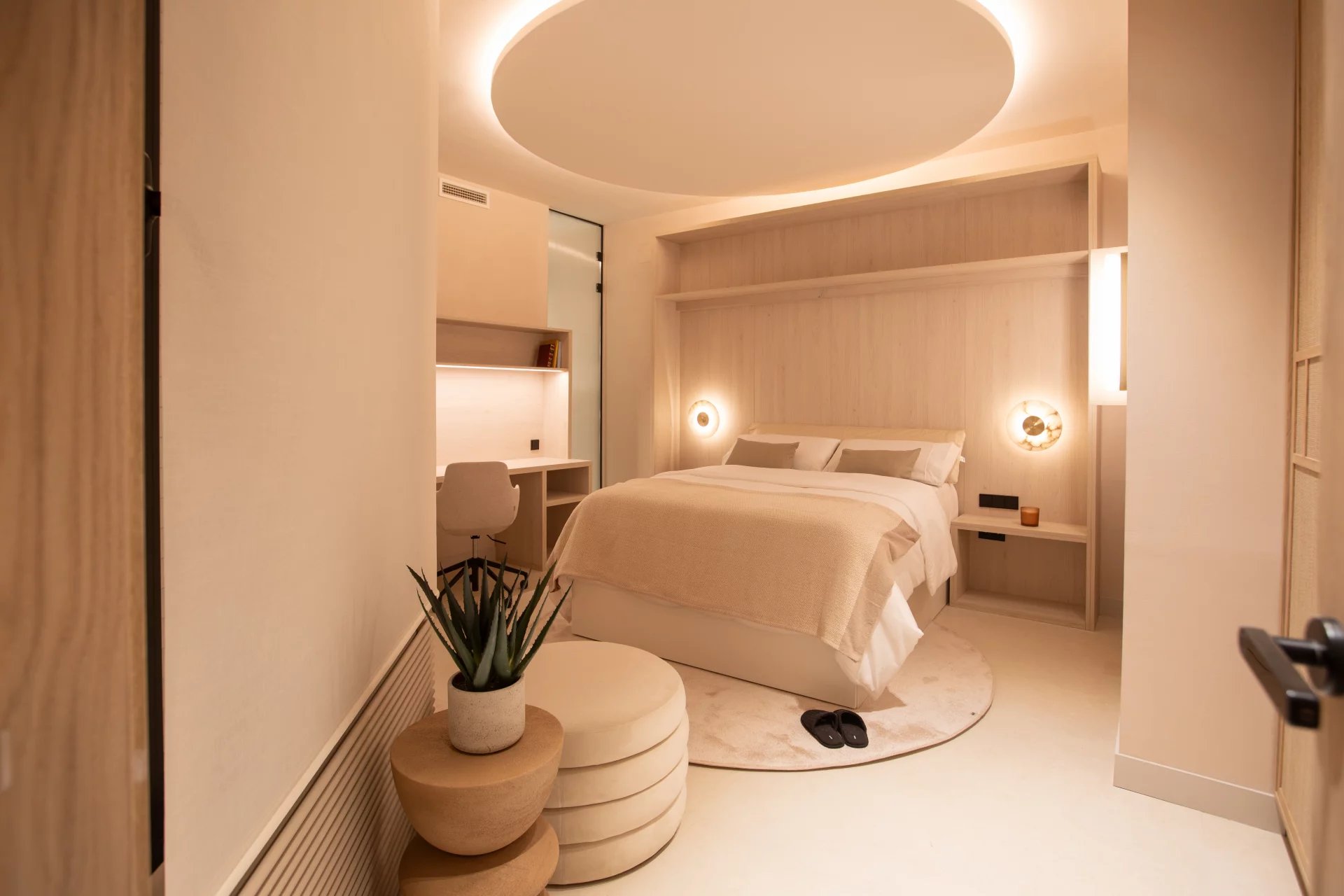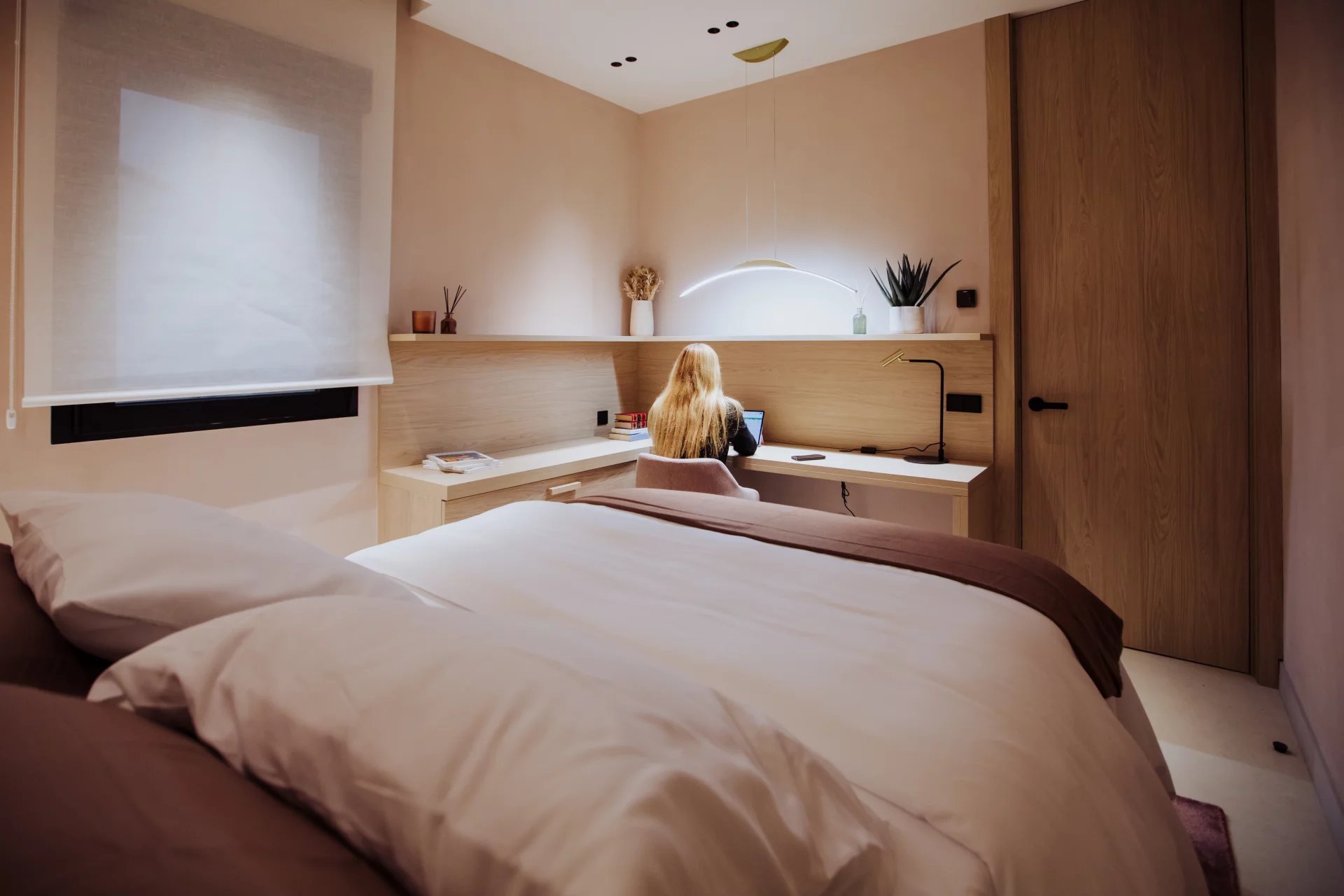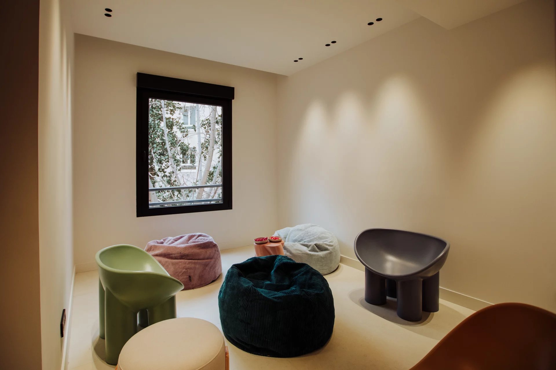 The sleeping area comprises no fewer than five additional bedrooms, each with its own en-suite bathroom, windows, and study space. One of them overlooks a quiet landscaped courtyard with charming views. The same courtyard is also visible from the office—equipped with a large screen for videoconferencing—and from the family room, which features a hidden projector. Another of the bedrooms has an independent entrance, making it ideal for staff or guests. A separate laundry room, with three washing machines and three dryers, completes the layout.