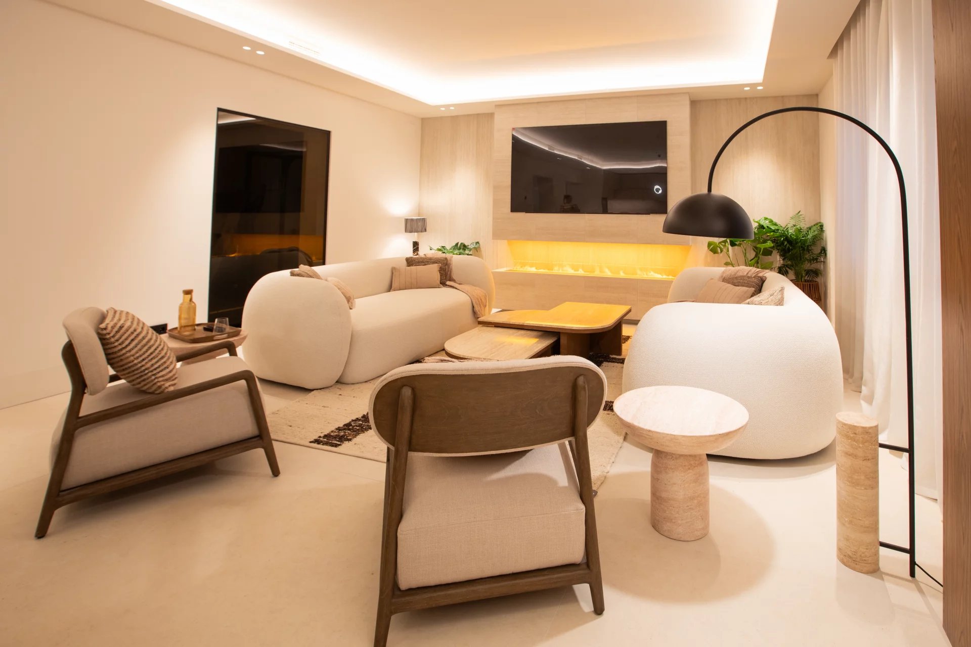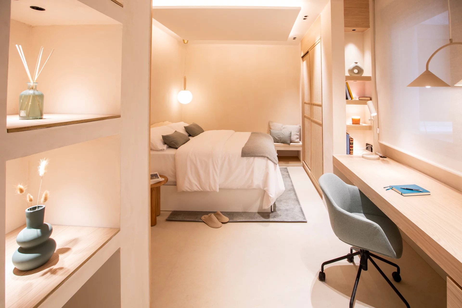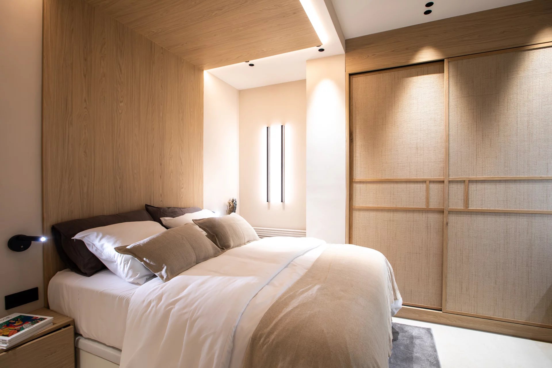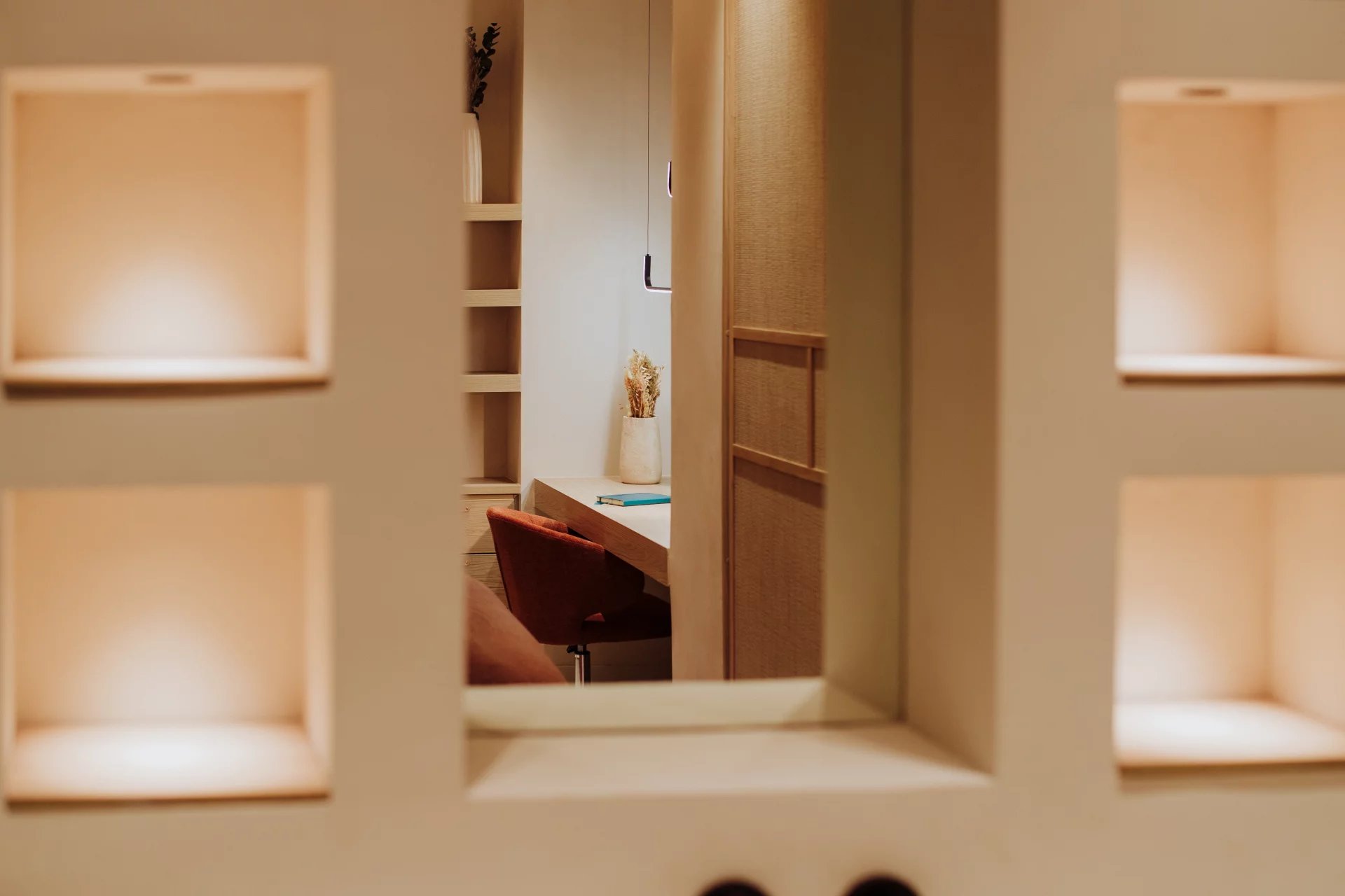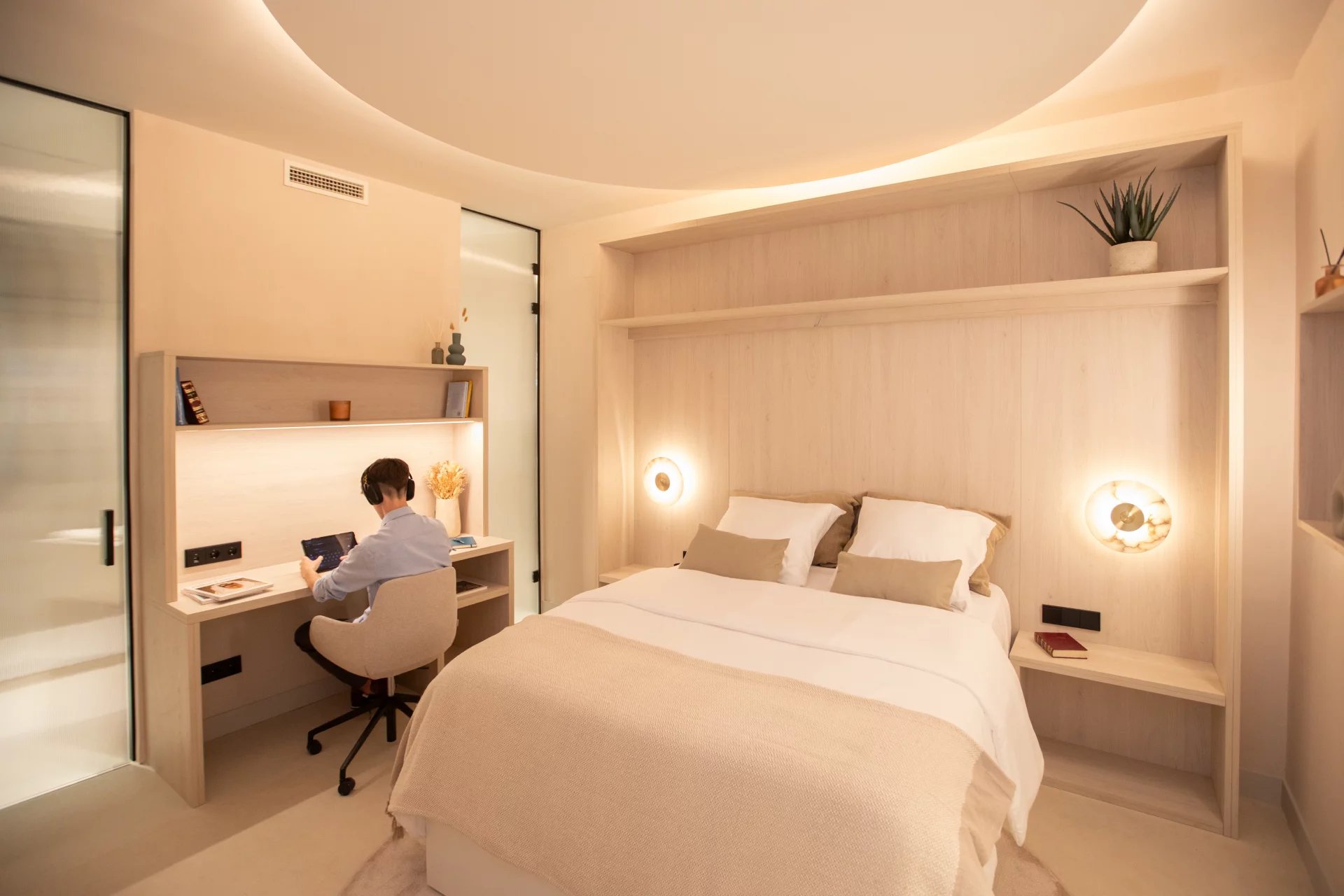 The sleeping area comprises no fewer than five additional bedrooms, each with its own en-suite bathroom, windows, and study space. One of them overlooks a quiet landscaped courtyard with charming views. The same courtyard is also visible from the office—equipped with a large screen for videoconferencing—and from the family room, which features a hidden projector. Another of the bedrooms has an independent entrance, making it ideal for staff or guests. A separate laundry room, with three washing machines and three dryers, completes the layout.