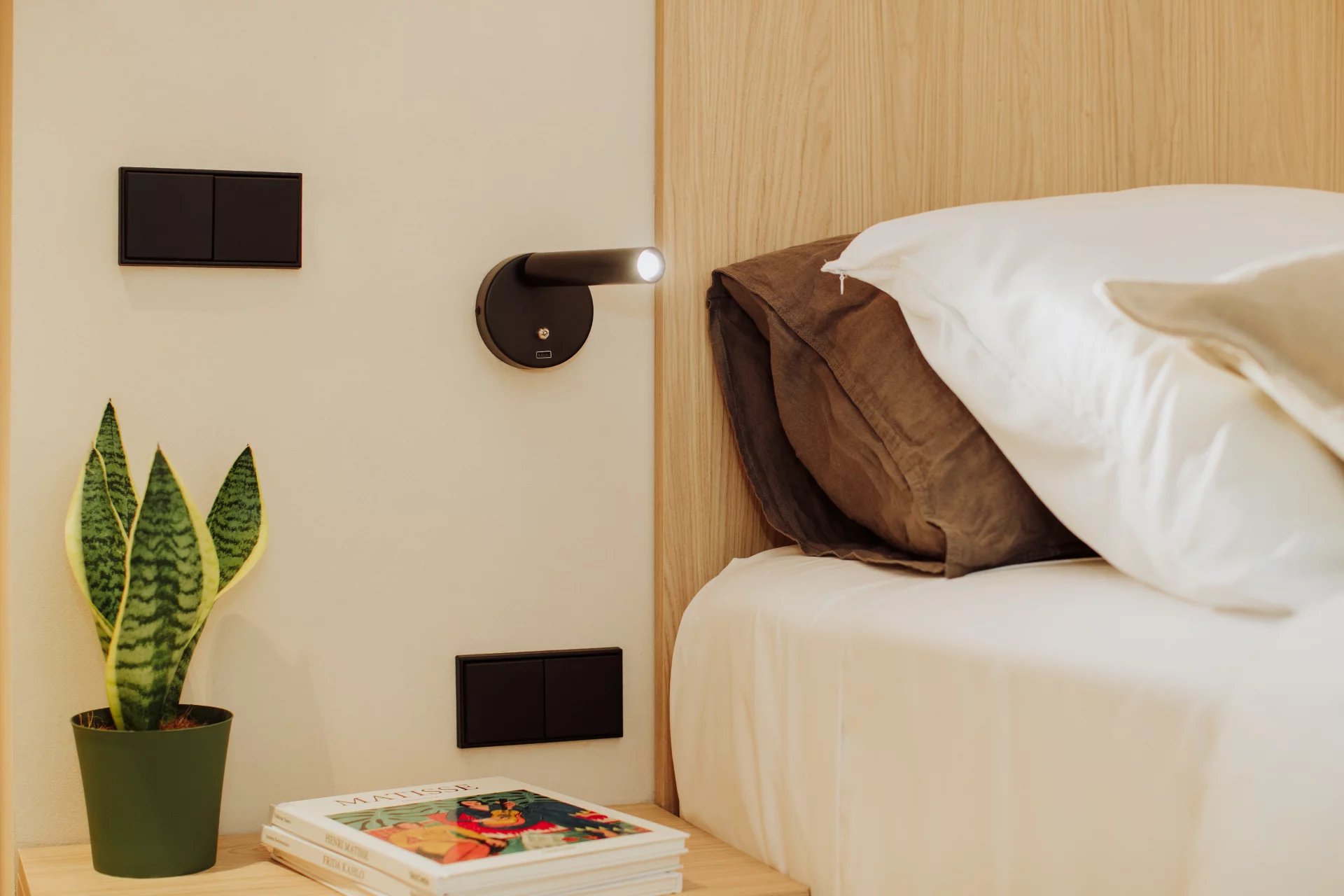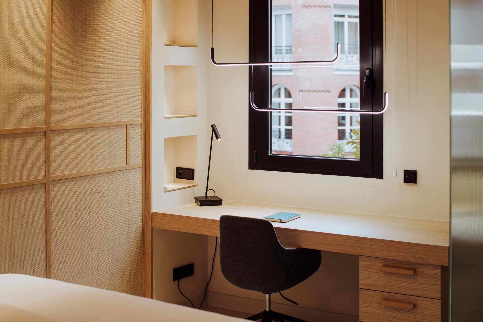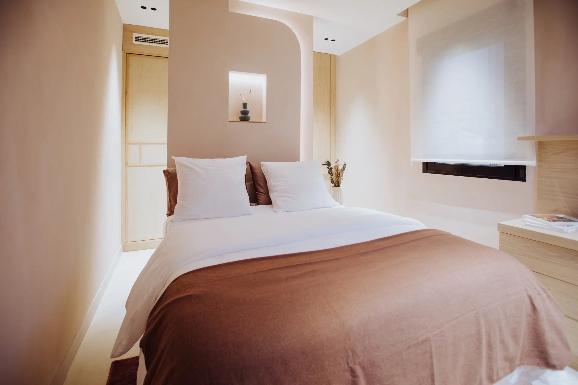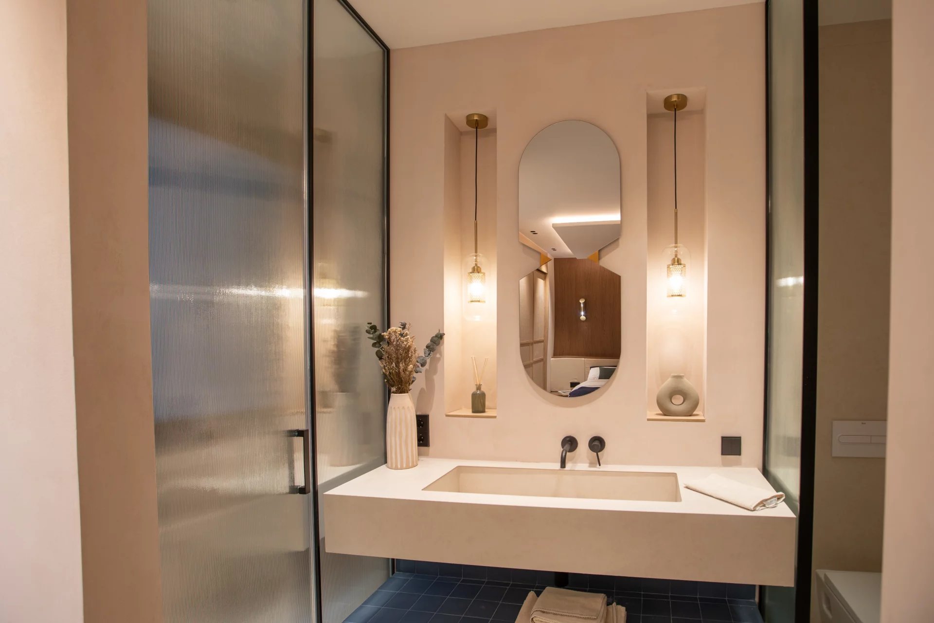 The sleeping area comprises no fewer than five additional bedrooms, each with its own en-suite bathroom, windows, and study space. One of them overlooks a quiet landscaped courtyard with charming views. The same courtyard is also visible from the office—equipped with a large screen for videoconferencing—and from the family room, which features a hidden projector. Another of the bedrooms has an independent entrance, making it ideal for staff or guests. A separate laundry room, with three washing machines and three dryers, completes the layout.
