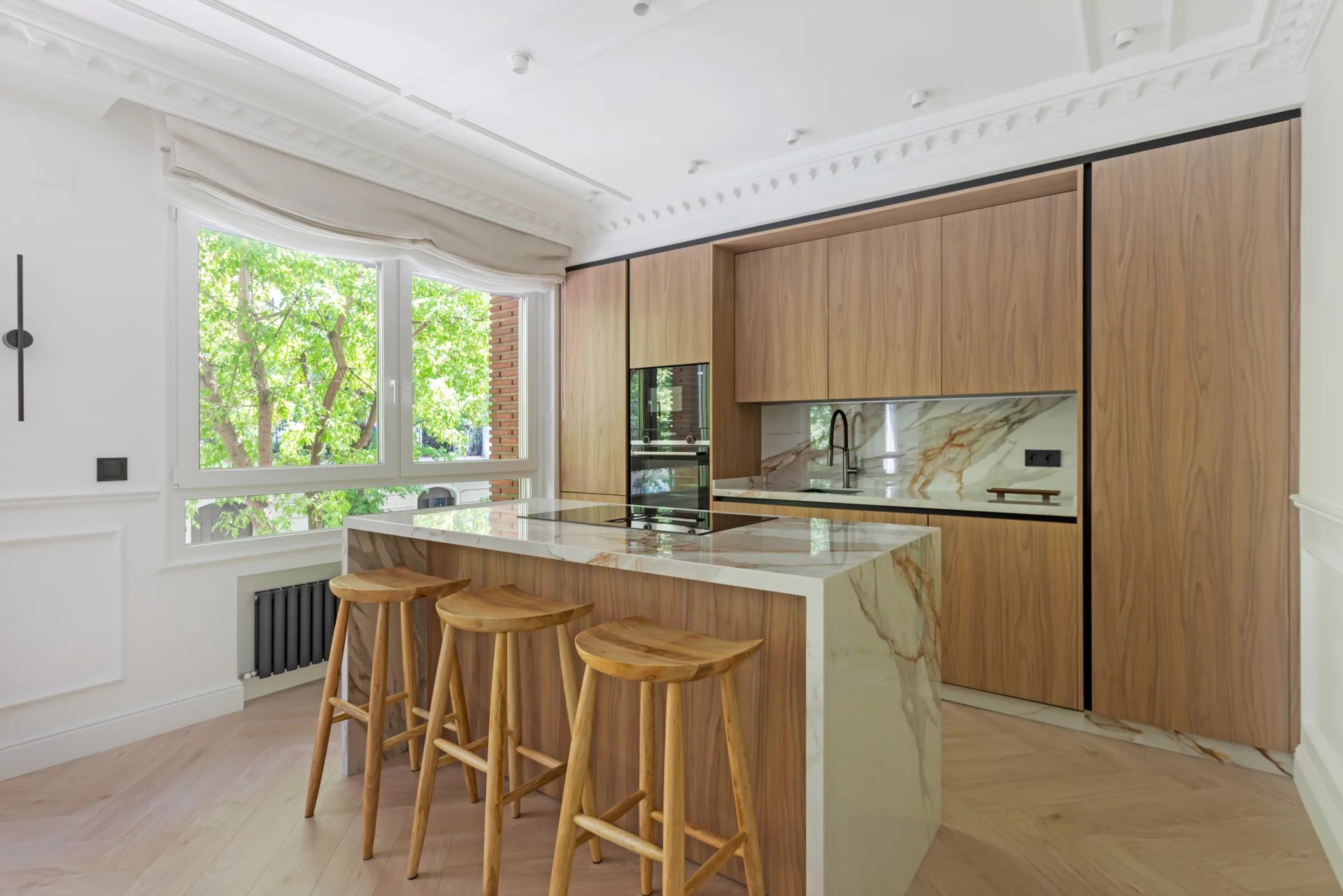 The social area, exterior facing east, has excellent natural light thanks to its large windows and is really a space to enjoy with its open design kitchen with beautiful island and equipped with high-end appliances.