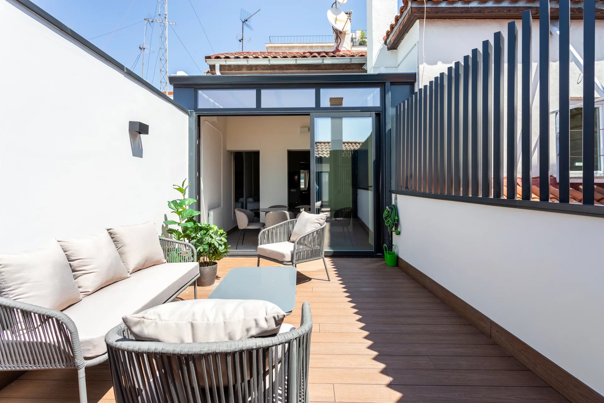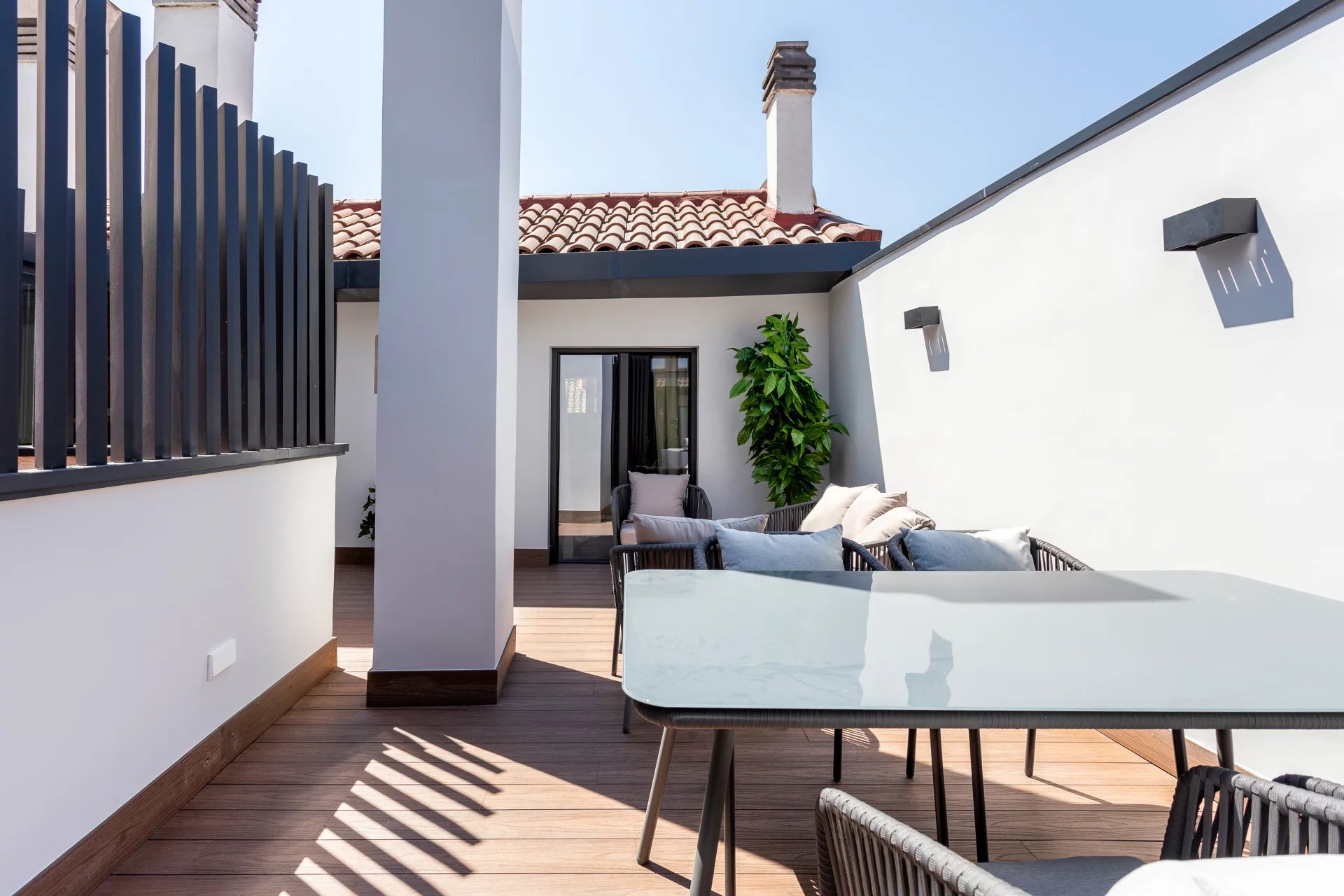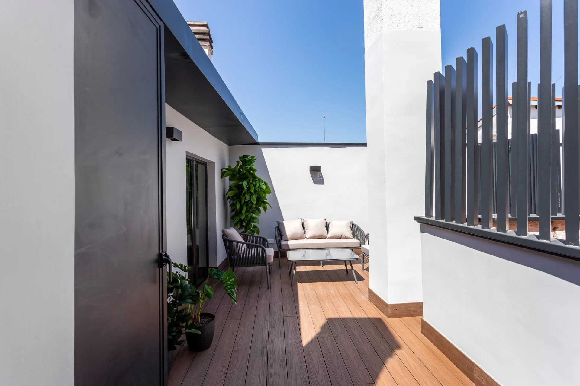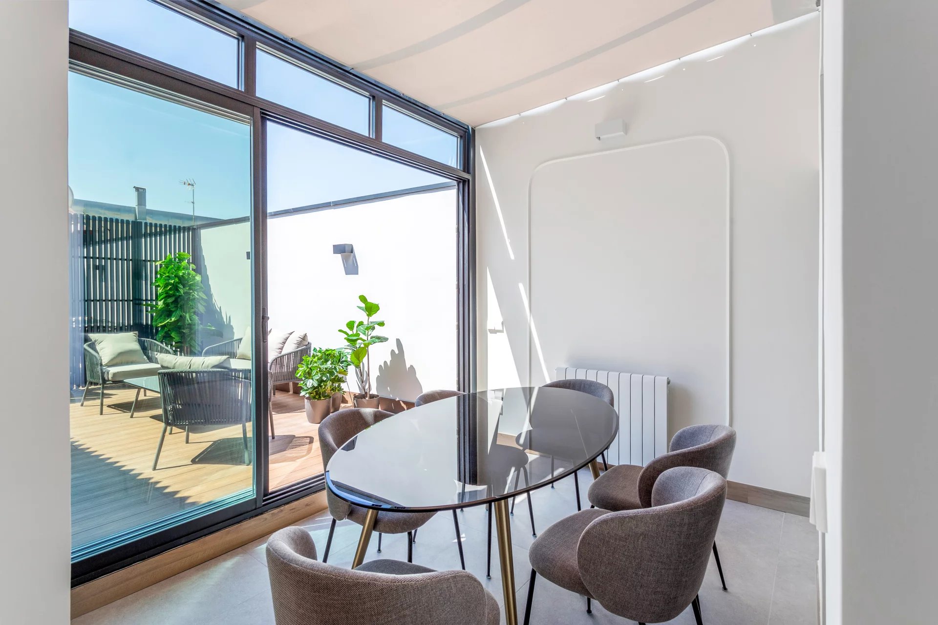 Learn moreEach flat has two bedrooms with en suite bathrooms, fitted wardrobes, individual heating and ducted air conditioning with AirZone. They each have their own terrace (21 m² + 14 m²) connected by a beautiful metal door. The terraces have total privacy.