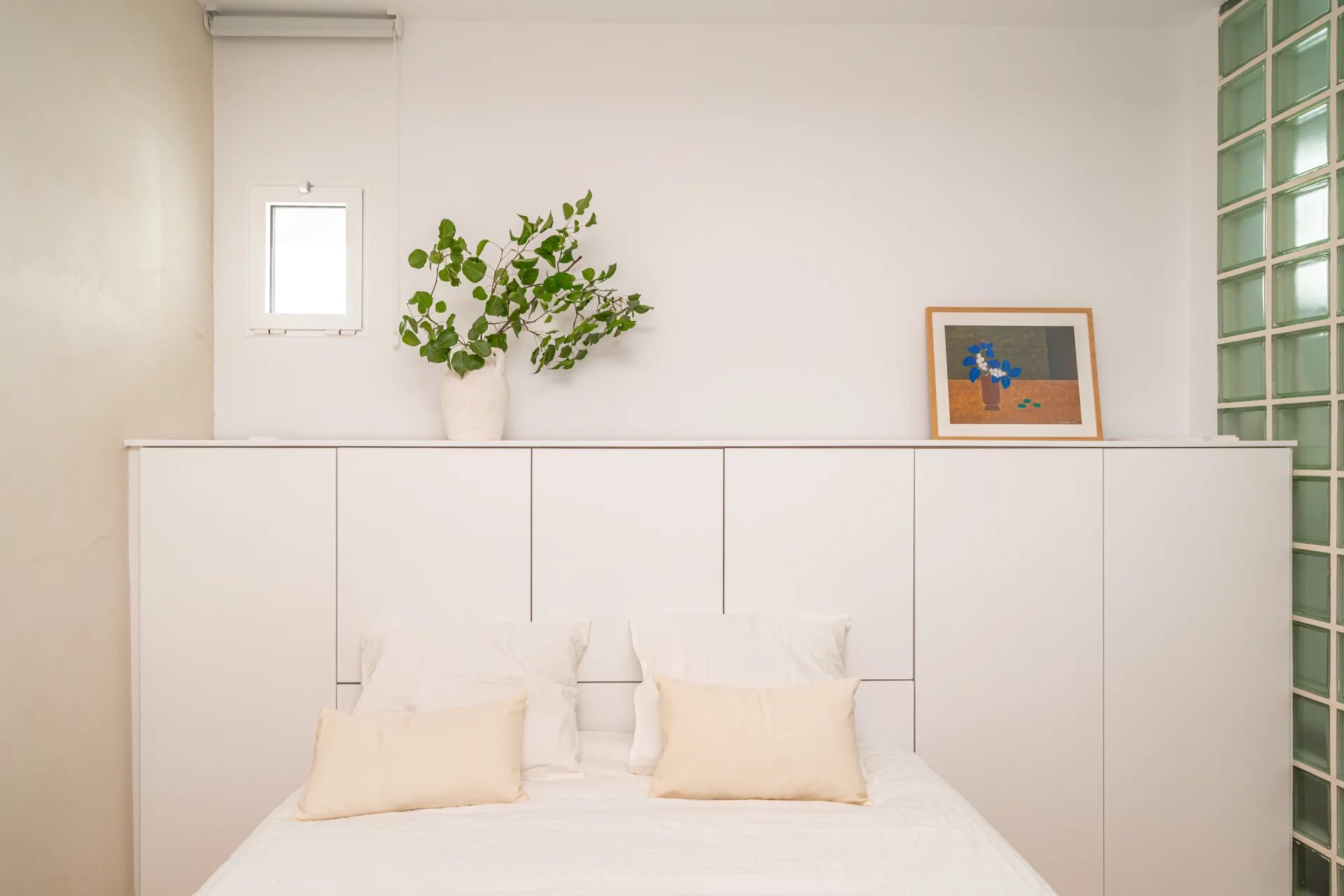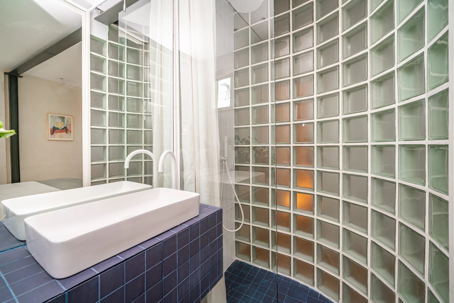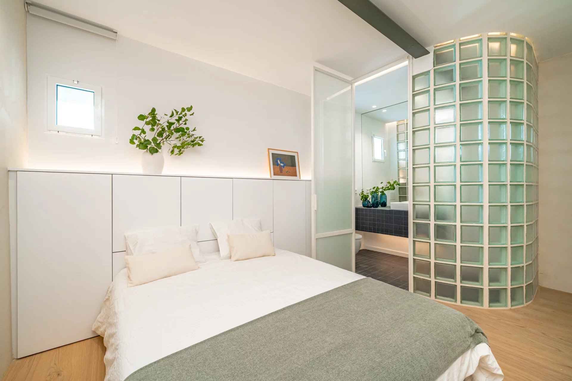 The apartment features a charming living room with a balcony overlooking the street, next to which there is a modular glass-enclosed room with a hidden bed that can serve as a guest bedroom or office. The fully equipped kitchen includes an island and dining area. There are also two additional bedrooms and two bathrooms, the main one en suite.
