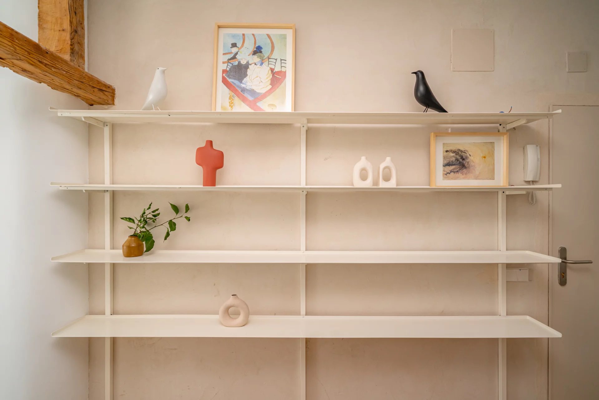 The property includes multiple distinctive details: original structural wooden pillars and beams, a warm lighting design, custom-made furniture, Italian-tile showers, and more.