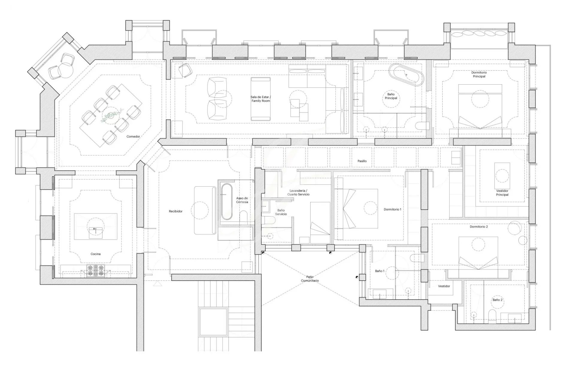 One possible layout would be to make 3 large bedrooms with en-suite bathrooms and 1 service bedroom. In this configuration there would be a large dining room in the corner, an exterior 20 sqm kitchen and a large living room also exterior.
