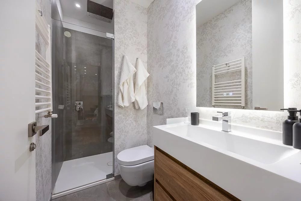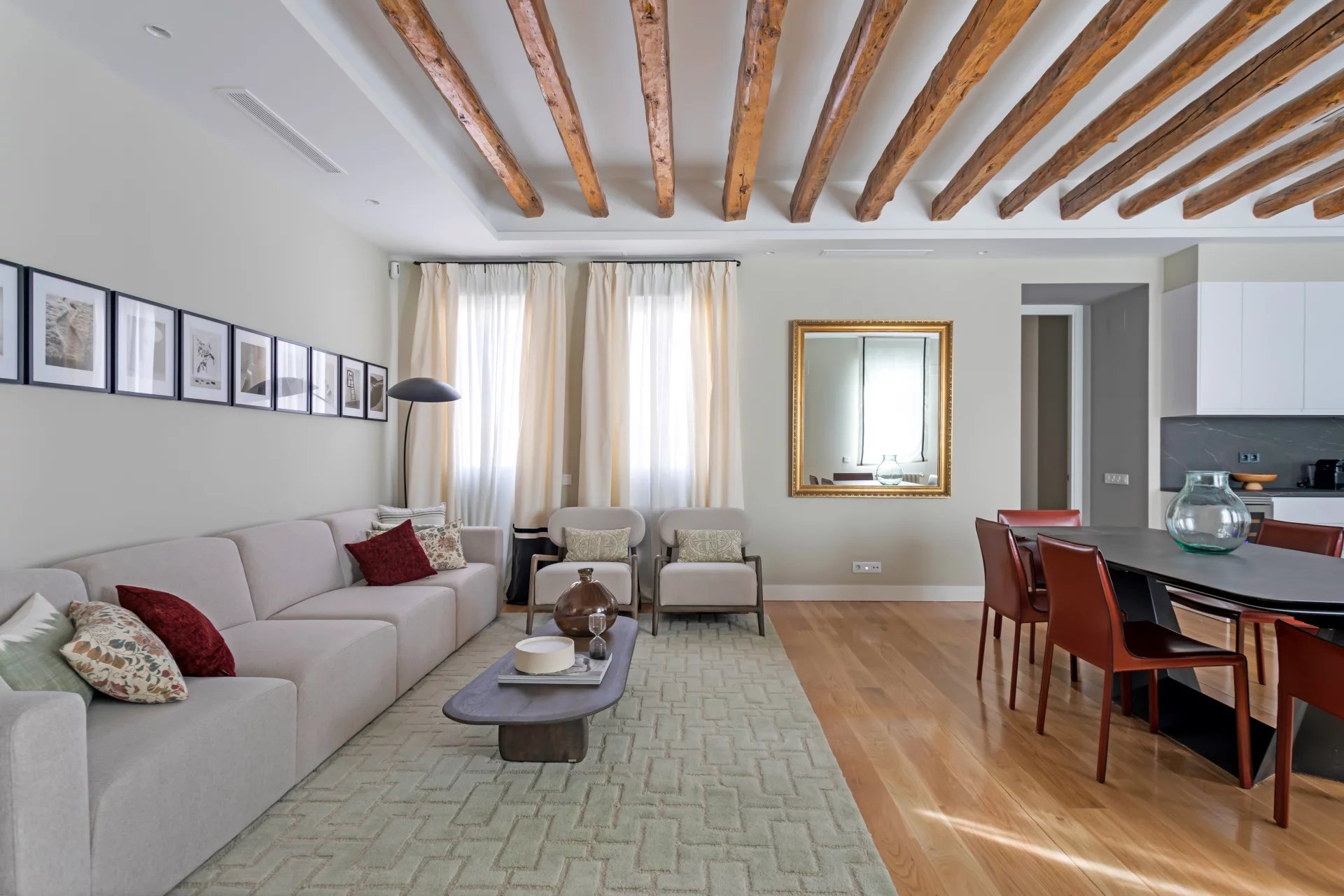 Spectacular designer apartment with a fantastic distribution completely renovated, three large bedrooms en suite, three bathrooms, guest toilet, laundry area and three separate living rooms, one of them with fully furnished kitchenette with high-end appliances. Centralized air conditioning hot and cold.