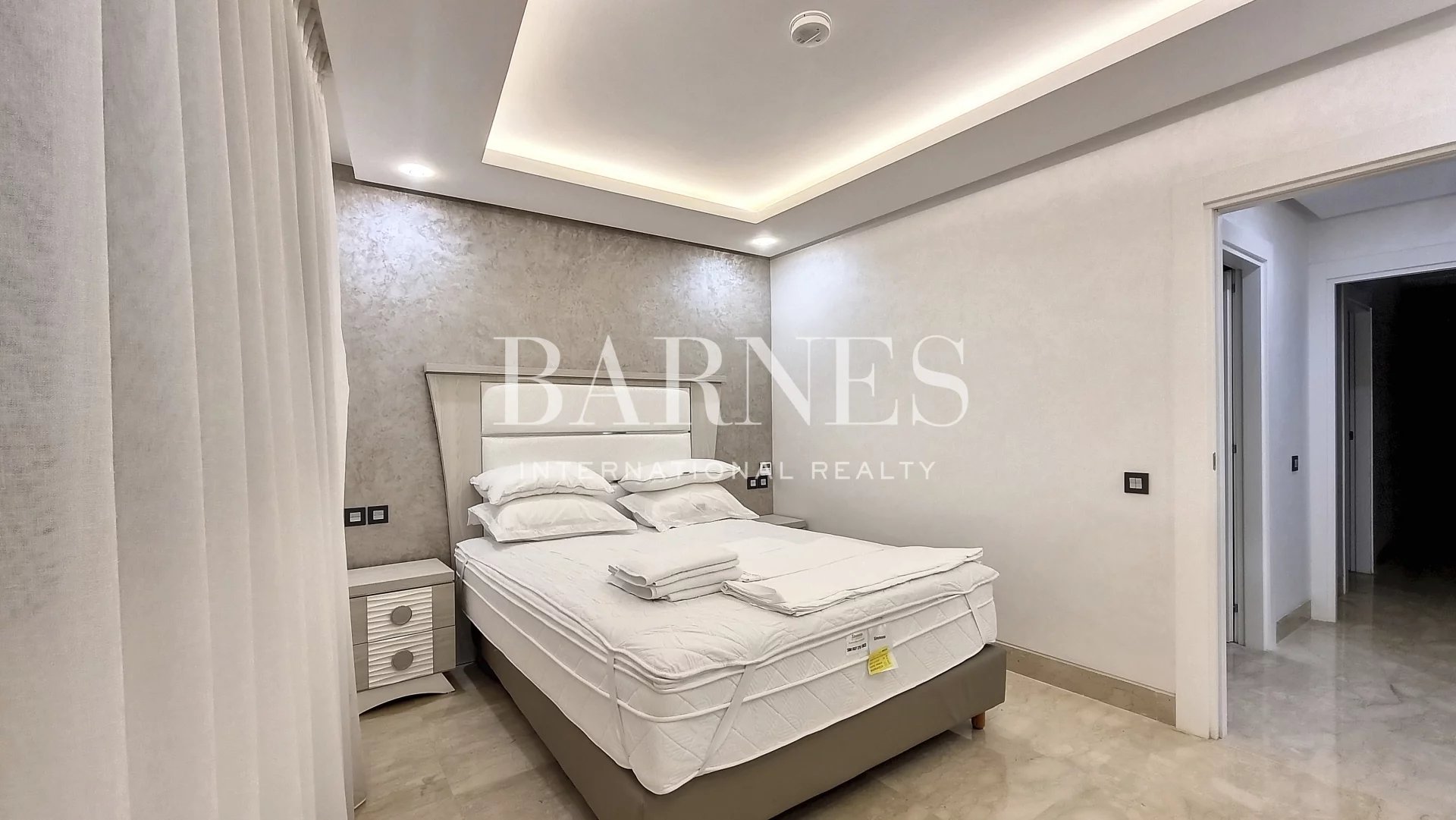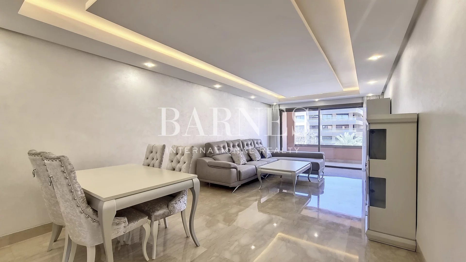 "Barnes Marrakech offers you a charming furnished apartment of 100m2 in a new building. It consists of a fully equipped kitchen (fridge, oven, dishwasher, microwave, washing machine) from the brand Bosch, two bedrooms with two bathrooms, a terrace and a parking space. Quality materials were used during construction. Residence of 14 apartments with surveillance camera."
