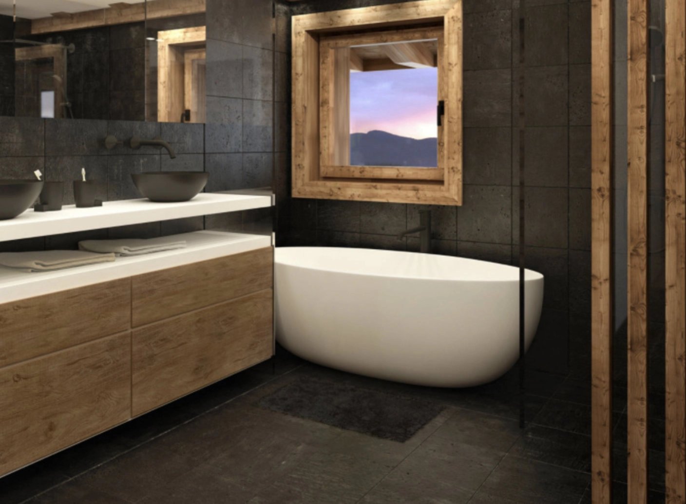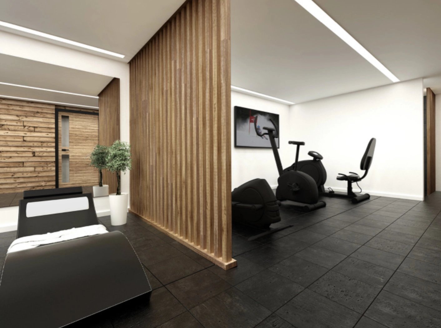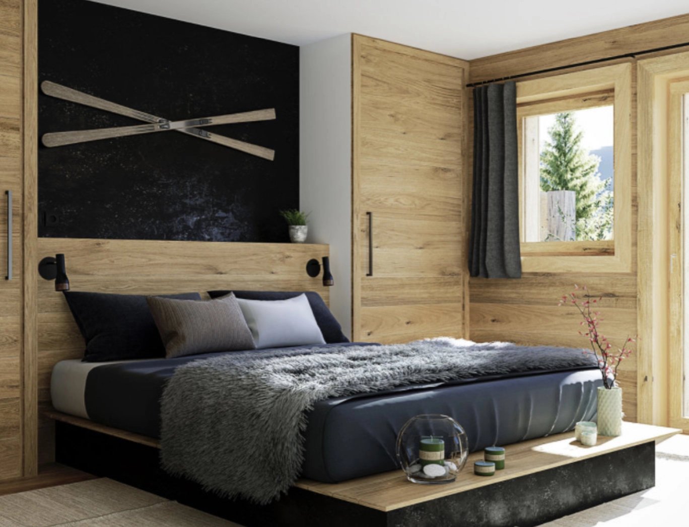 In the centre of this property sits a fully equipped kitchen opening onto a spacious cathedral ceilinged living room with fireplace in an alpine yet contemporary atmosphere.