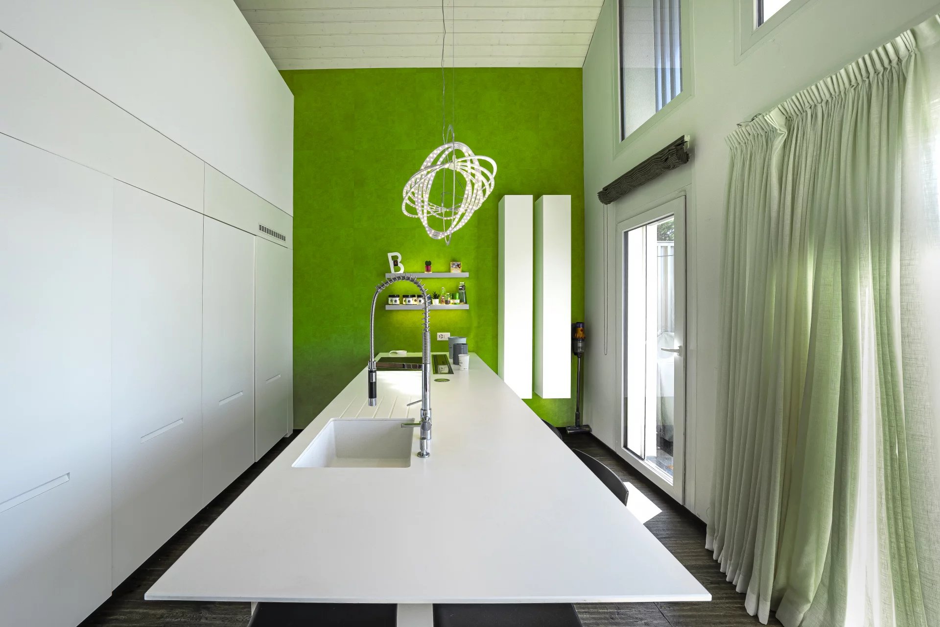 A generous living room with a fully equipped open-plan kitchen, enhanced by an impressive 5 m ceiling height.