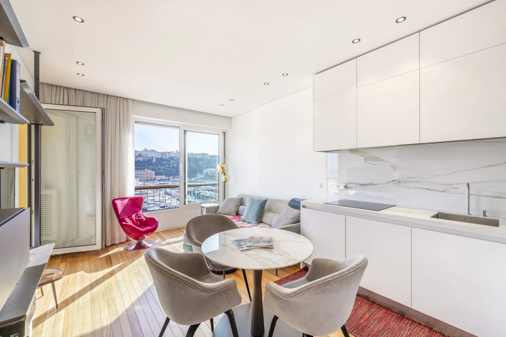 This superb 2-room apartment has been completely renovated and furnished with quality materials, also benefiting from an integrated home automation system. It consists of an entrance with cupboards, a living room with an equipped kitchen opening onto a beautiful loggia offering a panoramic view of Port Hercule, the Formula 1 circuit and the Rock. The sleeping area includes a full shower room, numerous storage spaces and a bedroom opening onto the loggia.