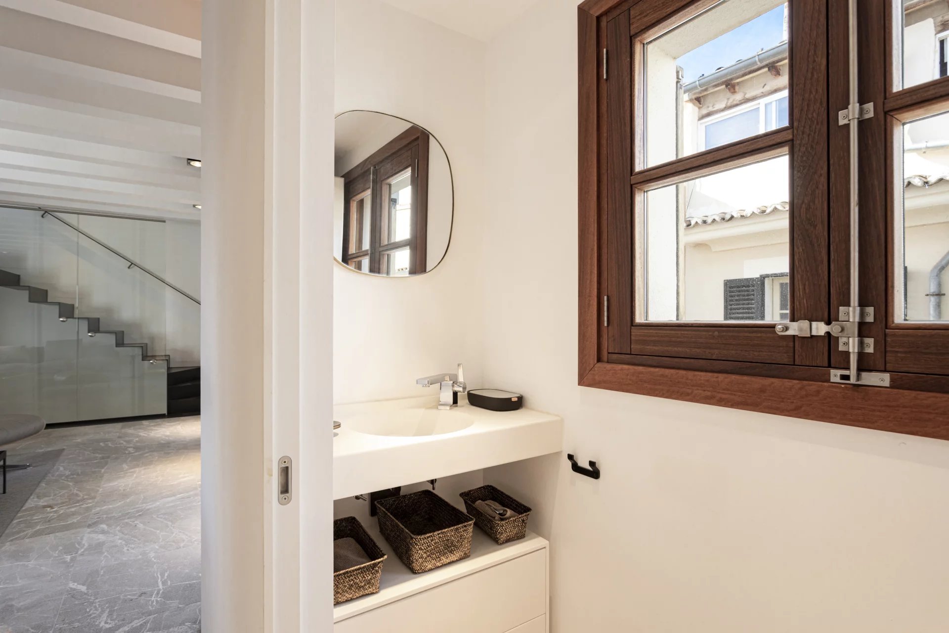 In the very heart of Palma’s Old Town, just steps from Plaça Banc de l’Oli and a stone’s throw from the emblematic Plaza Cort, lies this newly created duplex penthouse — an architectural gem that blends the city’s historic essence with a contemporary aesthetic of clean lines and noble materials. Peacefully tucked away yet close to everything, it offers the perfect balance between tradition and modern living. The building has undergone a complete and meticulous refurbishment, executed with masterful craftsmanship and attention to detail. Its interior exudes sophistication and serenity, combining natural stone, herringbone wood flooring, and a warm palette that conveys calm and timeless elegance.