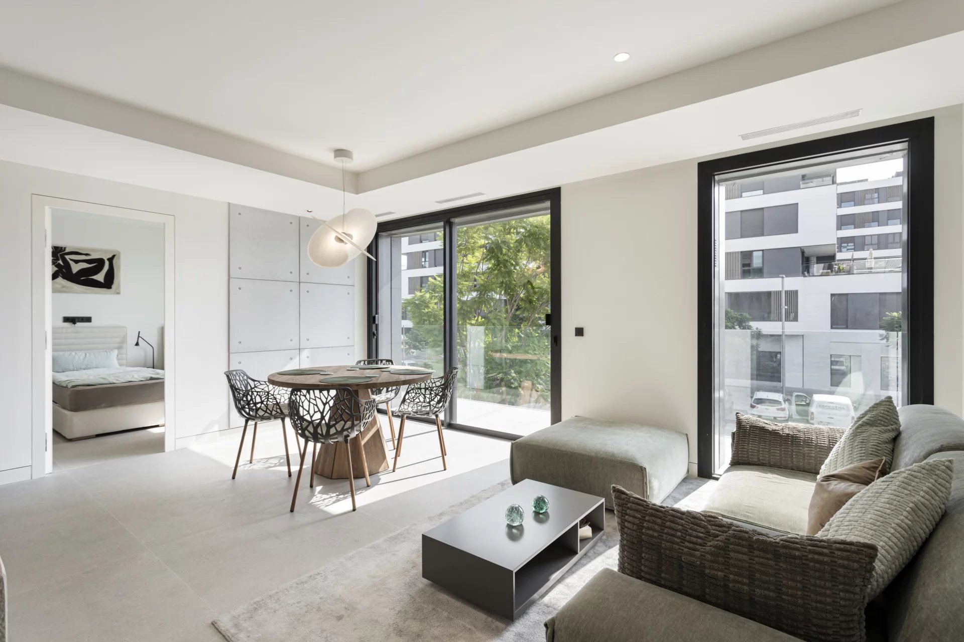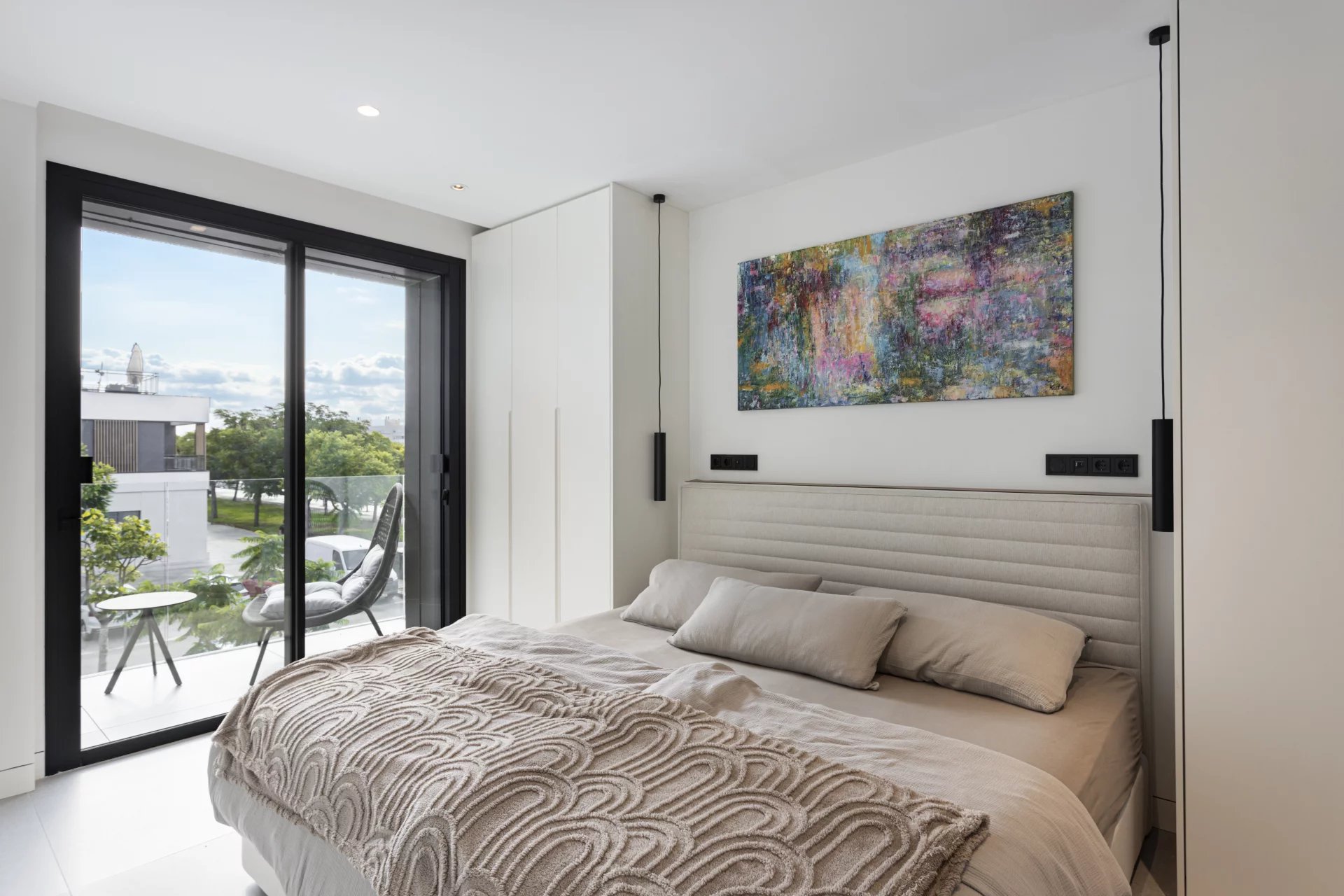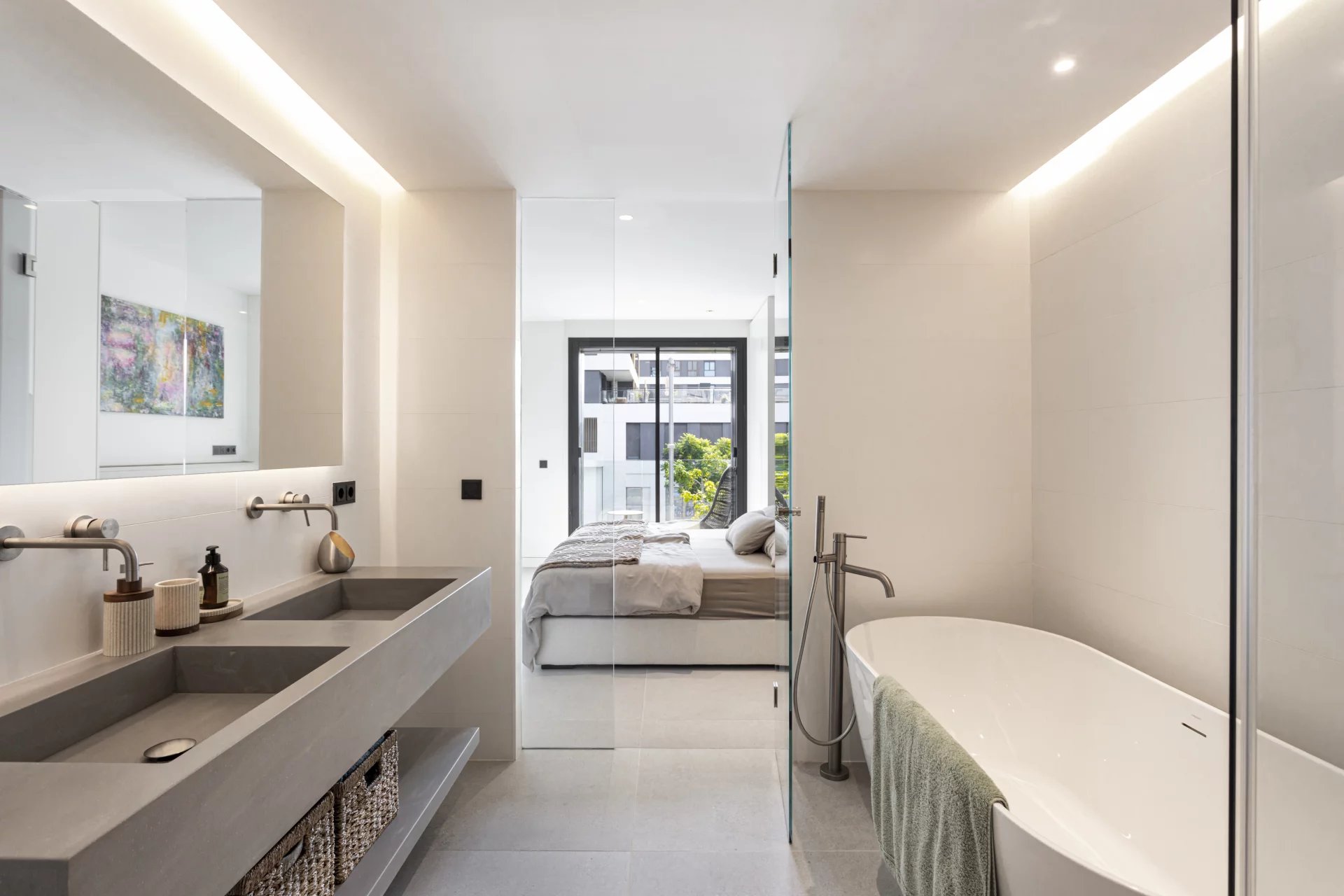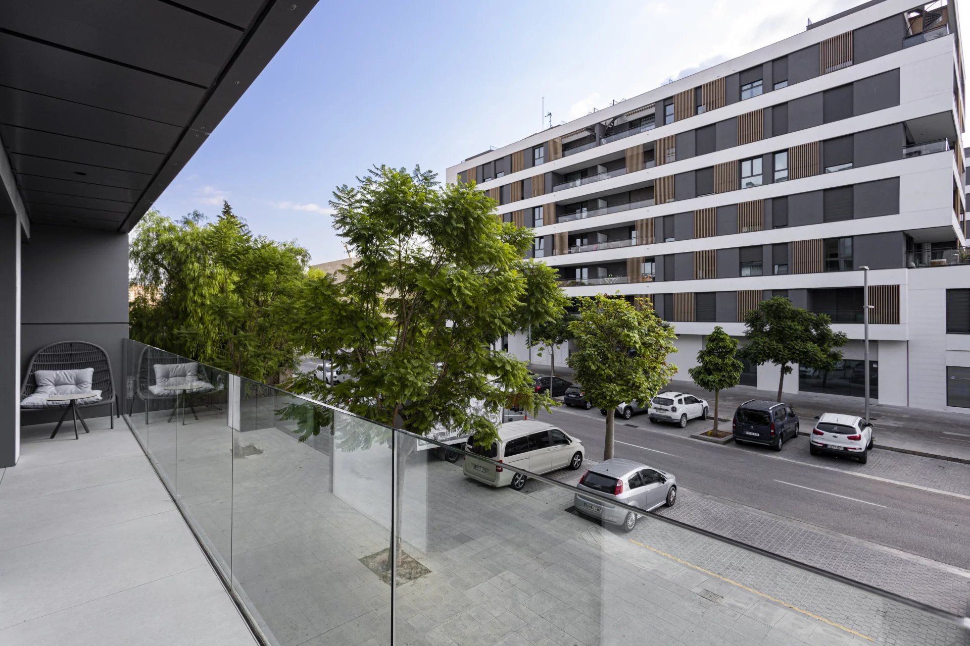 This exclusive newly built residential complex is located very close to the beach and the Portixol harbor, just 7 minutes from Palma airport and a short stroll from shopping areas and amenities in the Old Town. Designed by architect Andreu Crespí (CMV Architects), the building meets the highest standards in design, quality of materials, comfort, and sustainability, boasting an energy certificate of class A and geothermal heating. The complex houses a total of 81 apartments, including 10 penthouses, spread over six floors. This unit on the first floor features an open space that integrates the living room and dining area, as well as a custom kitchen and furniture from Espacio Home Design. It includes a private terrace of 10 m², two bedrooms each with an en-suite bathroom, a guest toilet, and an independent laundry room. Notable features include underfloor heating, centralized air conditioning, and smart home technology. The price includes a parking space of 11 m² and a private storage room of 4 m².