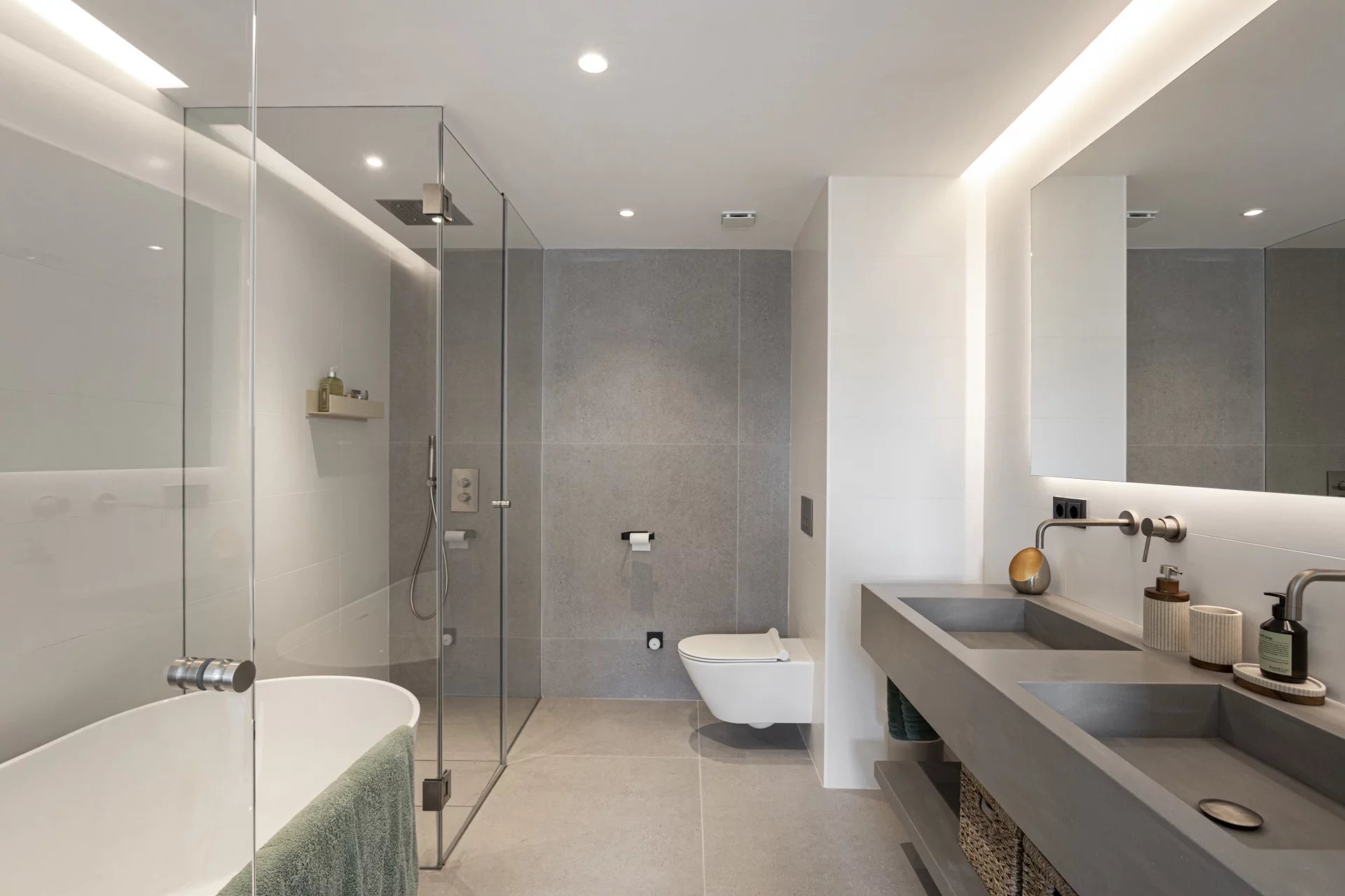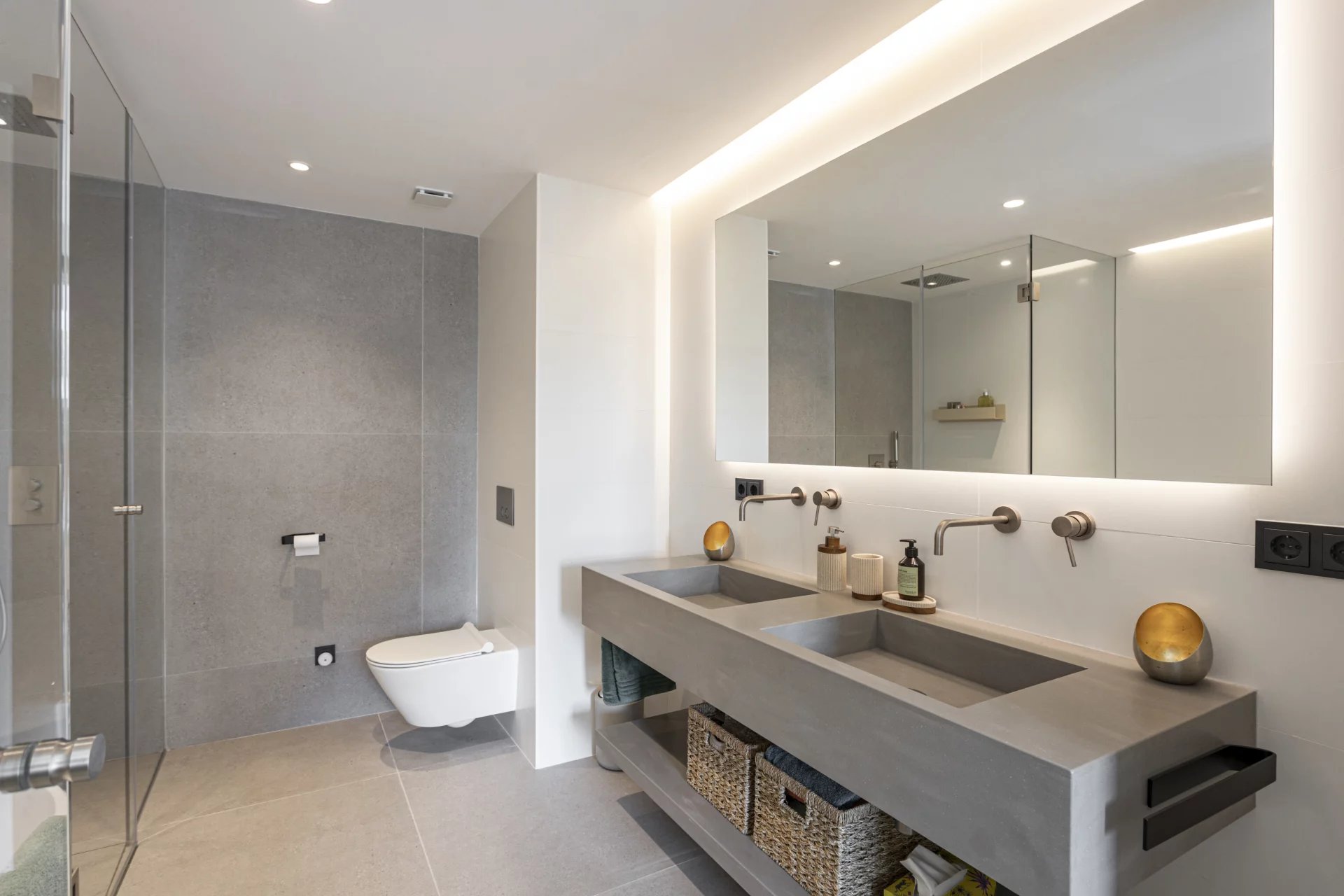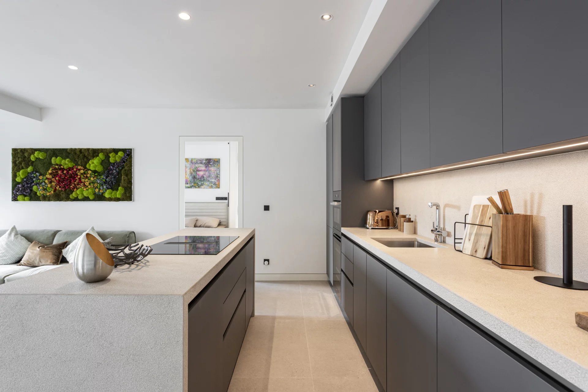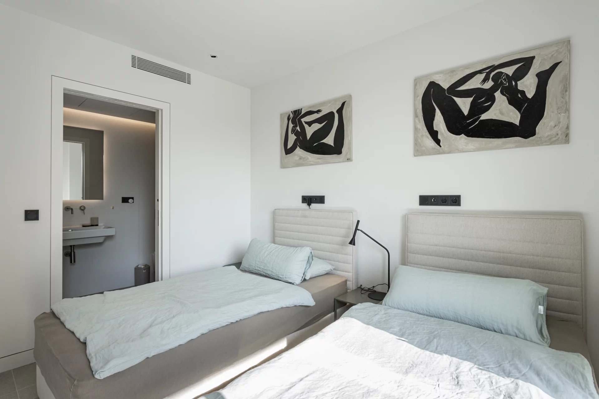 This exclusive newly built residential complex is located very close to the beach and the Portixol harbor, just 7 minutes from Palma airport and a short stroll from shopping areas and amenities in the Old Town. Designed by architect Andreu Crespí (CMV Architects), the building meets the highest standards in design, quality of materials, comfort, and sustainability, boasting an energy certificate of class A and geothermal heating. The complex houses a total of 81 apartments, including 10 penthouses, spread over six floors. This unit on the first floor features an open space that integrates the living room and dining area, as well as a custom kitchen and furniture from Espacio Home Design. It includes a private terrace of 10 m², two bedrooms each with an en-suite bathroom, a guest toilet, and an independent laundry room. Notable features include underfloor heating, centralized air conditioning, and smart home technology. The price includes a parking space of 11 m² and a private storage room of 4 m².