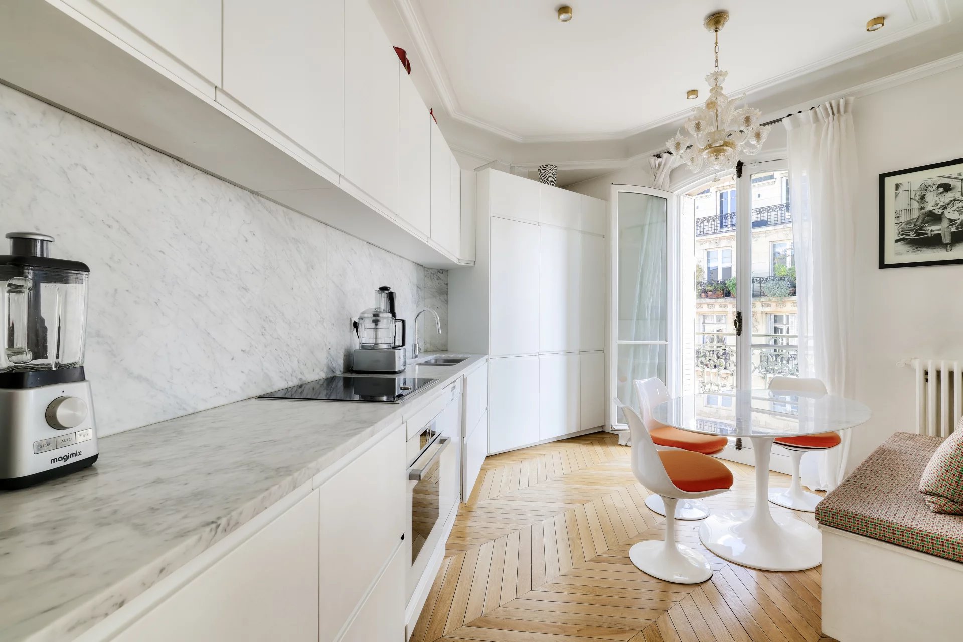 This apartment is in very good condition, with spacious rooms, herringbone parquet flooring and attractive moldings.
