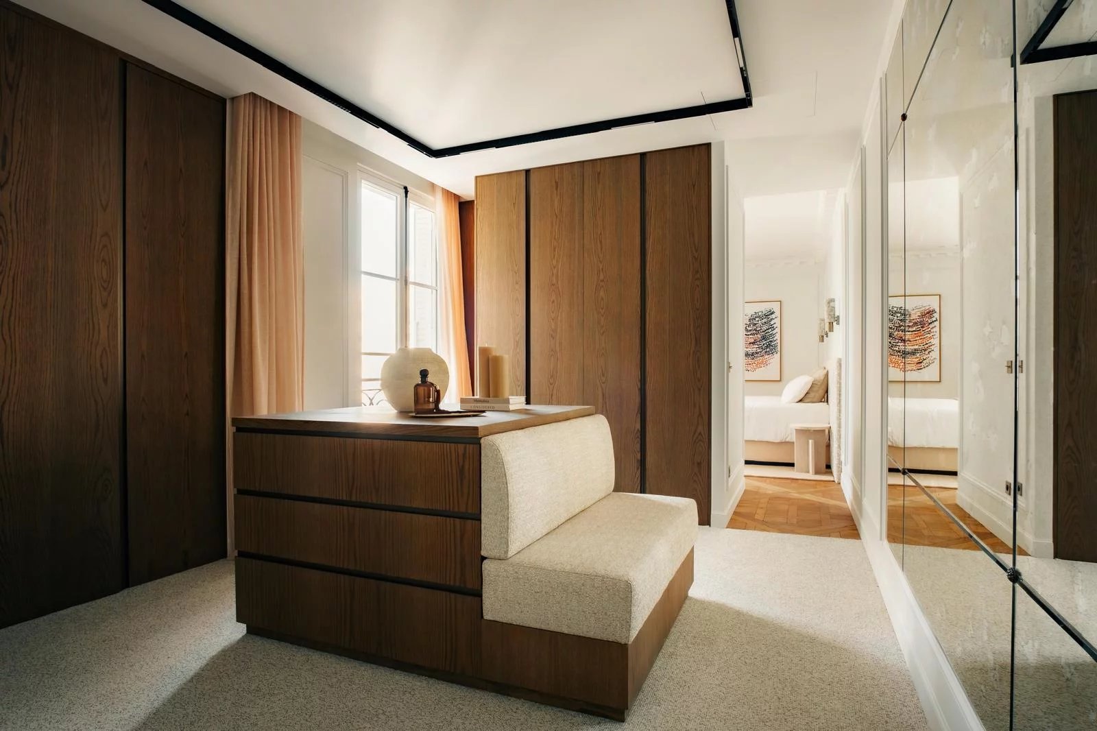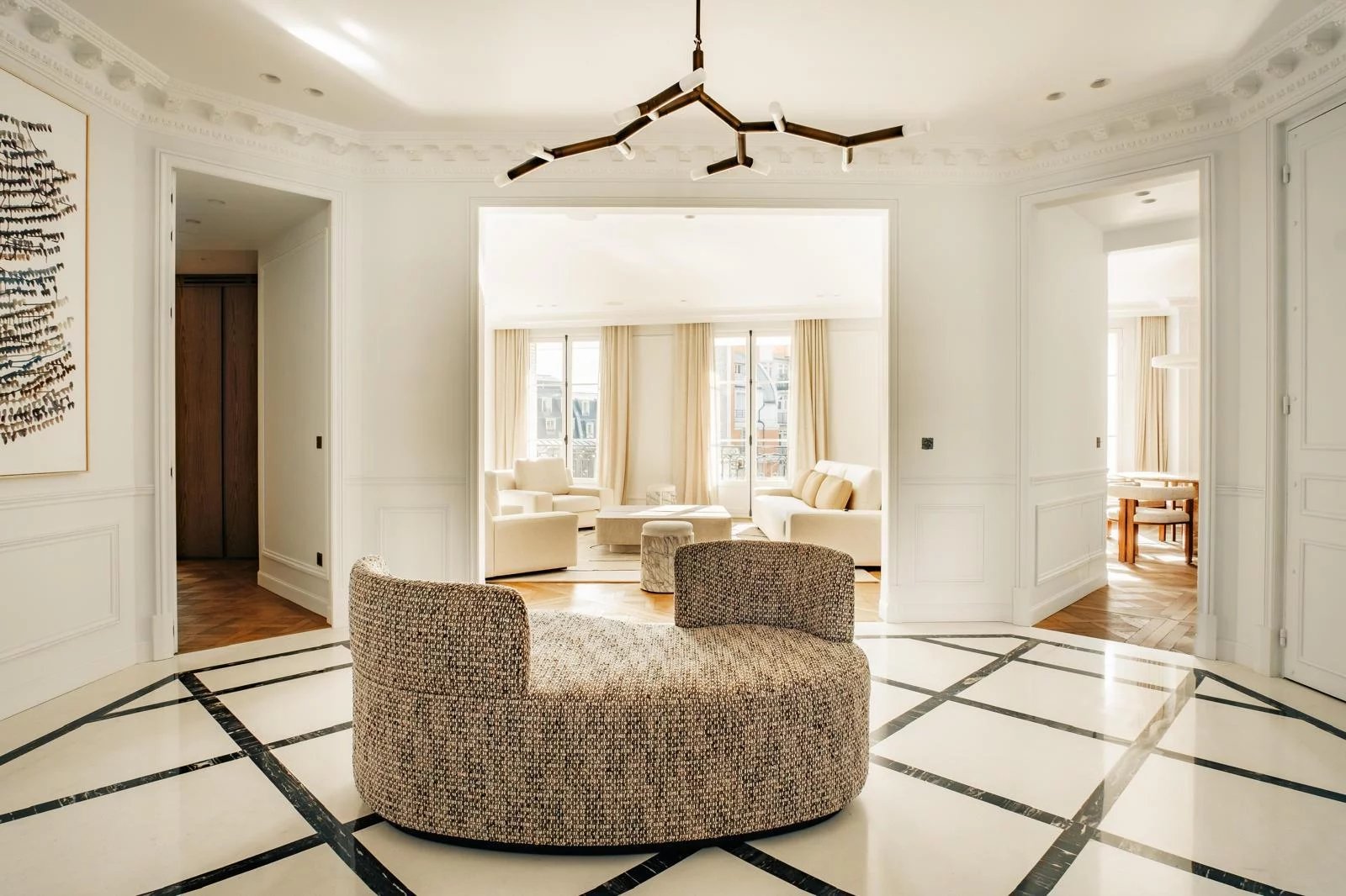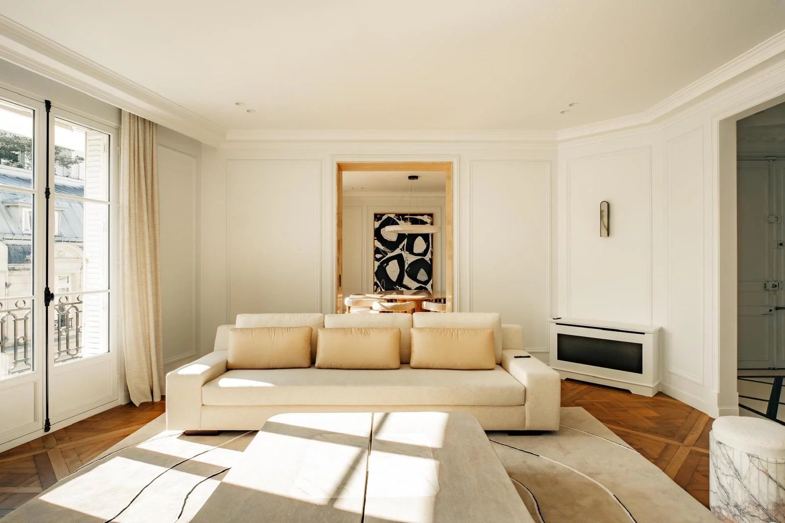 On the fifth floor of a prestigious period building, this fully air-conditioned 220 sq.m (Carrez law) apartment has undergone a complete renovation of exceptional quality, combining noble materials with outstanding craftsmanship, while preserving all the elegance and charm of classic Parisian architecture.