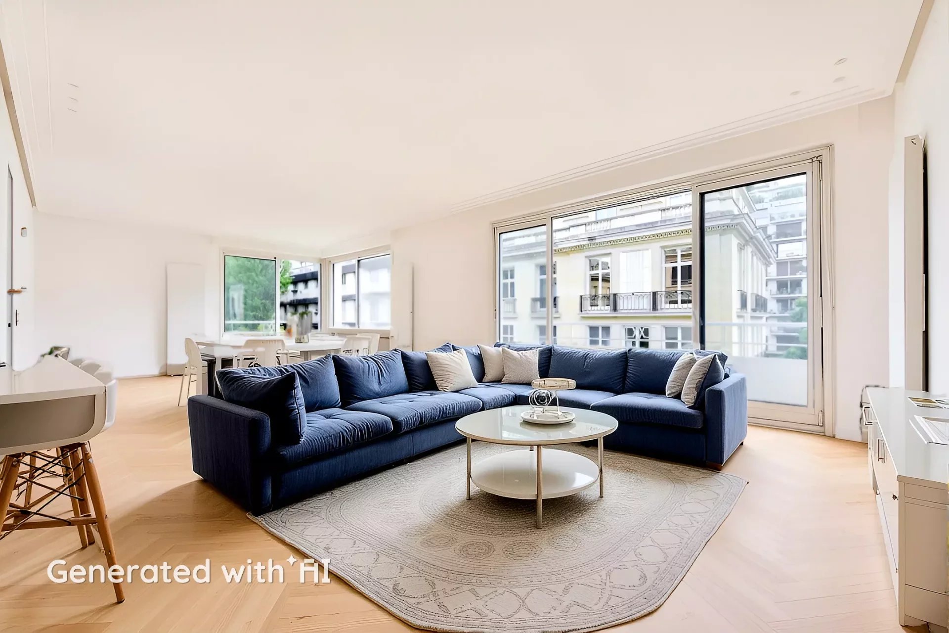 - Living room with dining room opening onto balcony