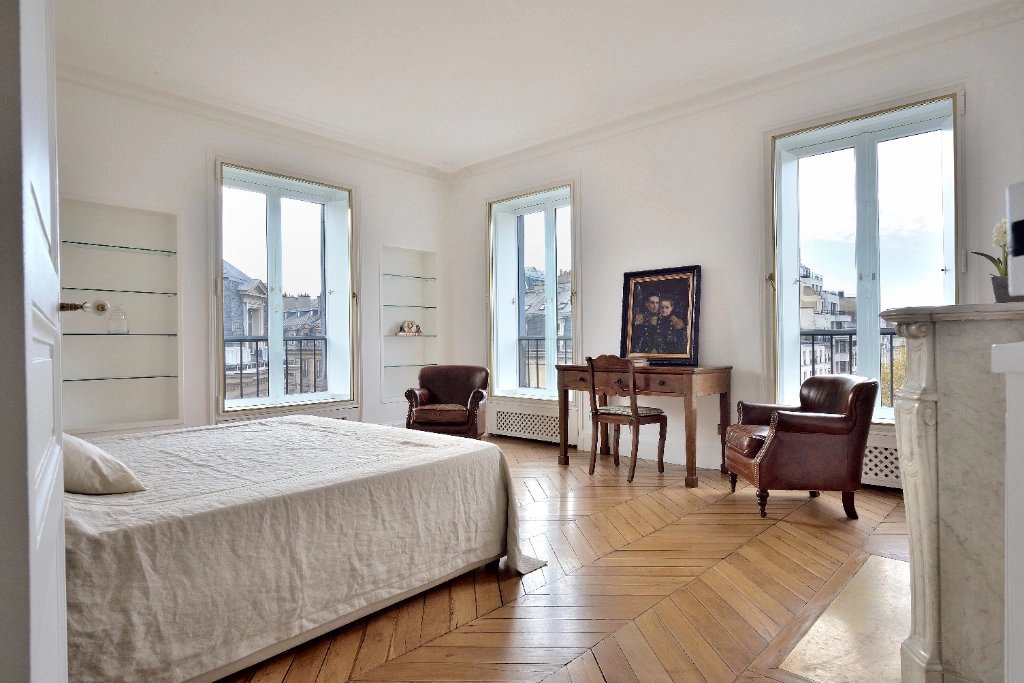 Wonderfully set in the heart of the first and real luxury district of Paris, between rue Royale, Faubourg Saint Honoré and Place de la Concorde, a few steps from the exclusive Palaces, boutiques, restaurants and private clubs, a fabulous 137sqm apartment (annexed to a fully-equipped 17sqm studio flat) almost suspended in the sky and located on the 5th and last floor of a beautiful 1871 building.