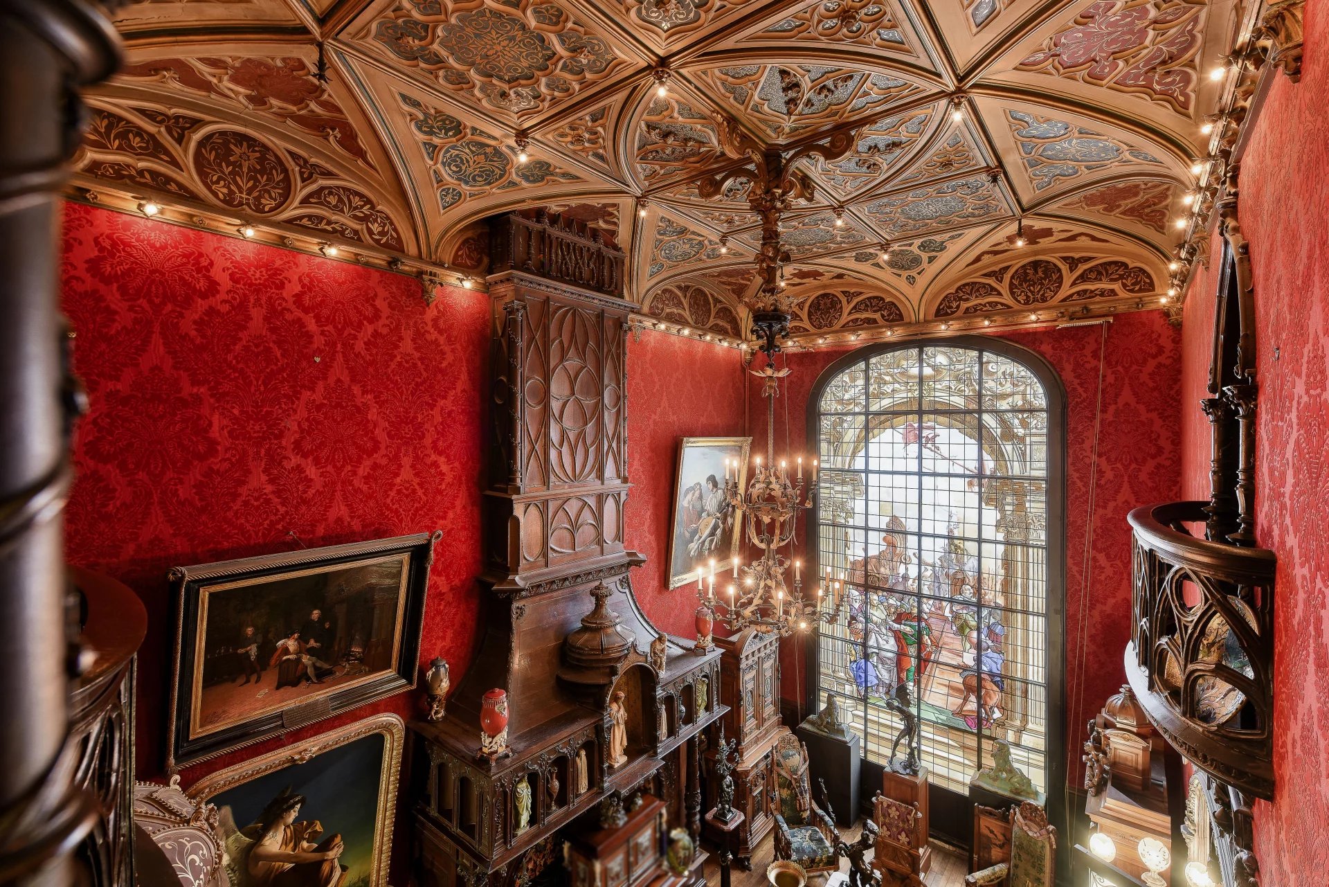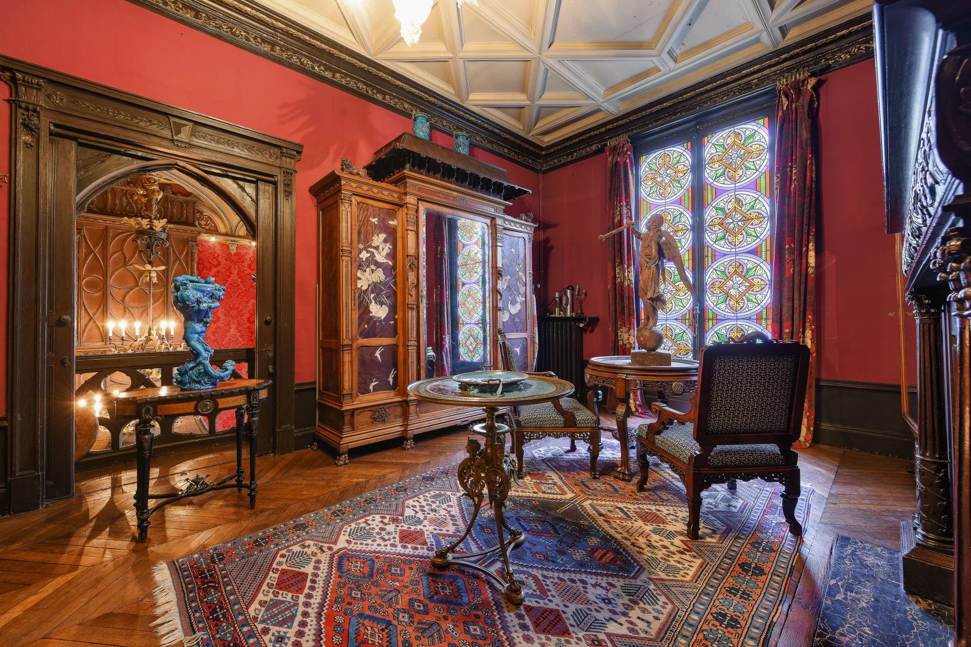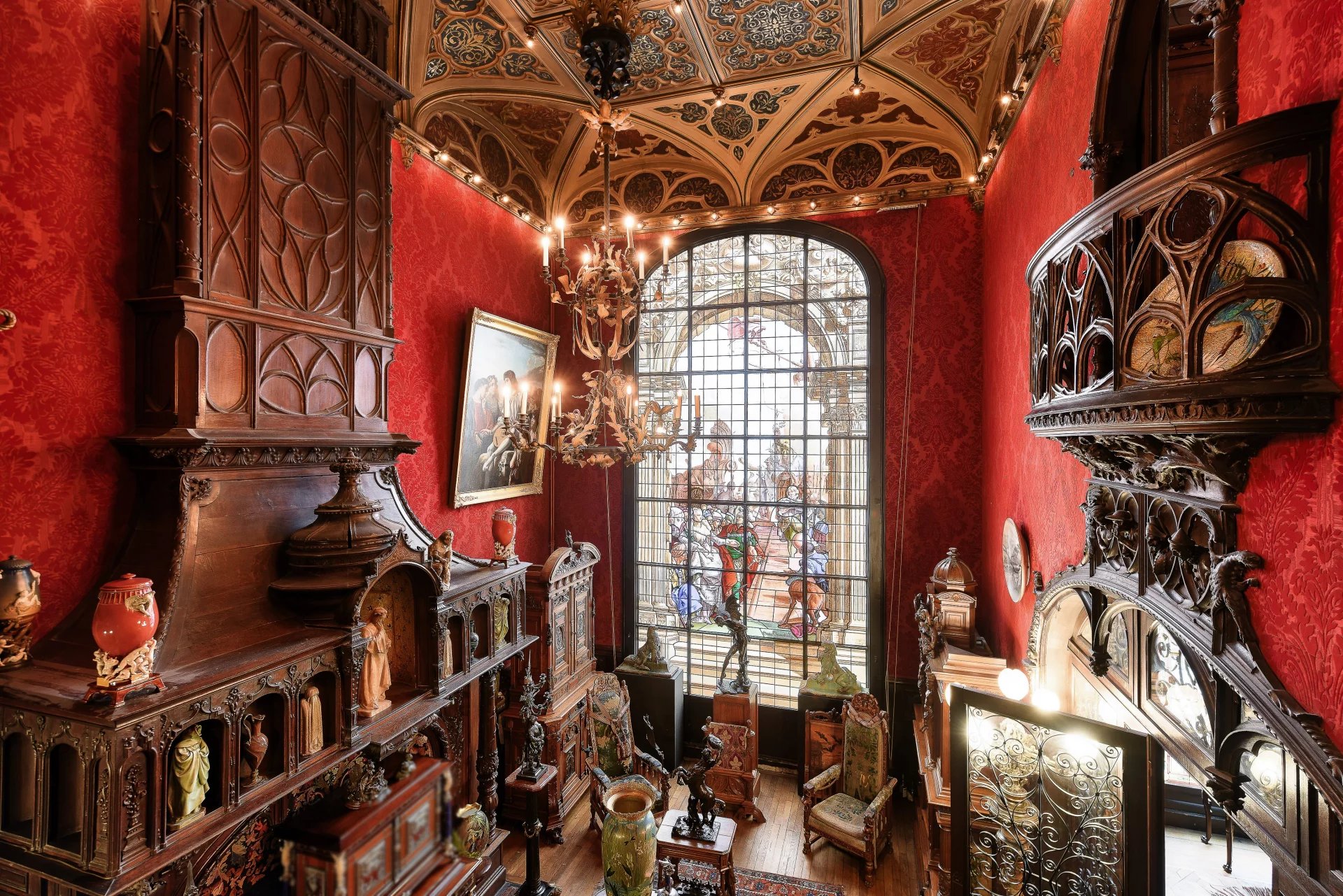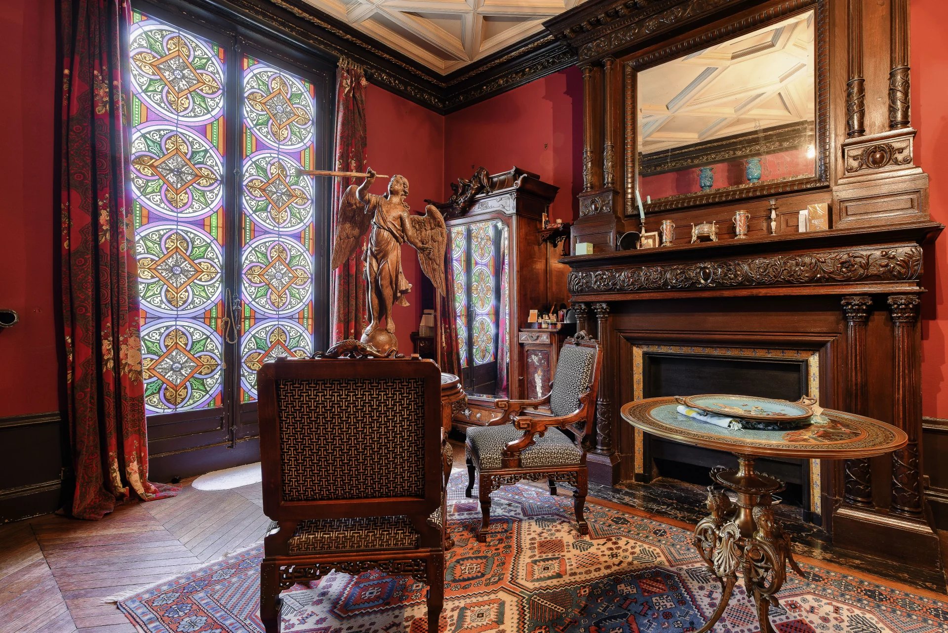 - exceptional drawing room with nearly 8-metre-high ceilings, monumental full-height fireplace and gigantic stained-glass windows