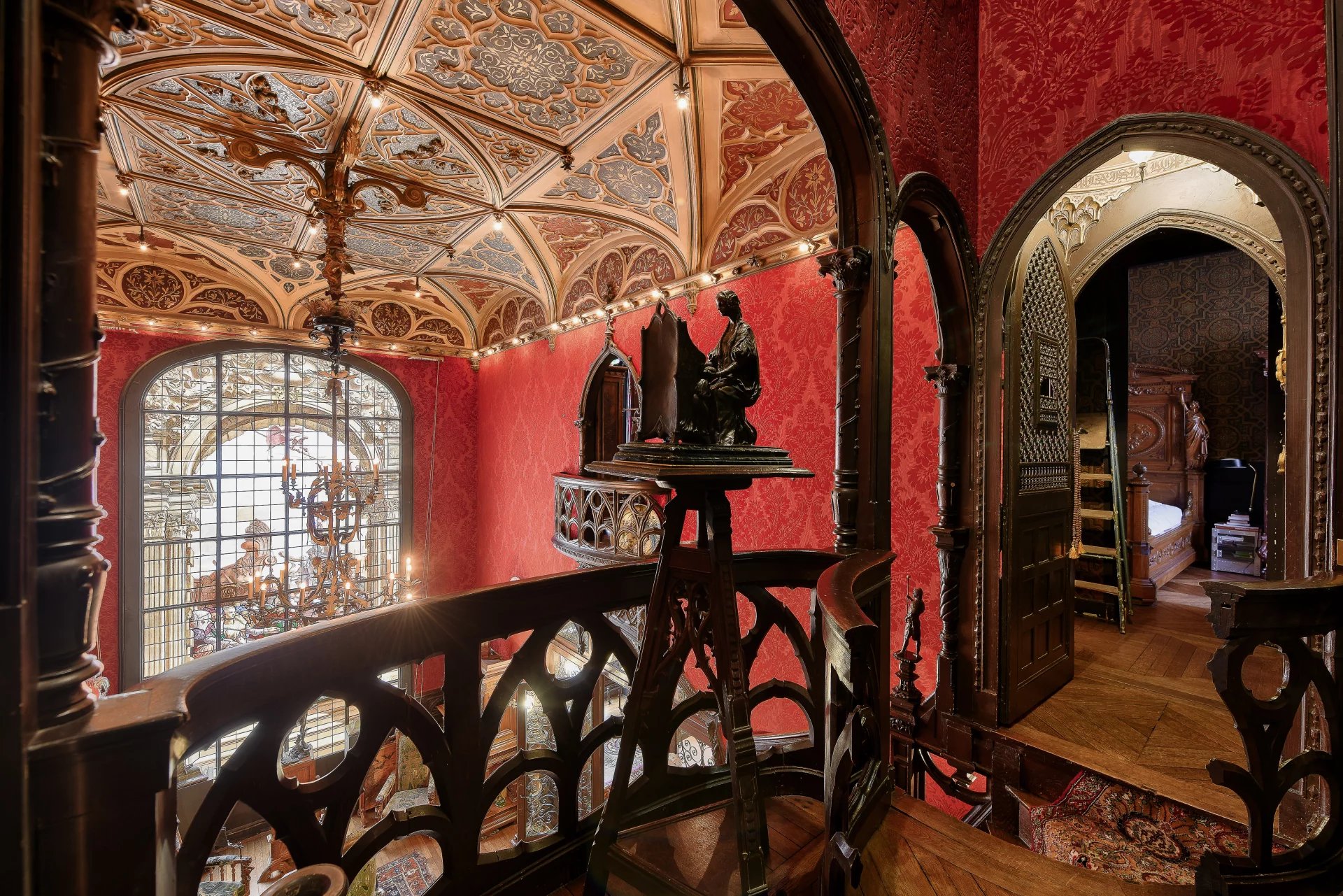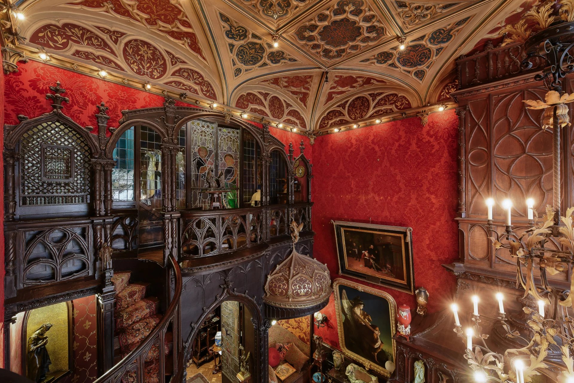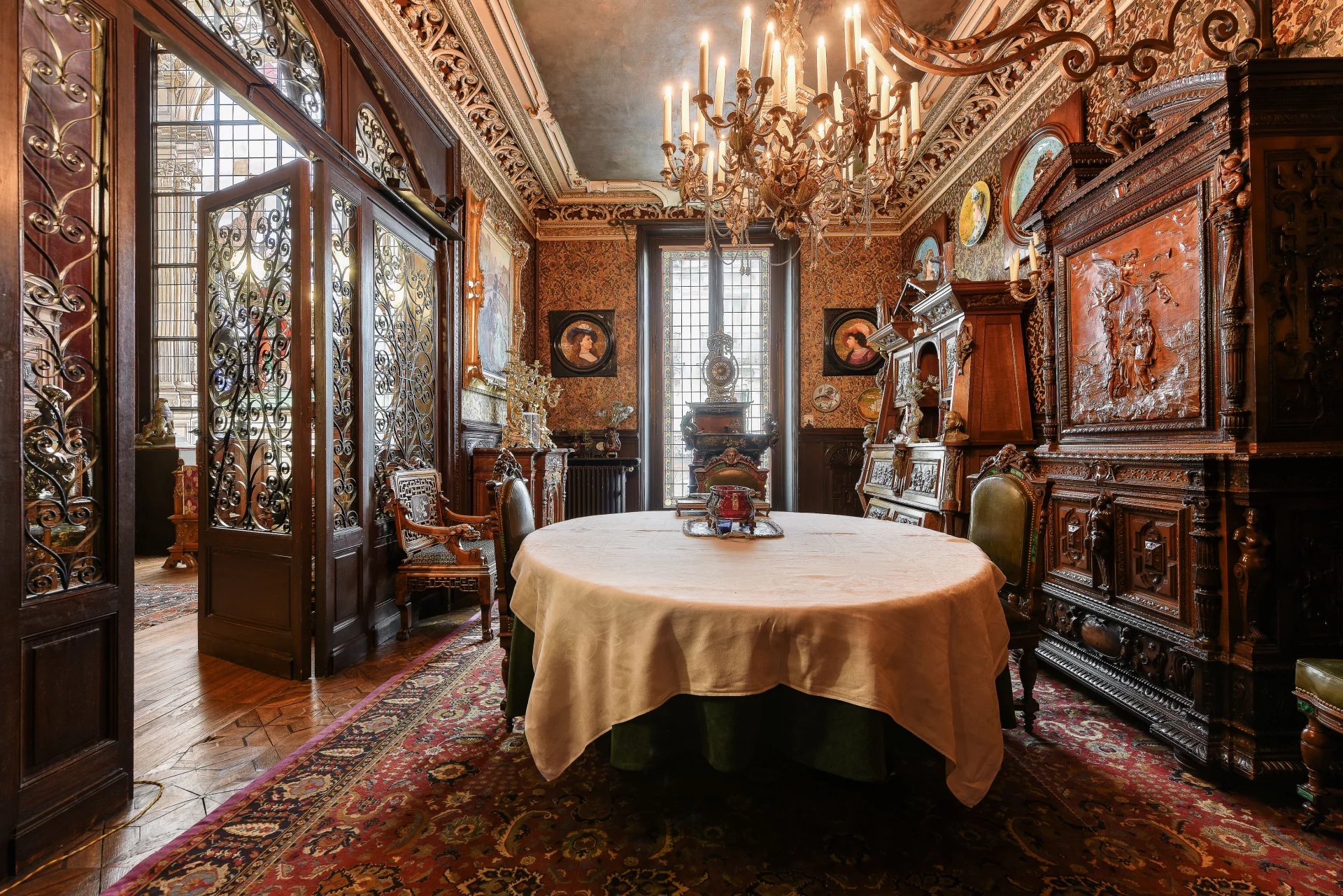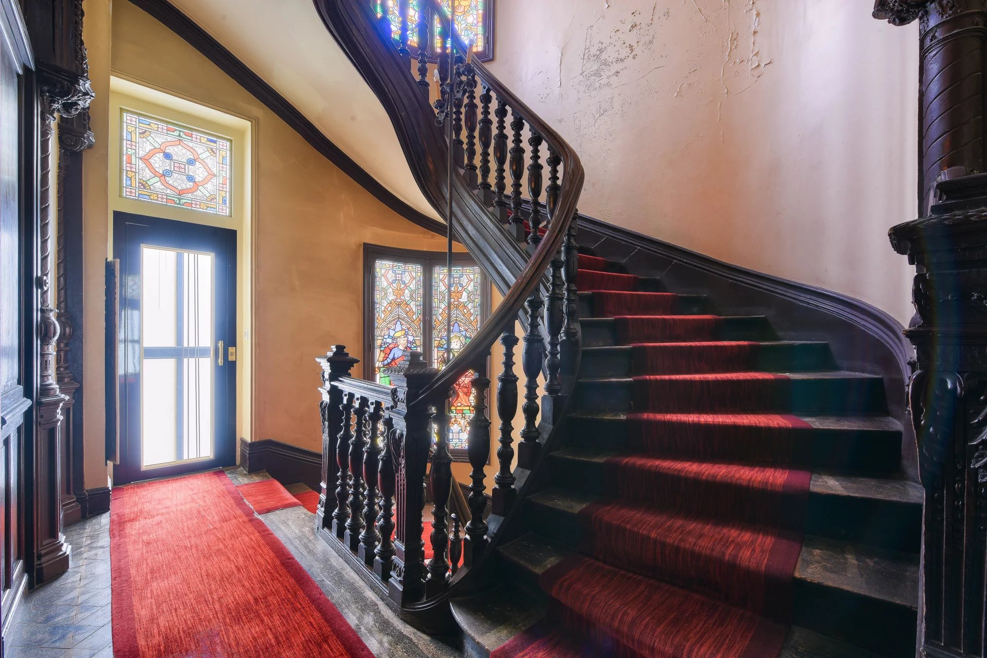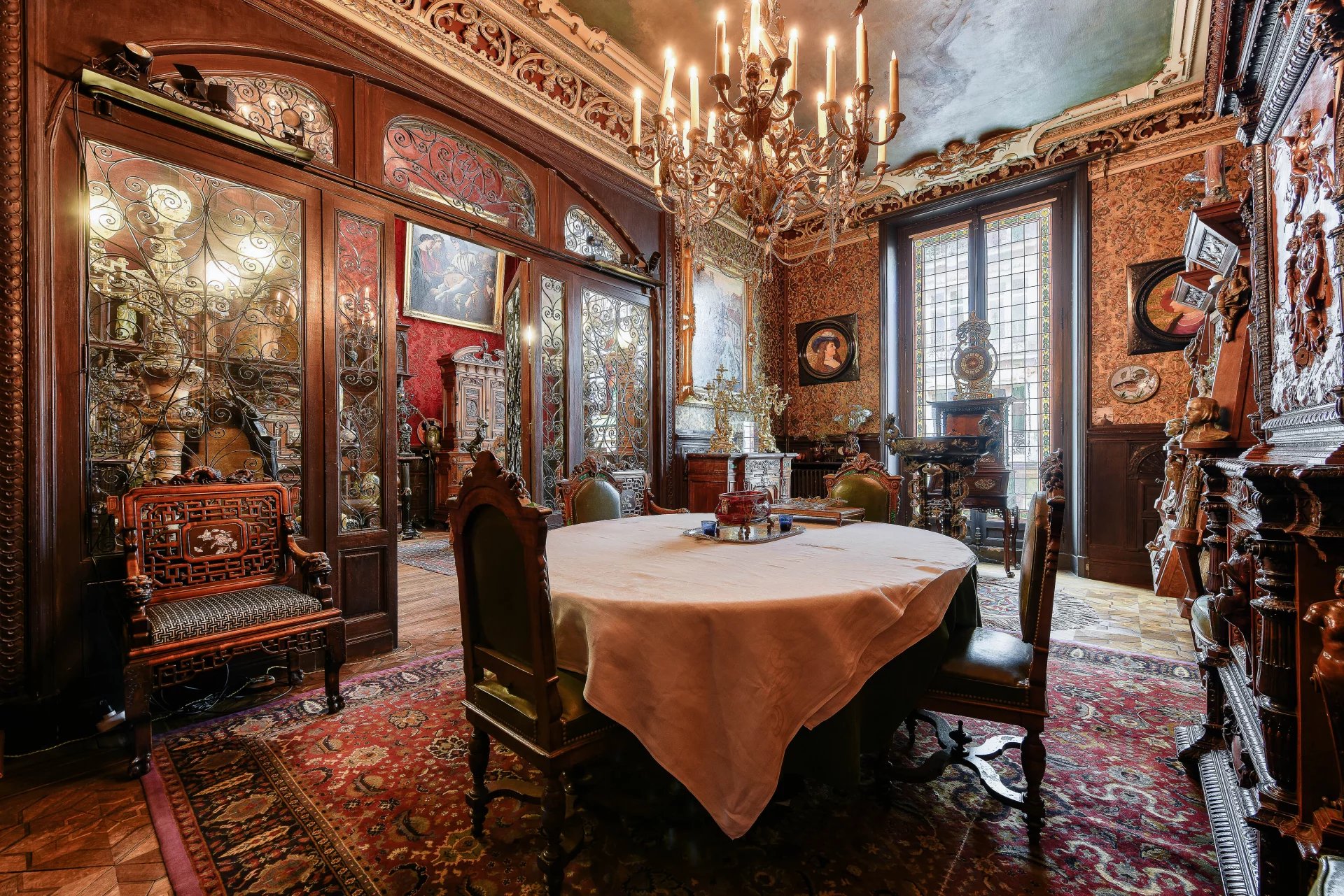 - exceptional drawing room with nearly 8-metre-high ceilings, monumental full-height fireplace and gigantic stained-glass windows