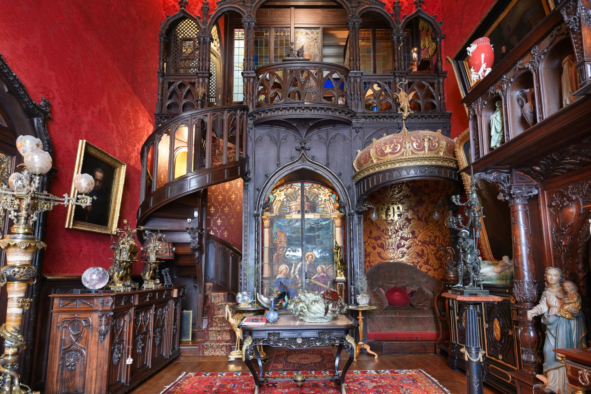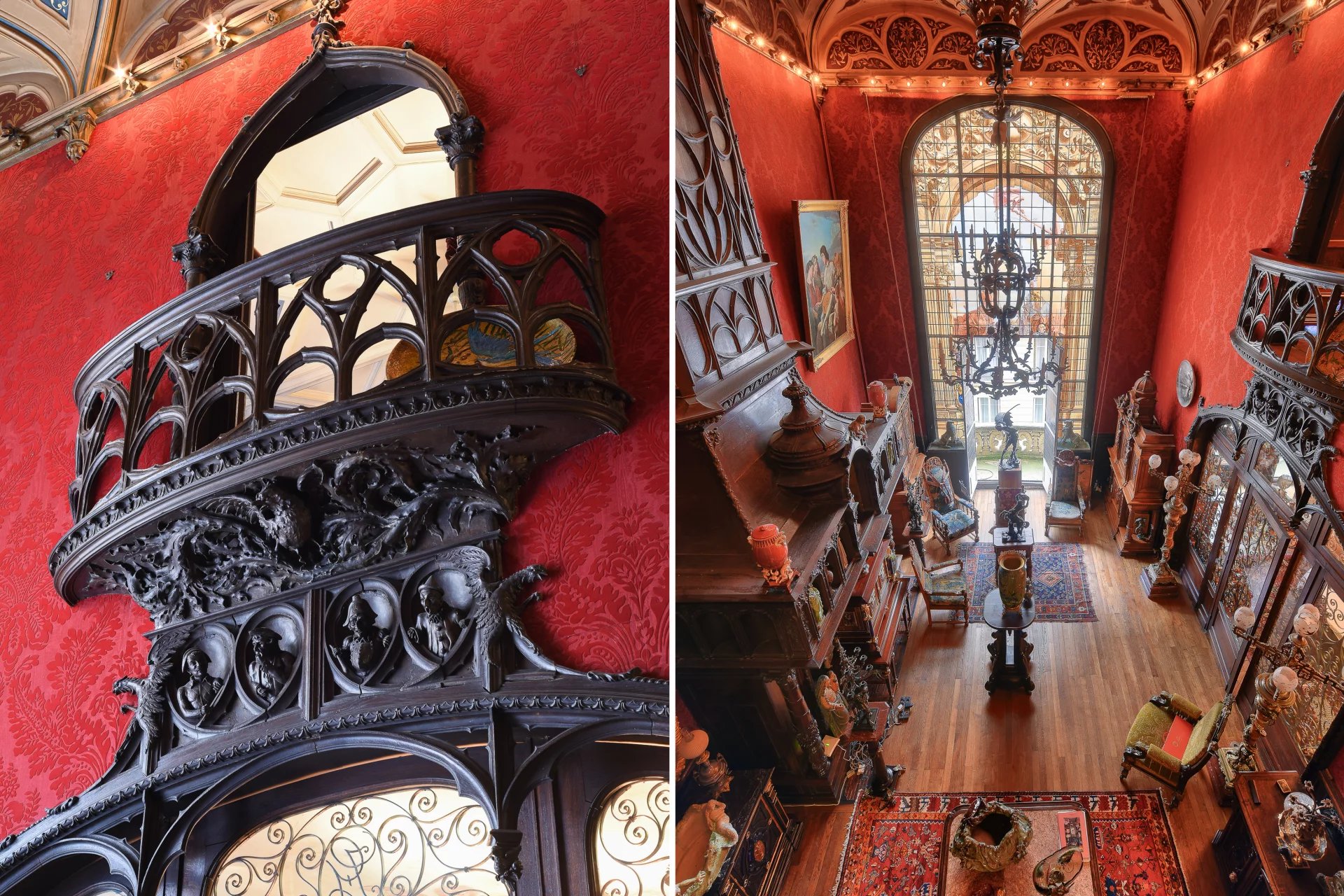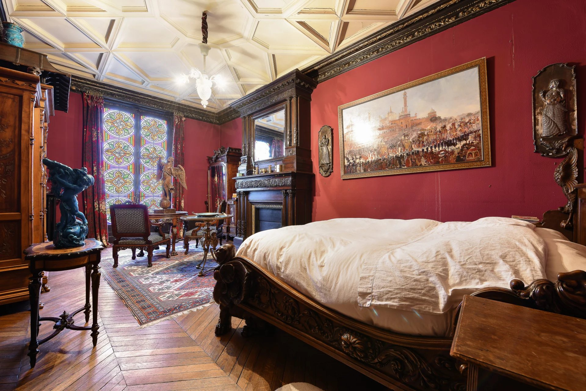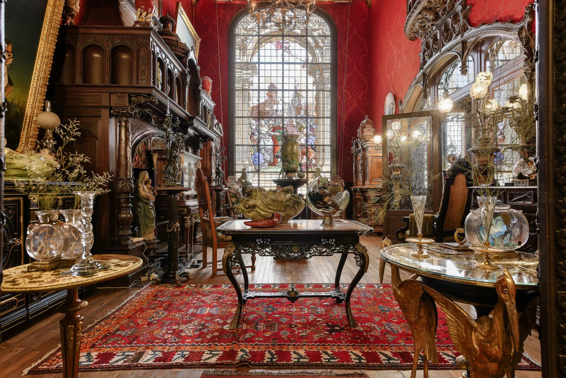 - exceptional drawing room with nearly 8-metre-high ceilings, monumental full-height fireplace and gigantic stained-glass windows