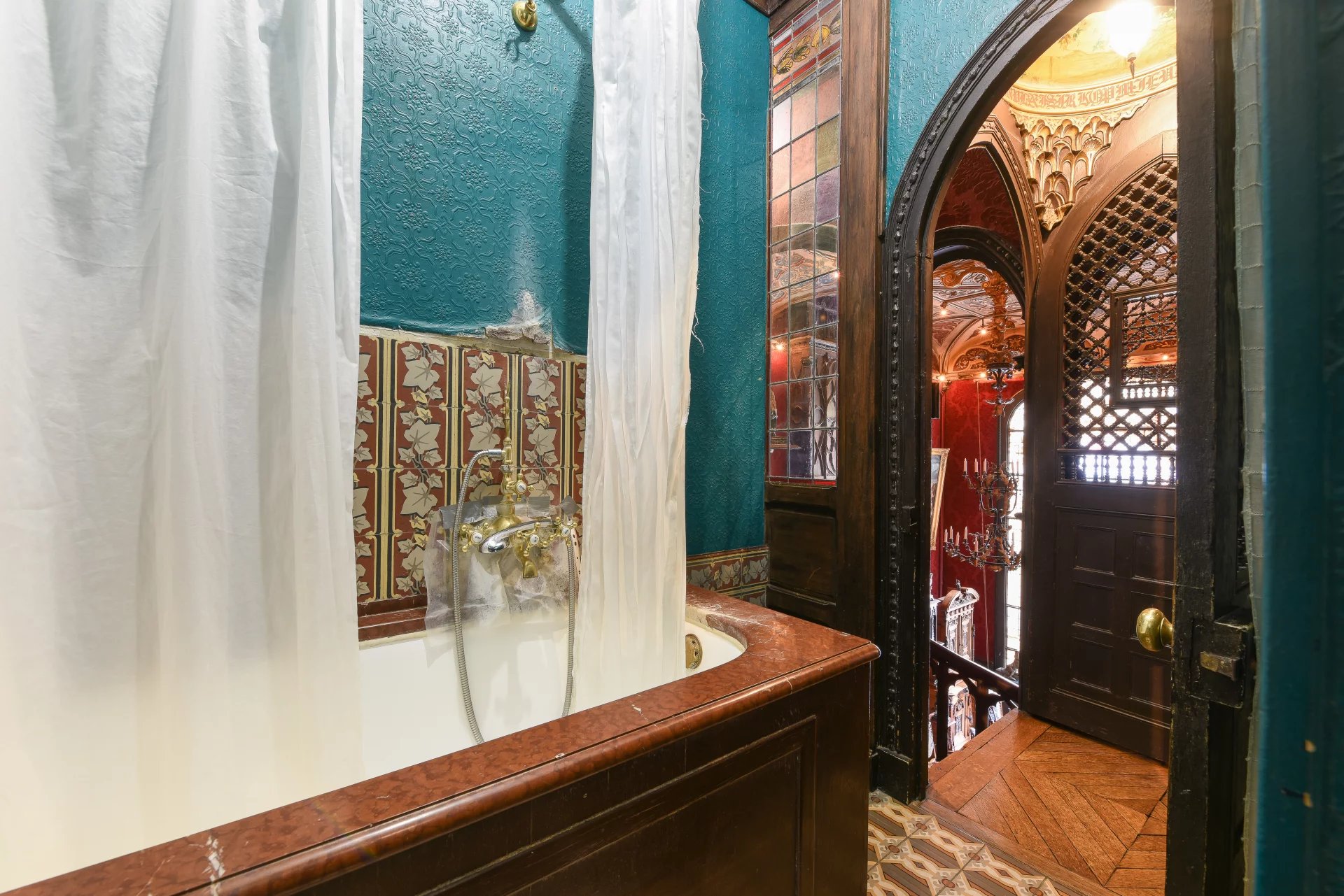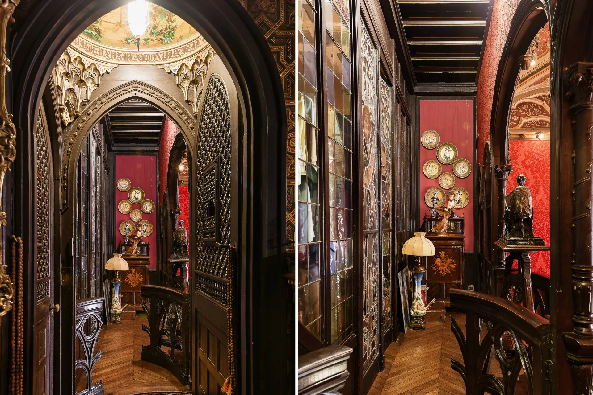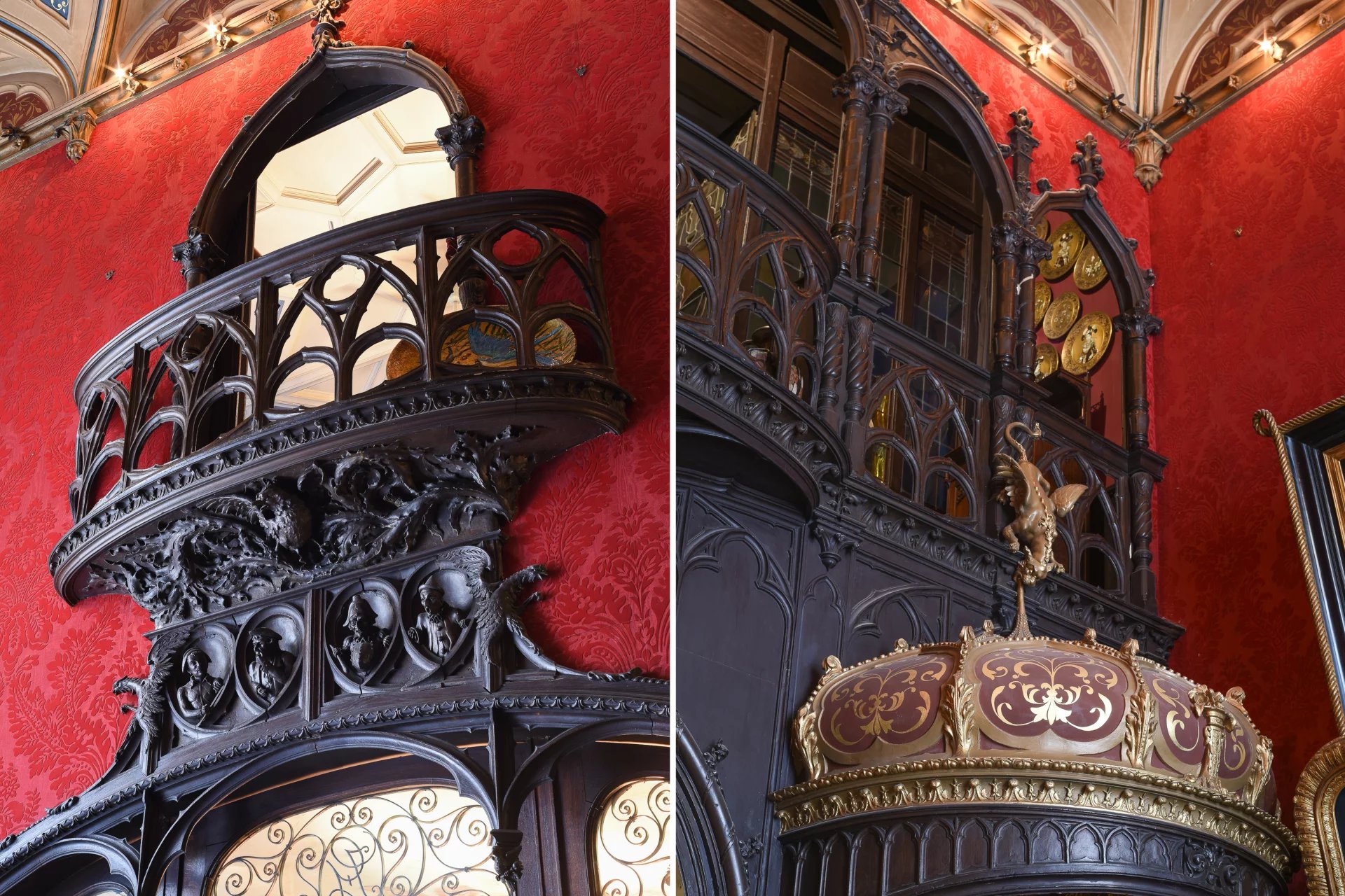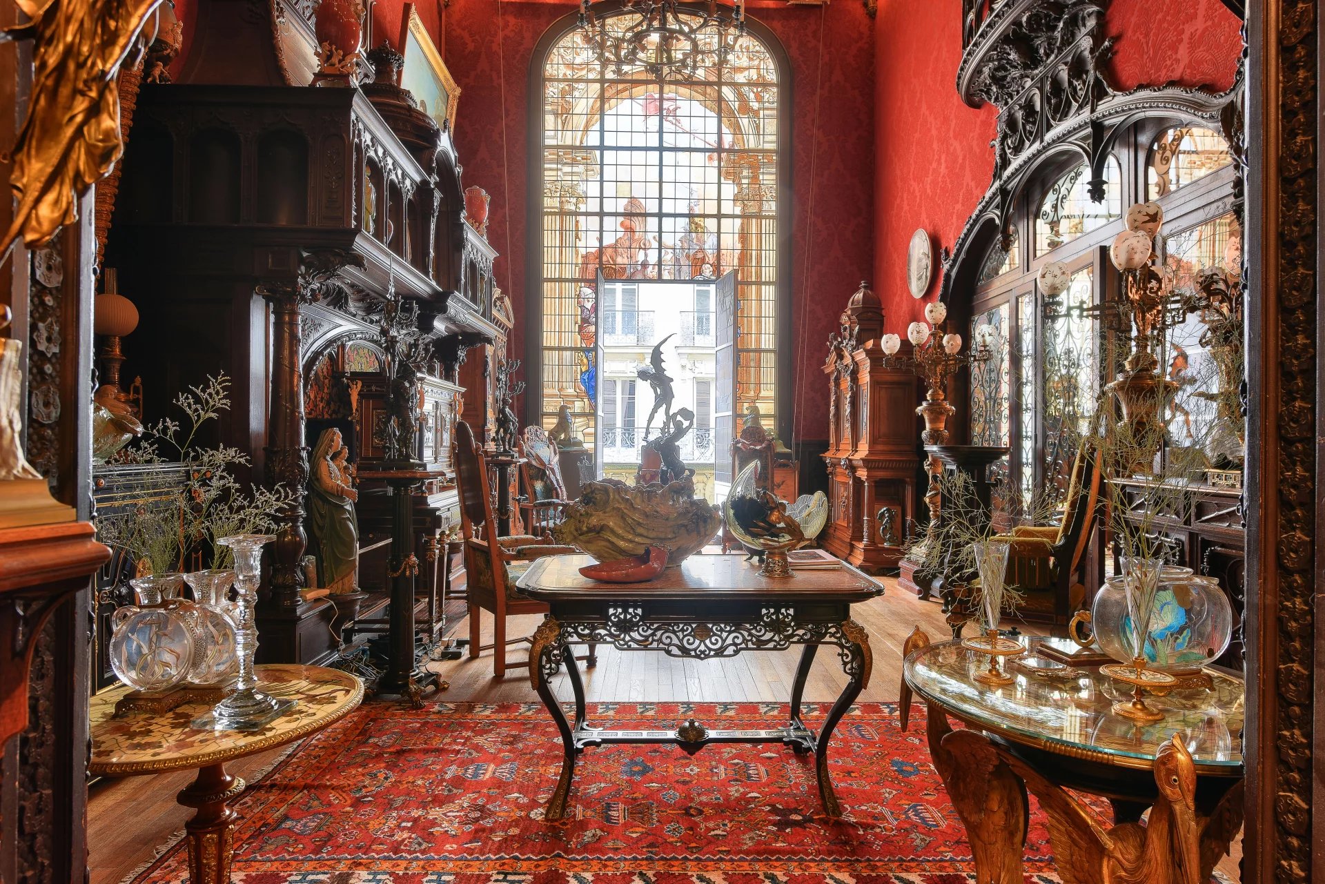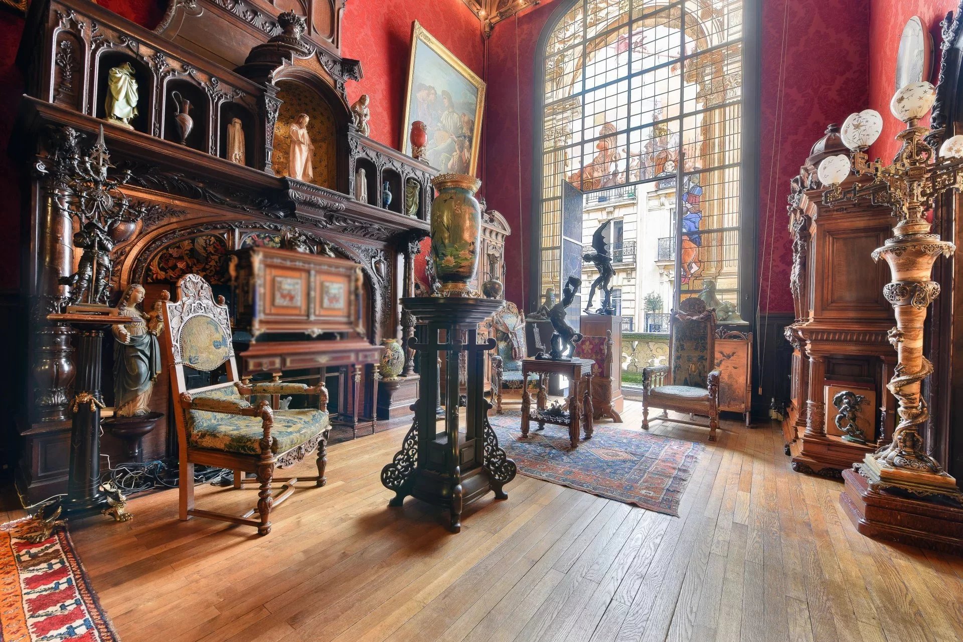 - exceptional drawing room with nearly 8-metre-high ceilings, monumental full-height fireplace and gigantic stained-glass windows
