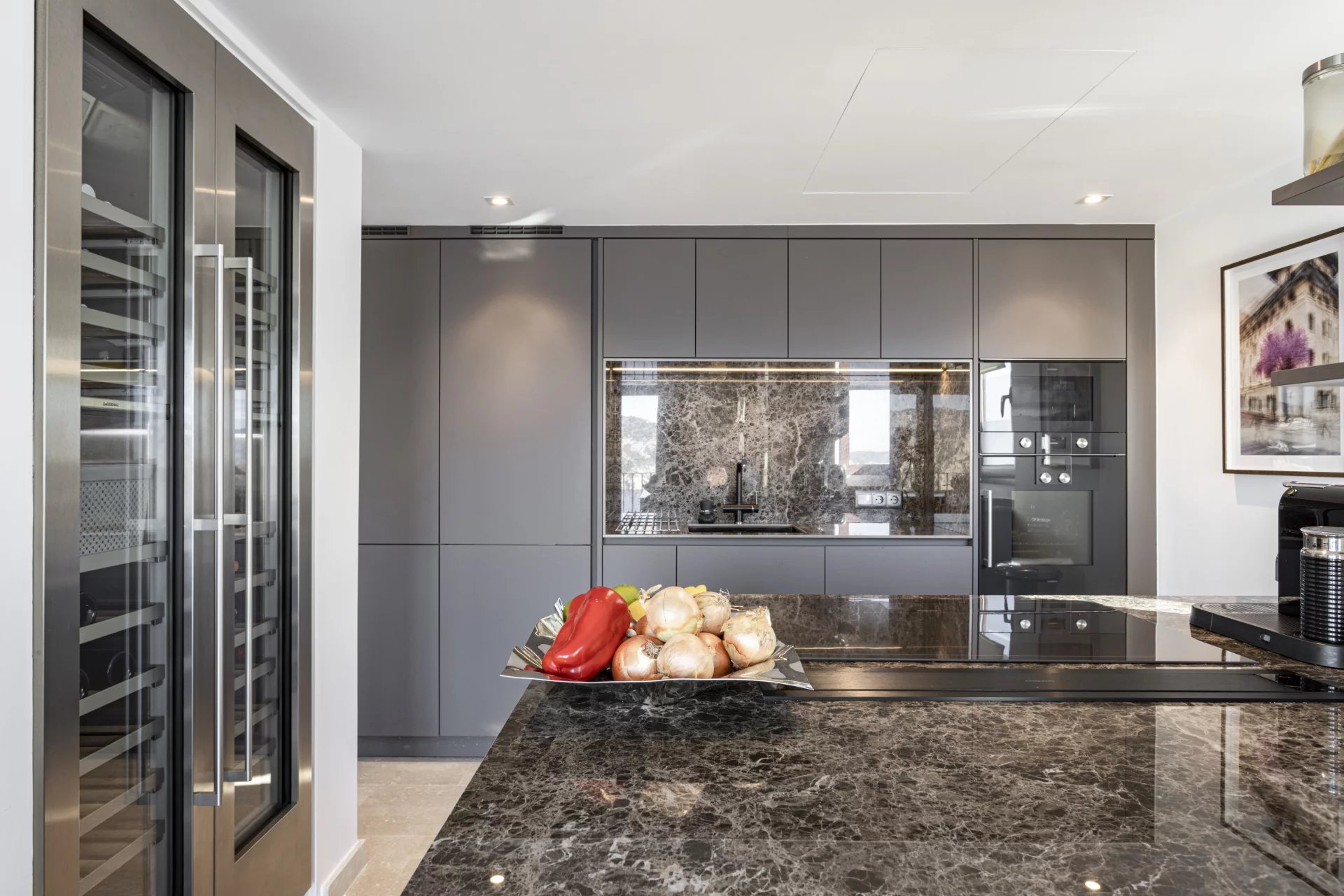 The interior living area has 141 sqm and includes, a lift/entrance hall, a large living/dining area with fireplace, and an open plan kitchen with breakfast island and Gaggenau appliances. The master bedroom is completed with an en-suite bathroom furnished with Duravit appliances. There is also a guest bedroom and a separate bathroom. Both bedrooms offer direct access to the terrace.