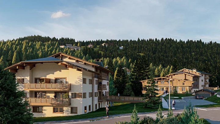 The 1907 new-build development, a piece of paradise in the heart of Val d'Arly. At the gateway to the Espace Diamant and just 4 km from Megève, this new development is ideally located in the centre of the resort of Praz-sur-Arly. Comprising 22 apartments, the development is inspired by traditional Alpine architecture and blends perfectly into this small mountain village. The residence comprises two new buildings on a and two renovated half chalets. The interiors have been designed to optimise space for your well-being and comfort. In an ideal living environment, surrounded by snow-capped peaks and lush green mountain pastures, this new address invites you to contemplate the panorama while enjoying all the amenities of a real Haute-Savoie village on foot. Ski-lovers can easily reach the Crêt du Midi chairlift (600m away) with the free shuttle bus, which stops directly at the foot of the residence.