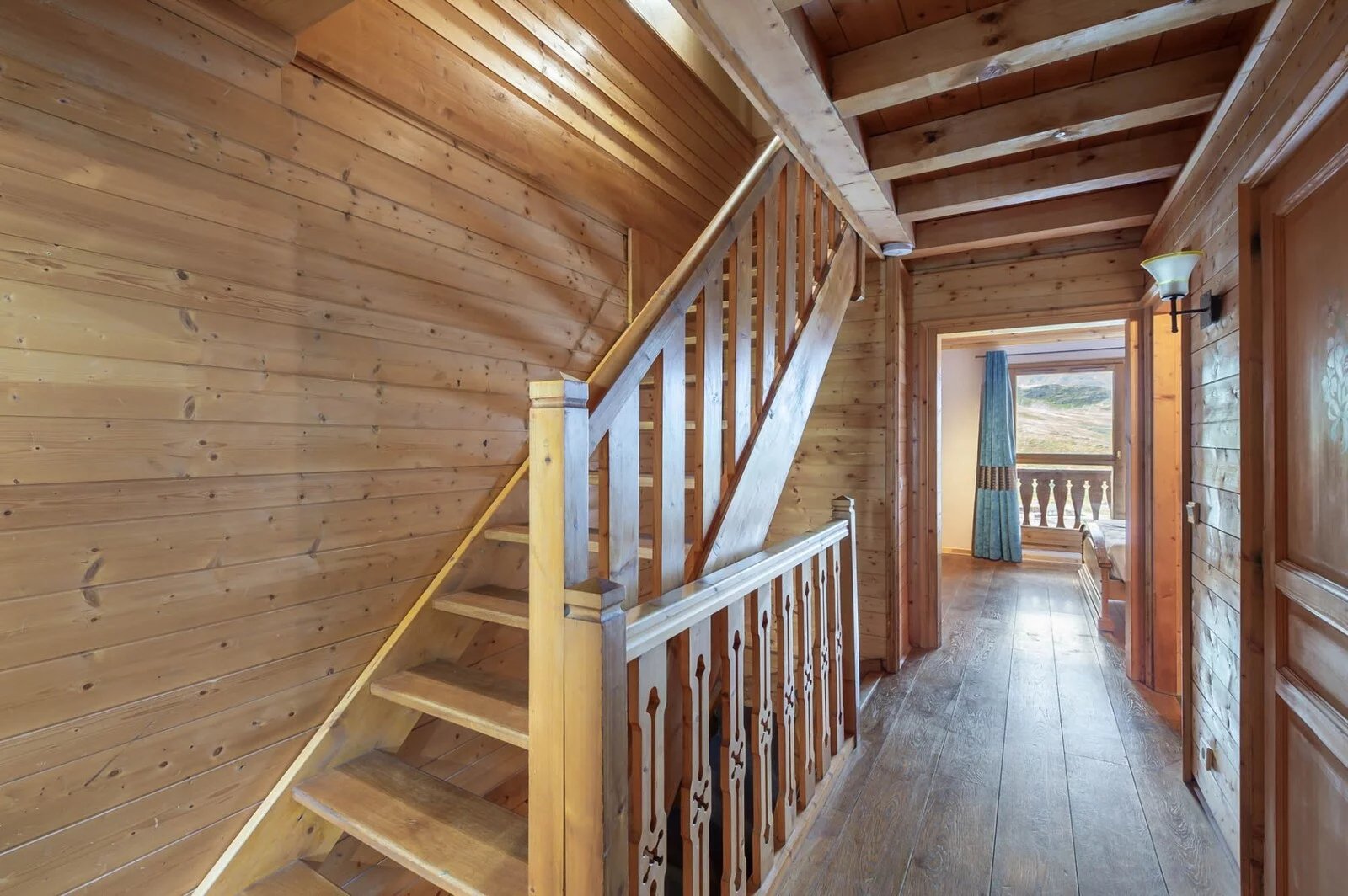 Level 1: a bright living room with a separate, fully-equipped kitchen and WC. The balcony accessible from this level offers panoramic views of the surrounding mountains.