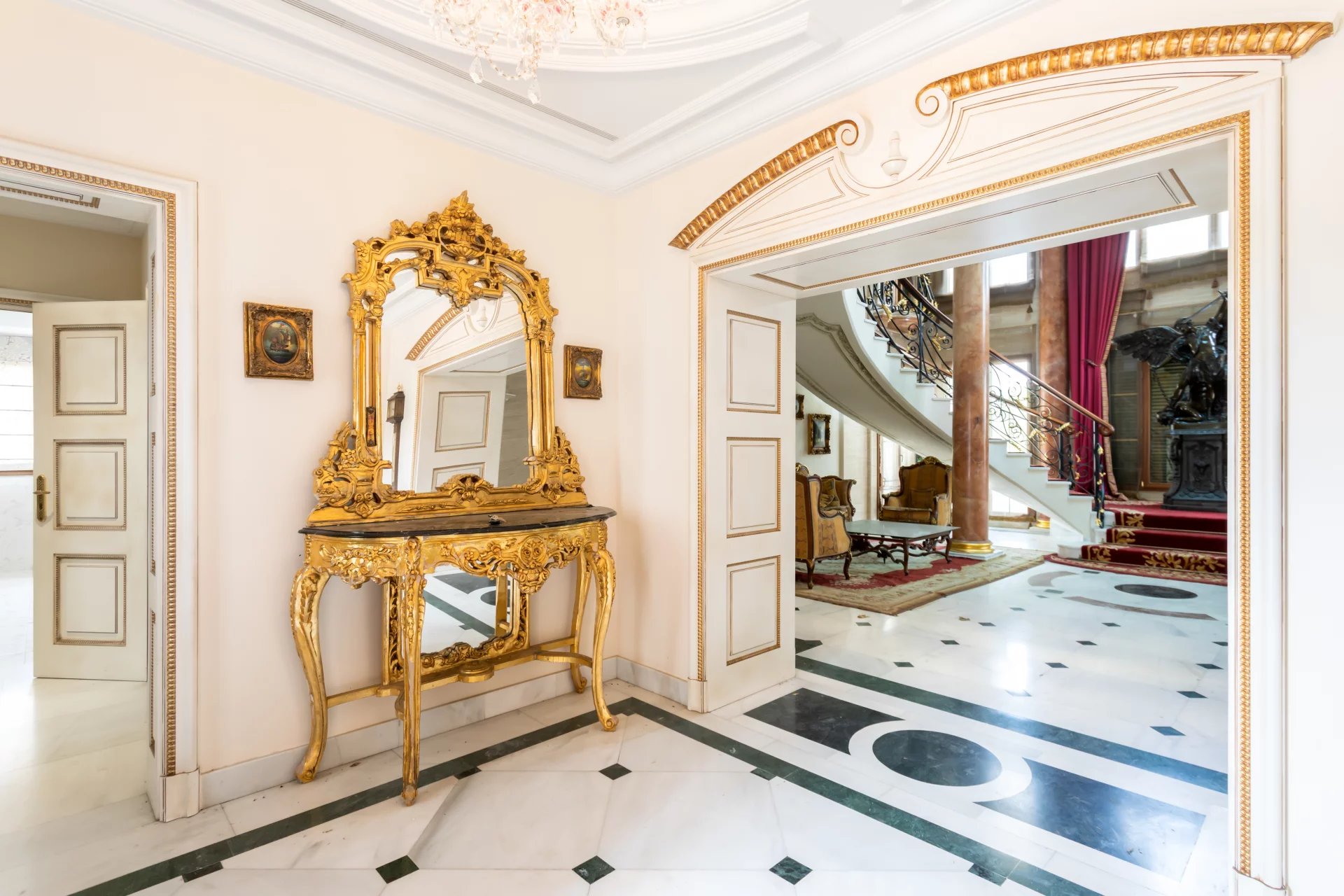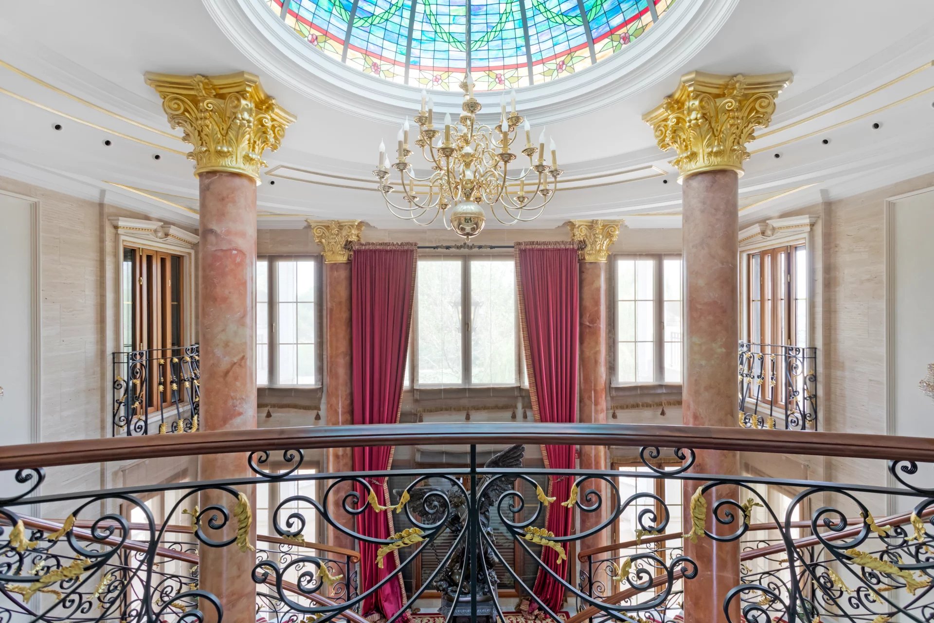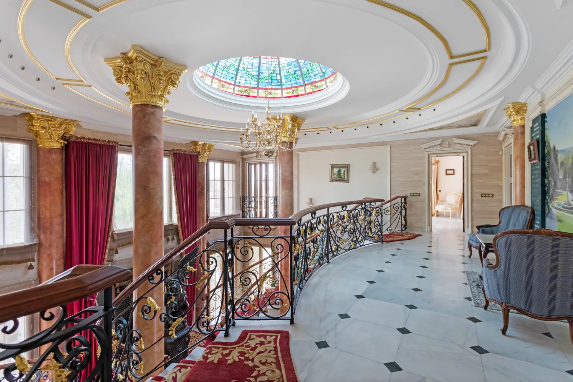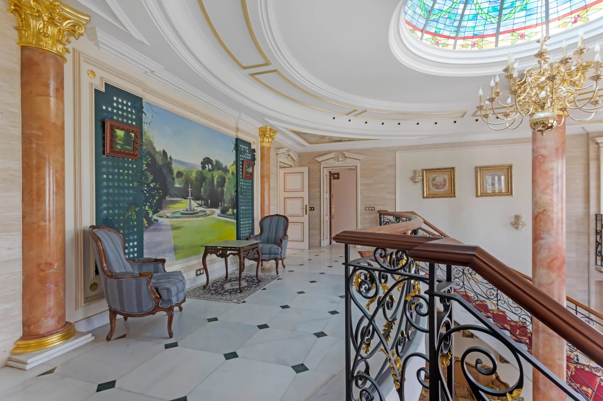 Its qualities, marble, hardwoods, Venetian stuccoes, domes with stained glass windows are carefully worked. The plot is located on the golf course with stunning views.
