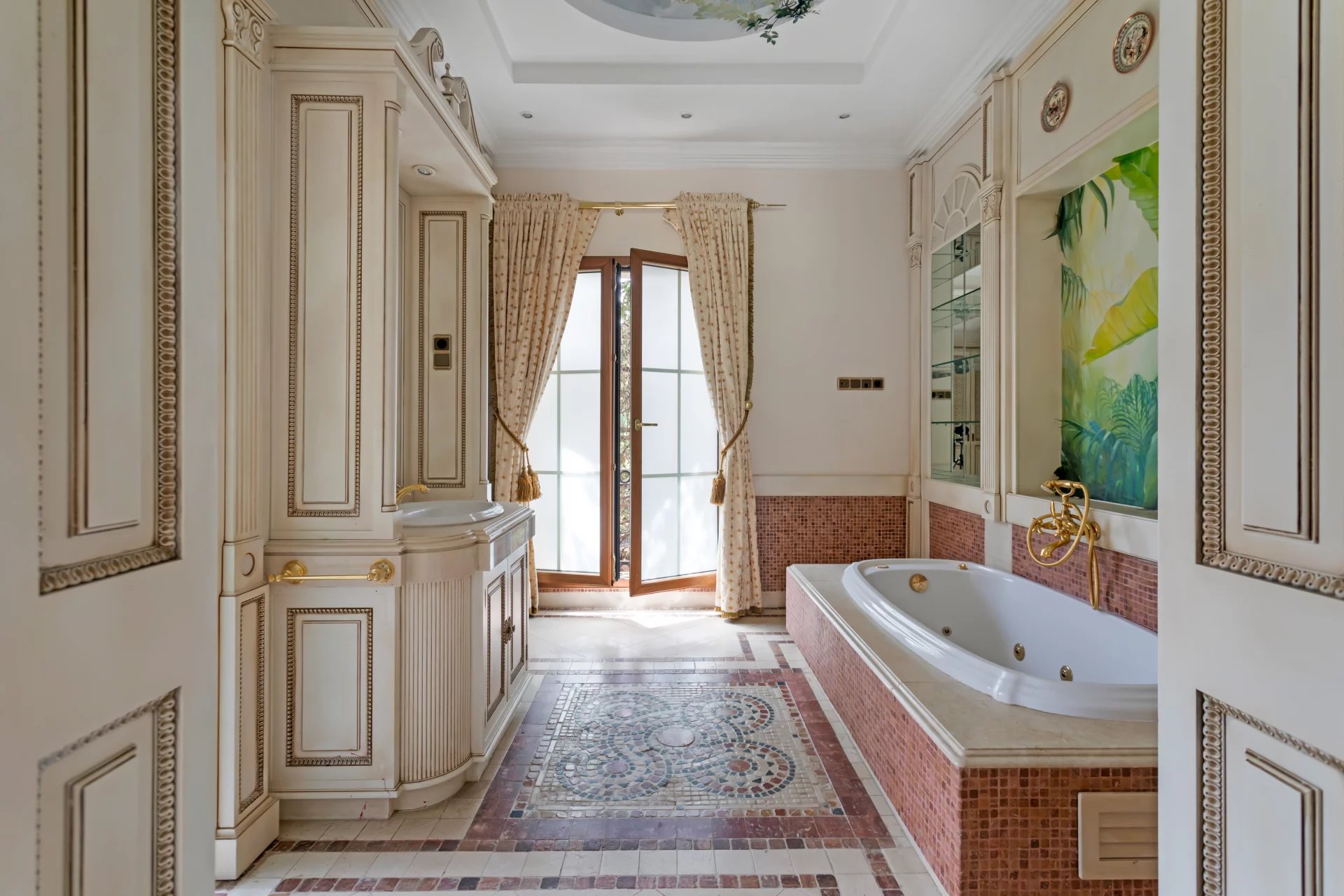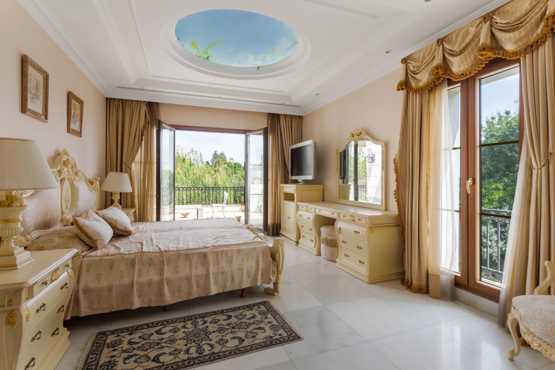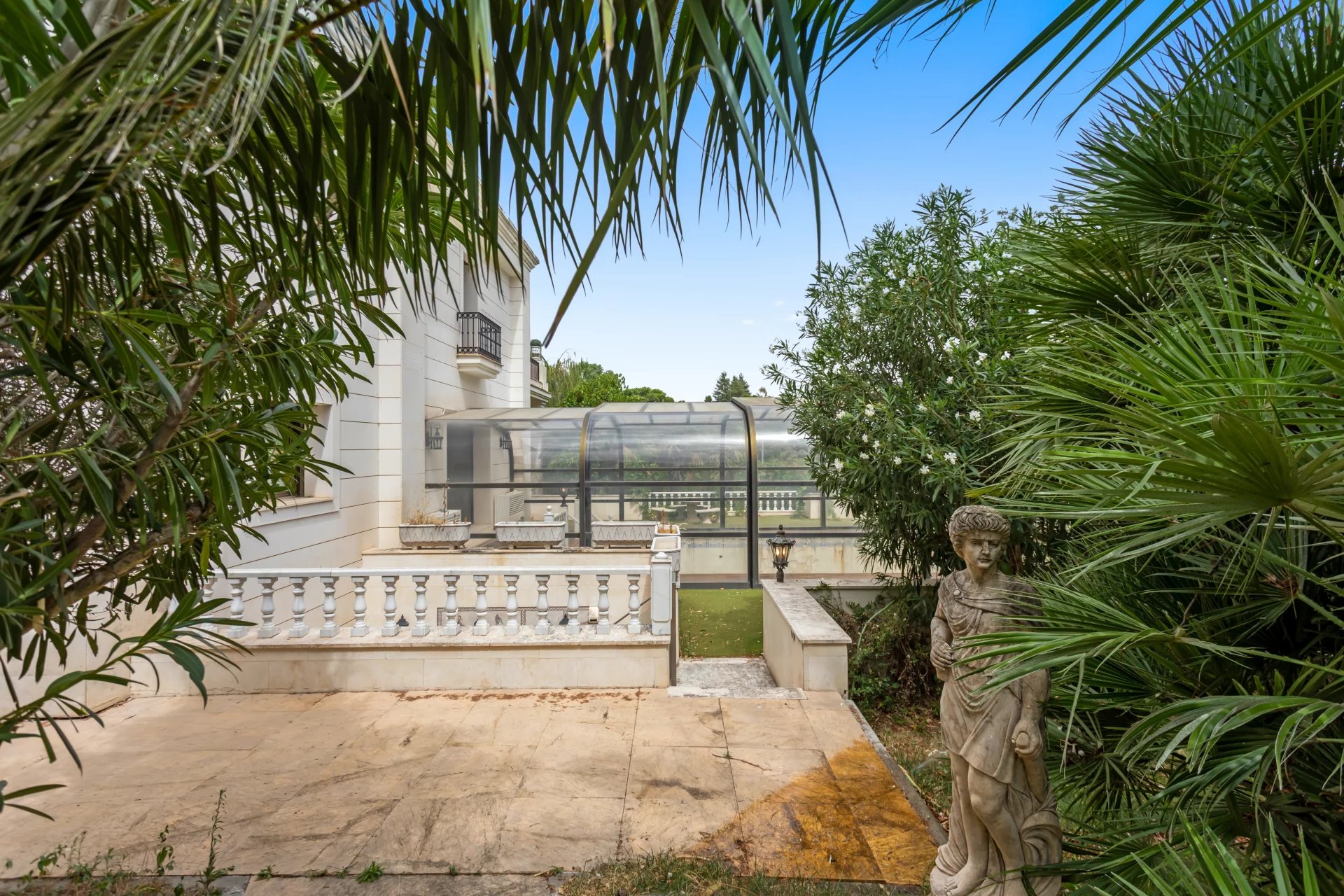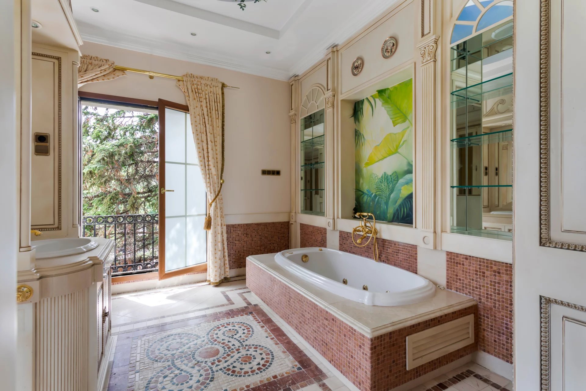 Its qualities, marble, hardwoods, Venetian stuccoes, domes with stained glass windows are carefully worked. The plot is located on the golf course with stunning views.